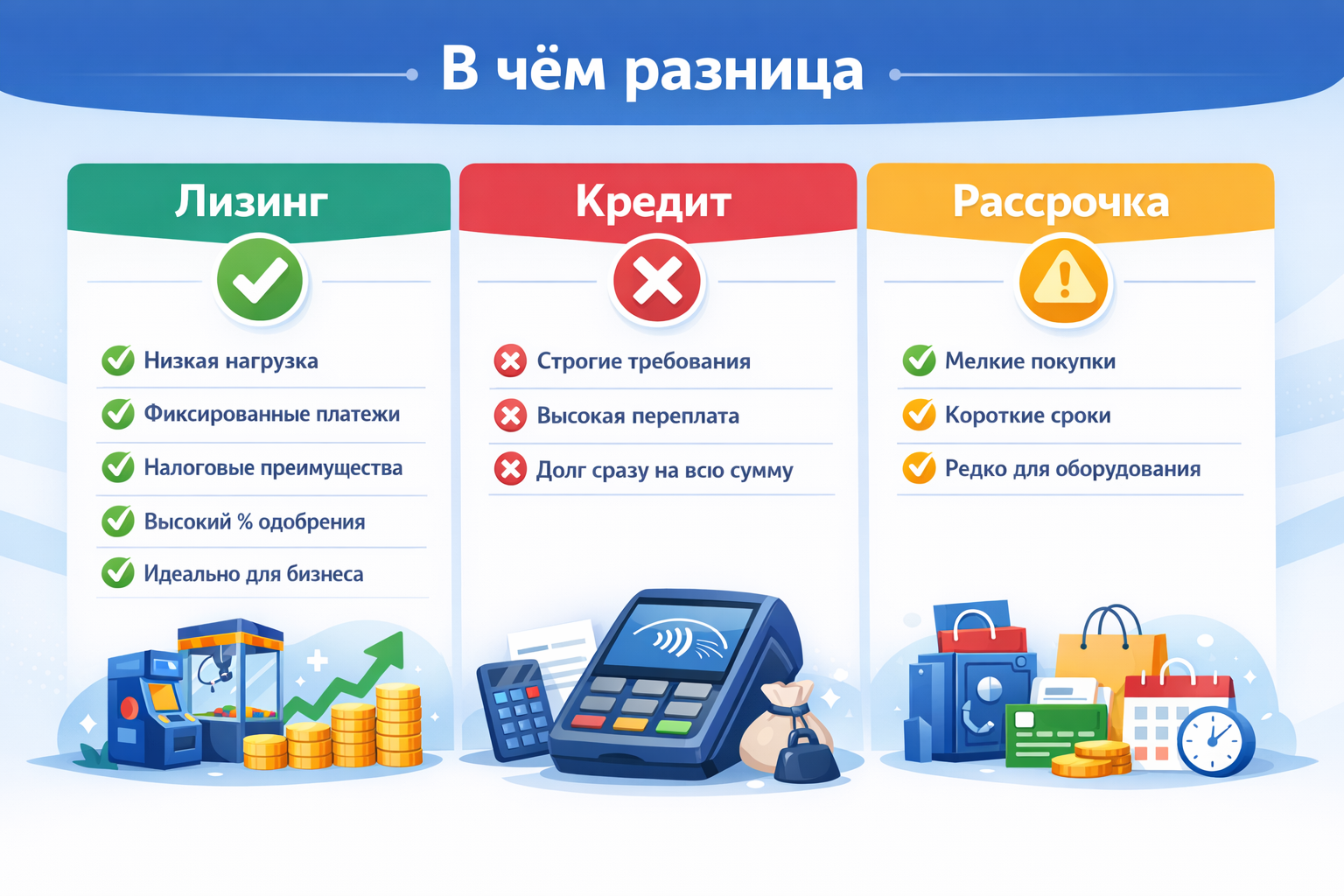 - В отличие от кредита, вы инвестируете в оборудование, которое по завершении договора переходит в вашу собственность.