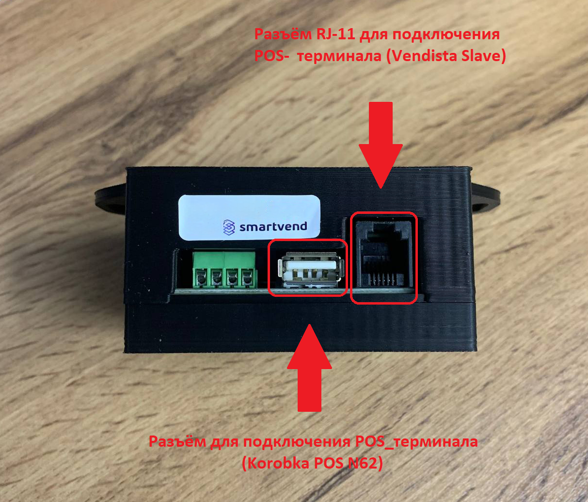 3. В случае если вы используете терминал безналичной оплаты в режиме POS терминала, соедините его кабель с разъёмом USB (например, Korobka N62) или RJ11 (Vendista Slave), в зависимости от того, какой используется разъём на кабеле Вашего терминала;