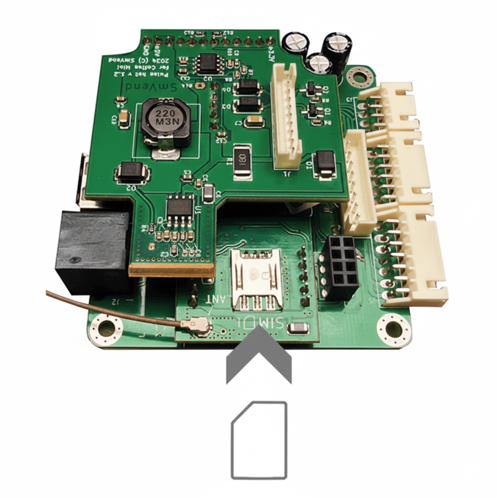 - Извлечь плату, установить сим карту в слот (с обратной стороны платы), как показано на рисунке ниже. Внимание! Плата соединена проводом с разъёмом антенны на корпусе, соблюдайте осторожность, не повредите его!