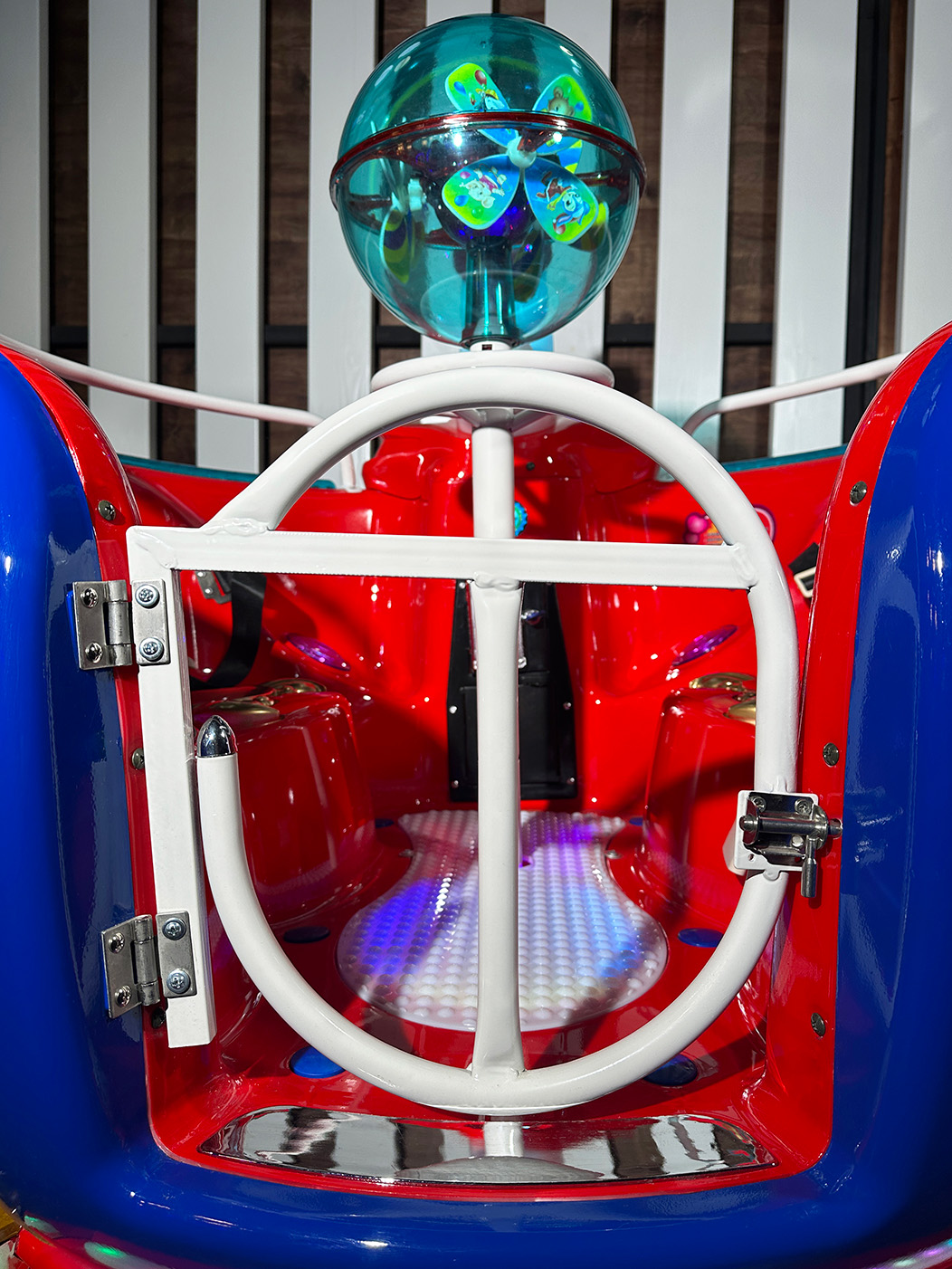 Очень красивая, украшенная яркой разноцветной подсветкой карусель. Имеет два посадочных места, что позволяет кататься сразу даже двум детям. Есть счетчик принятых монет, позволяющий отслеживать доходность карусели и встроенный мп3 плеер с помощью которого можно во время работы карусели воспроизводить музыку с флэшкарты. Так же, можно настраивать количество монет или жетонов необходимых для старта и устанавливать время работы карусели.
