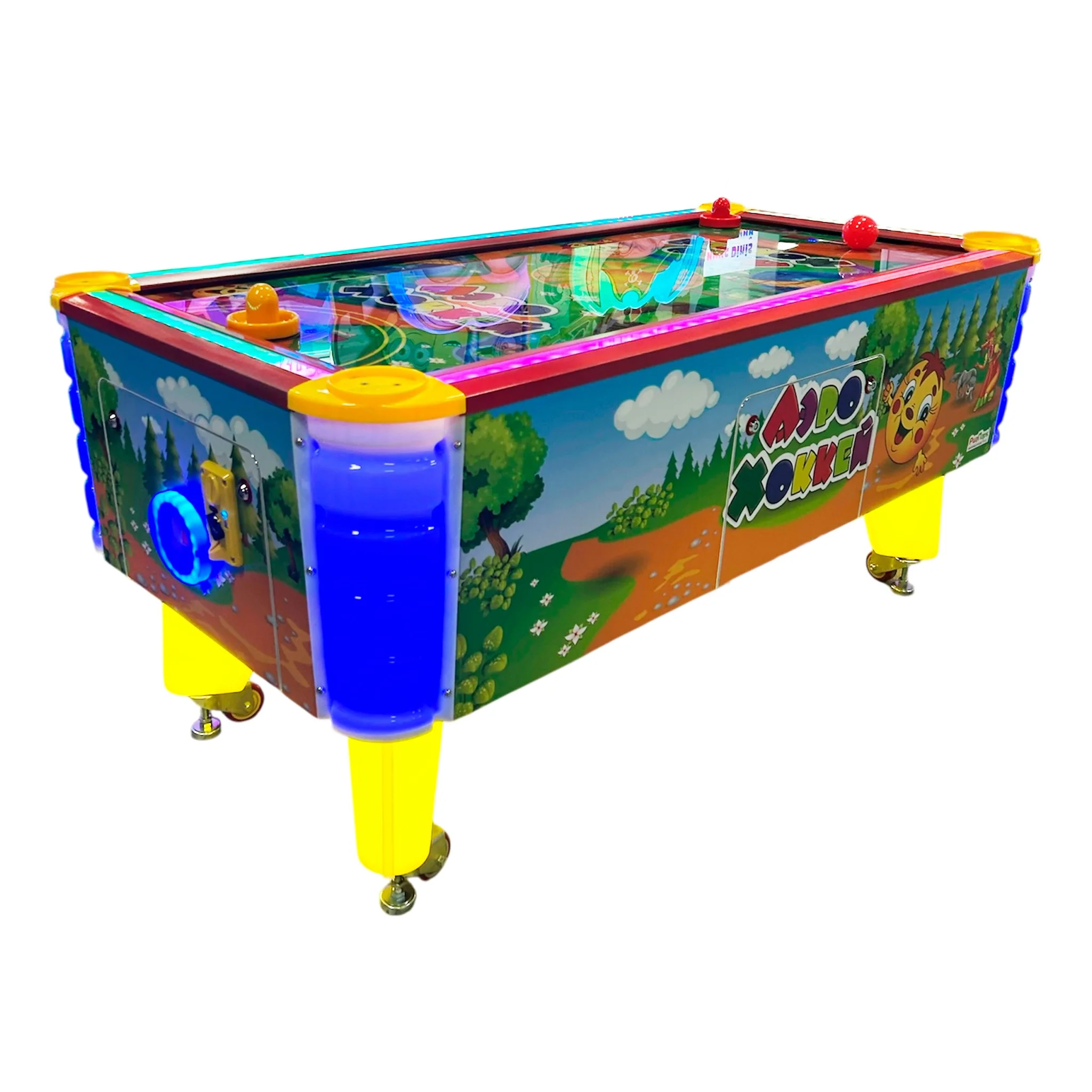 Яркий и стильный аэрохоккей «Колобок» станет главным украшением любой игровой зоны! Его дизайн сочетает яркие цвета и нейтральную тематику, благодаря чему он идеально впишется как в домашний интерьер, так и в детские комнаты, кафе или развлекательные центры.