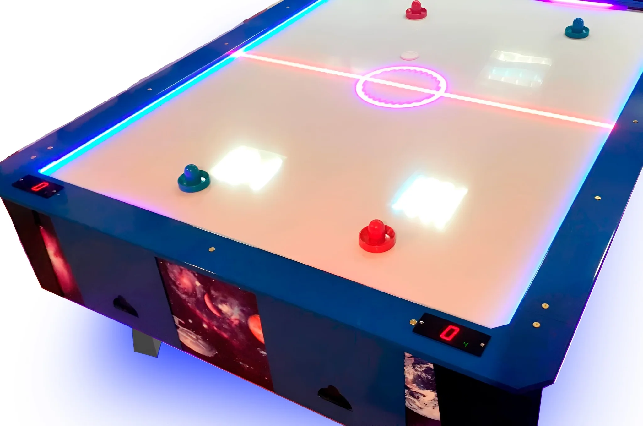 В этой модели есть 4 дисплея со счетчиками голов и оплаченных игр, которые вмонтированы в борт перед каждым игроком. Это позволило максимально снизить стоимость автомата за счет отсутствия лампы над полем.