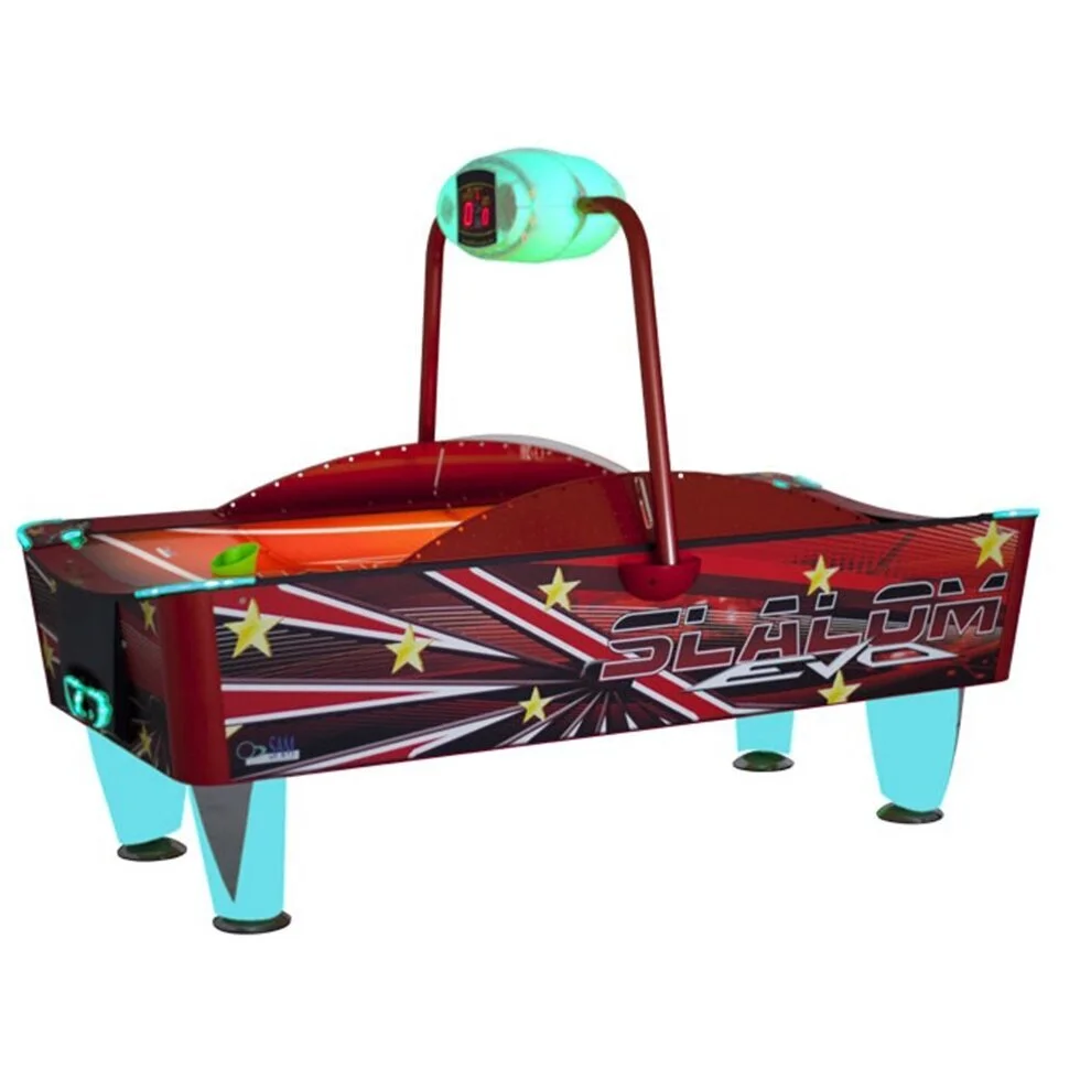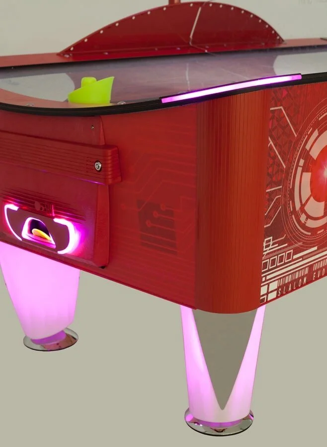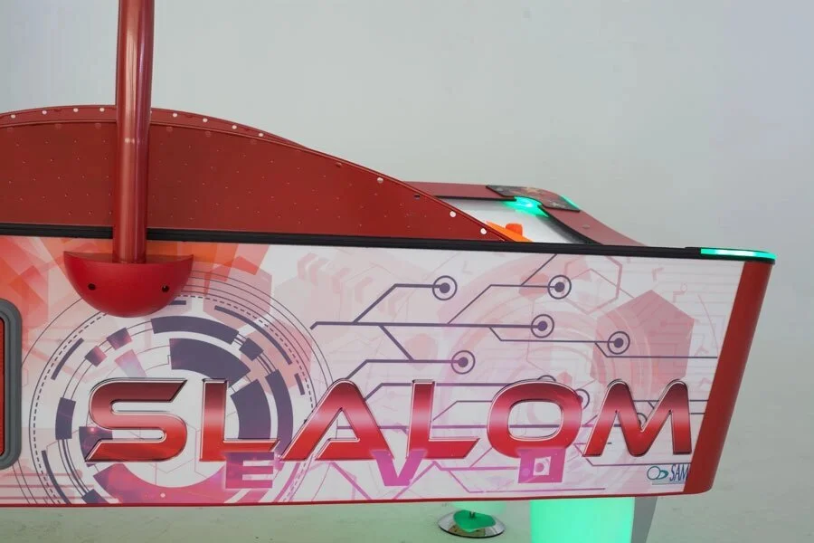 Аэрохоккей Slalom Evo – продолжение новой серии аэрохоккеев компании SAM Billiards с вынесенными воротами, имеет оригинальный современный дизайн и оснащен надежным жетоноприемным механизмом. Над игровым полем установлен счетчик очков, на дисплее которого отображаются забитые голы, счет, кредиты и предупреждения. Игровое поле с грязе-устойчивым покрытием из метакрилата.