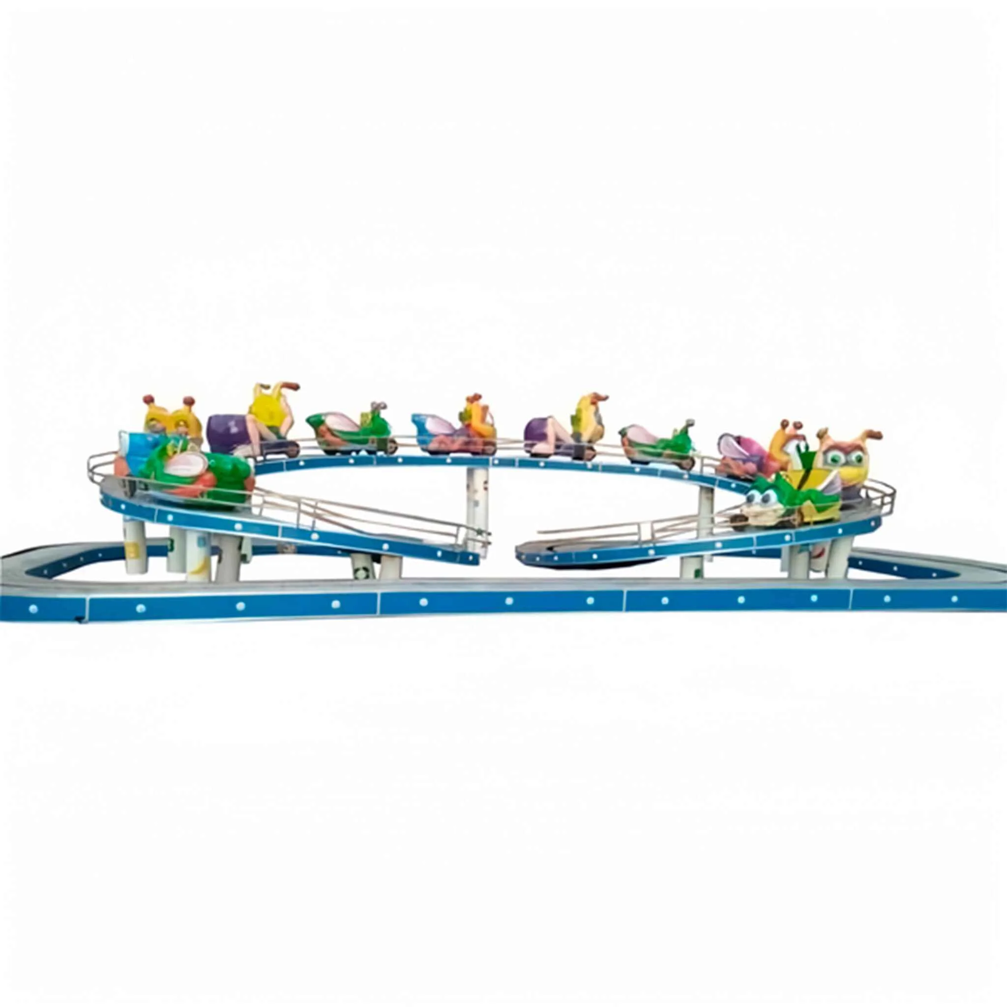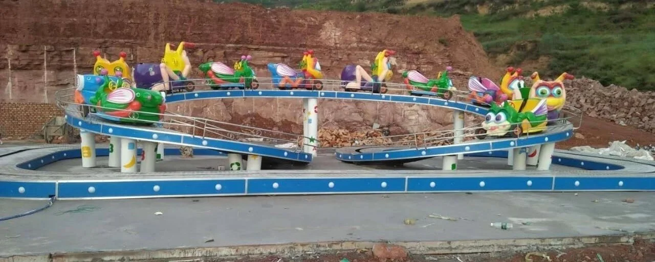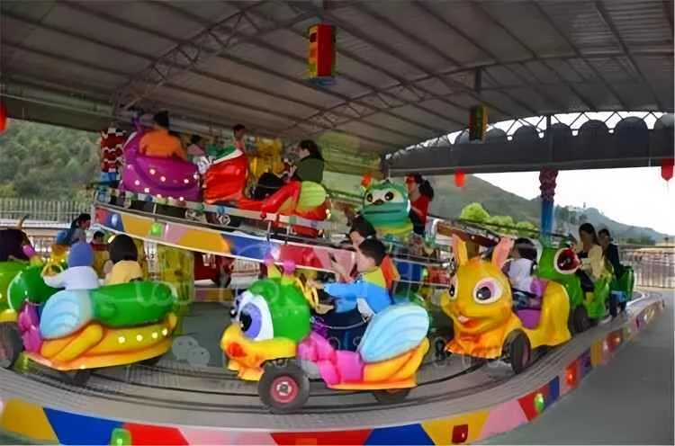 Поезд на 24 места, 12 вагонов по 2 места, движение аттракциона осуществляется по рельсам с подъёмом на высоту до 1.4 метра.