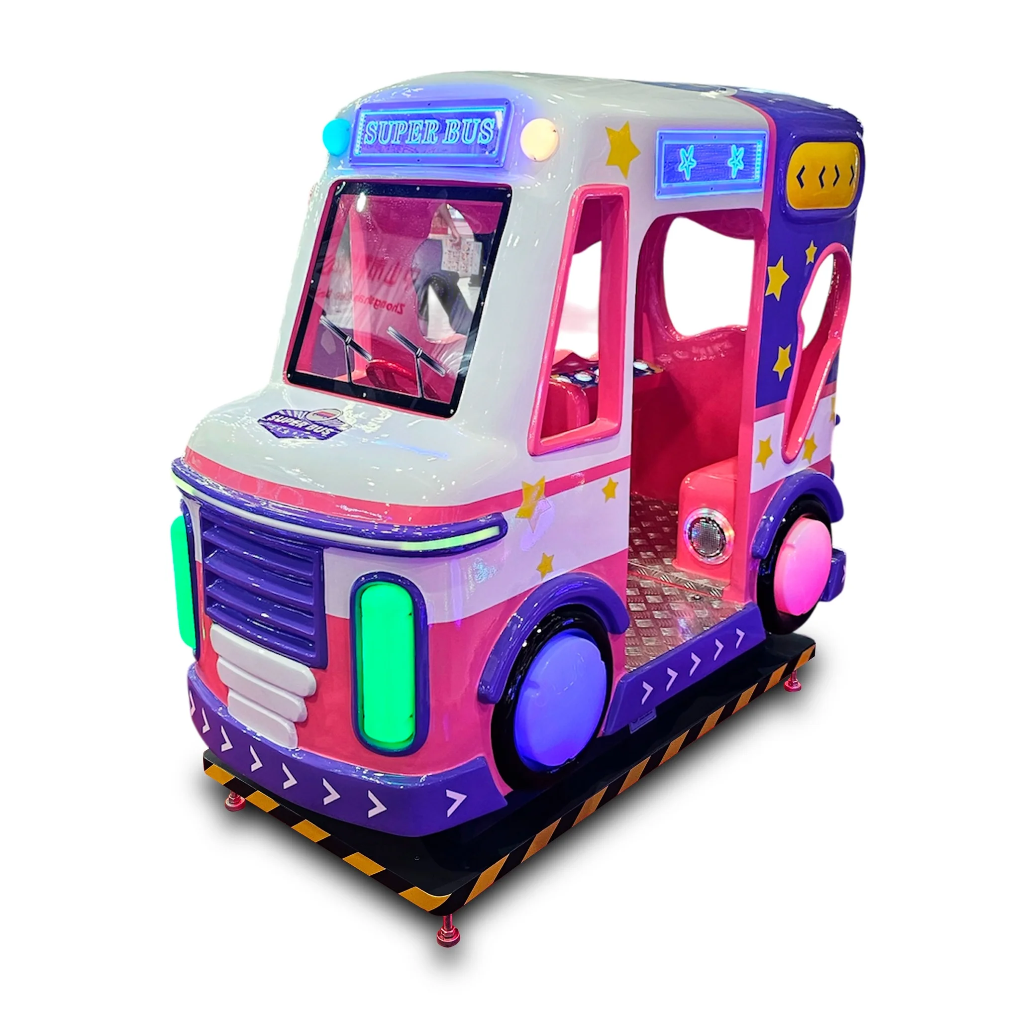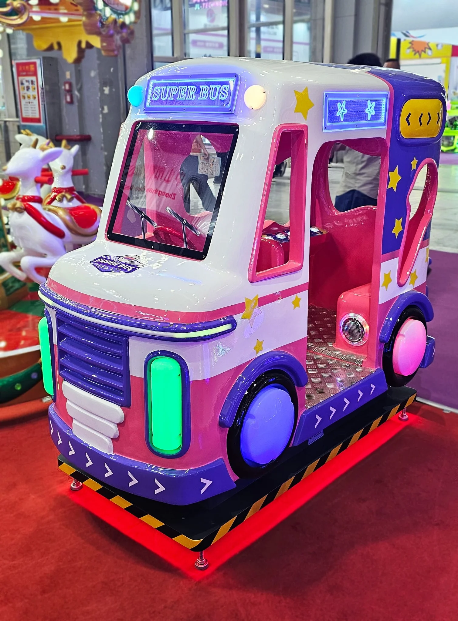 - Дизайн: аттракцион выполнен в виде автобуса, который привлекает внимание детей. Яркие и насыщенные цвета, создающие атмосферу радости и волшебства;