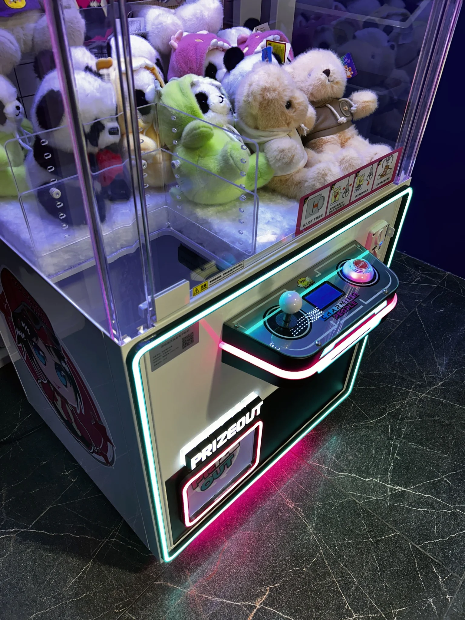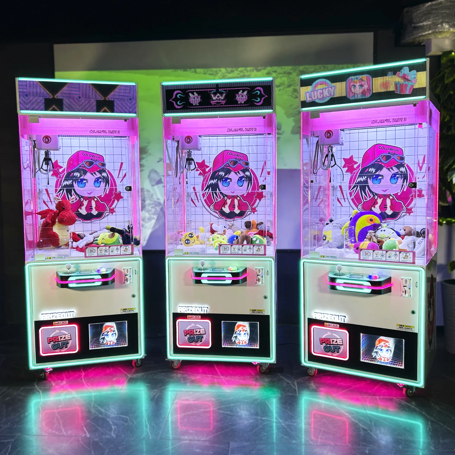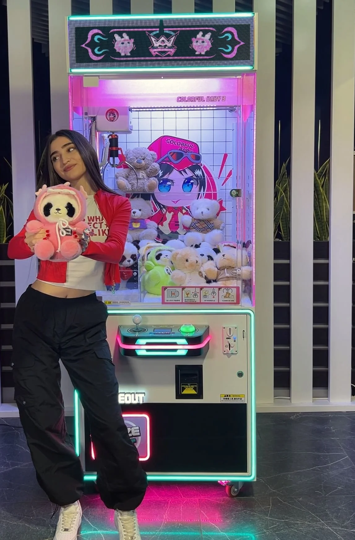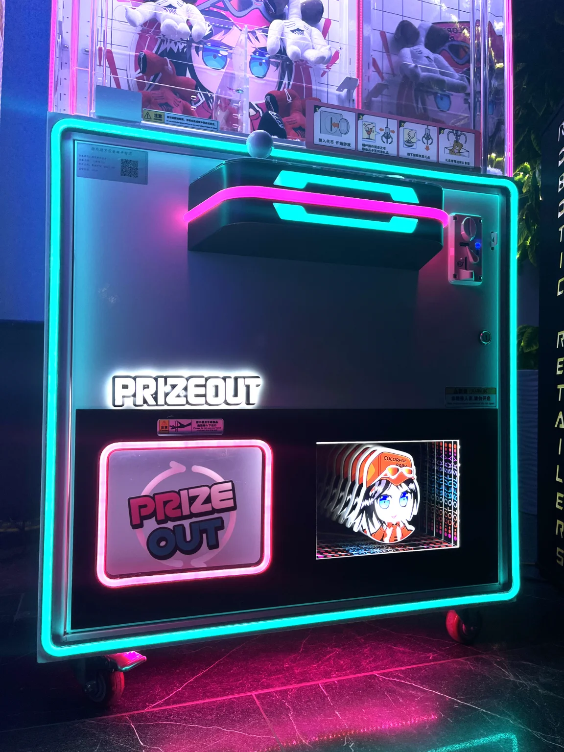 - Яркий экран: На вершине автомата установлен яркий и красочный экран, который привлекает внимание посетителей и создает атмосферу неонового приключения.