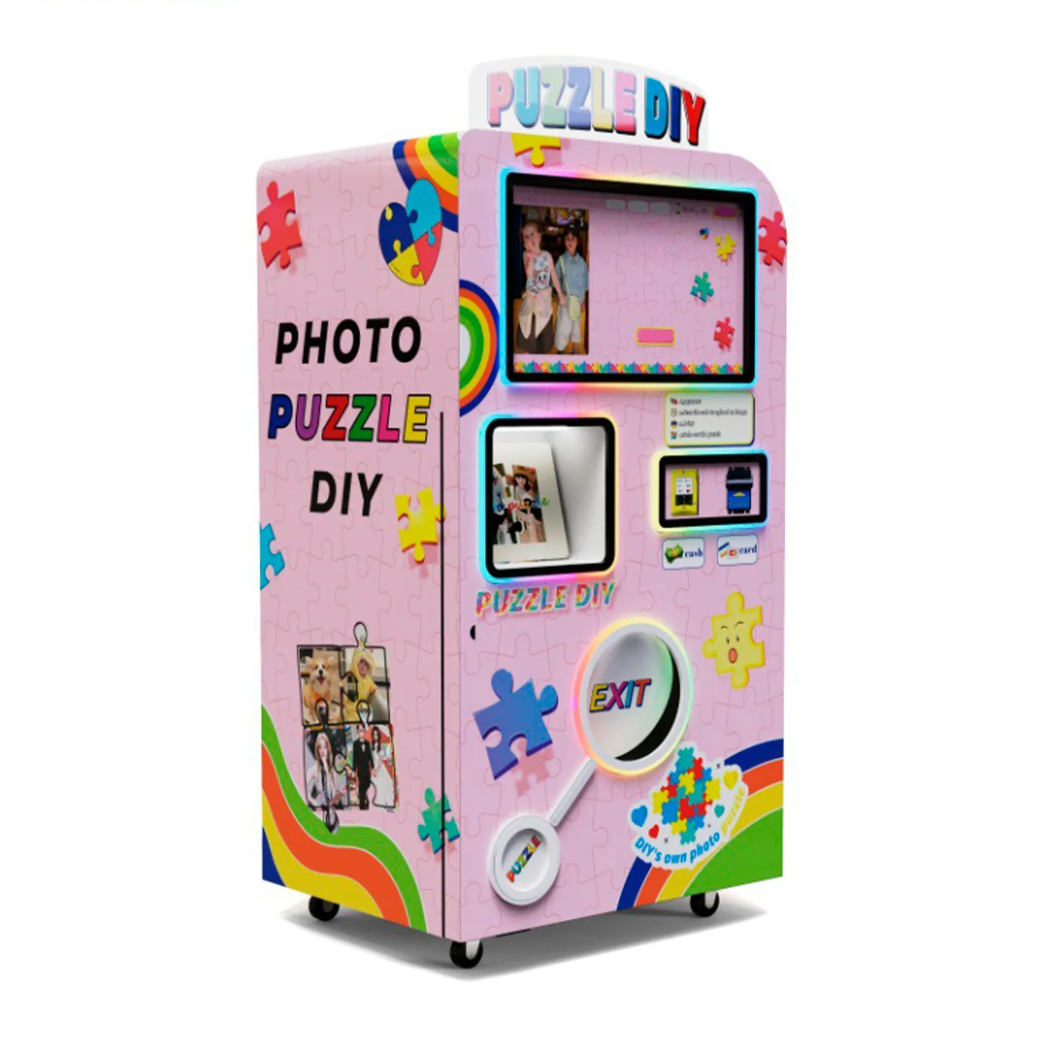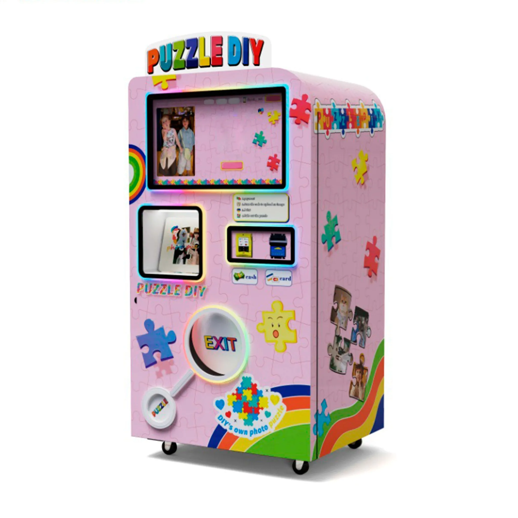 Представляем вашему вниманию вендинговый автомат для создания Фото-Пазлов «Puzzle diy» - инновационное решение для создания персонализированных пазлов из фотографии! Этот автомат позволяет клиентам загрузить свое фото, выбрать дизайн и получить готовый пазл всего за несколько минут. Яркий дизайн с неоновой подсветкой, стильными элементами в виде пазлов делает его заметным в любой локации. Удобный интерфейс и поддержка различных способов оплаты делают процесс покупки простым и увлекательным. Установите этот автомат и предложите своим клиентам уникальный сувенир, который они смогут собрать и сохранить на память!