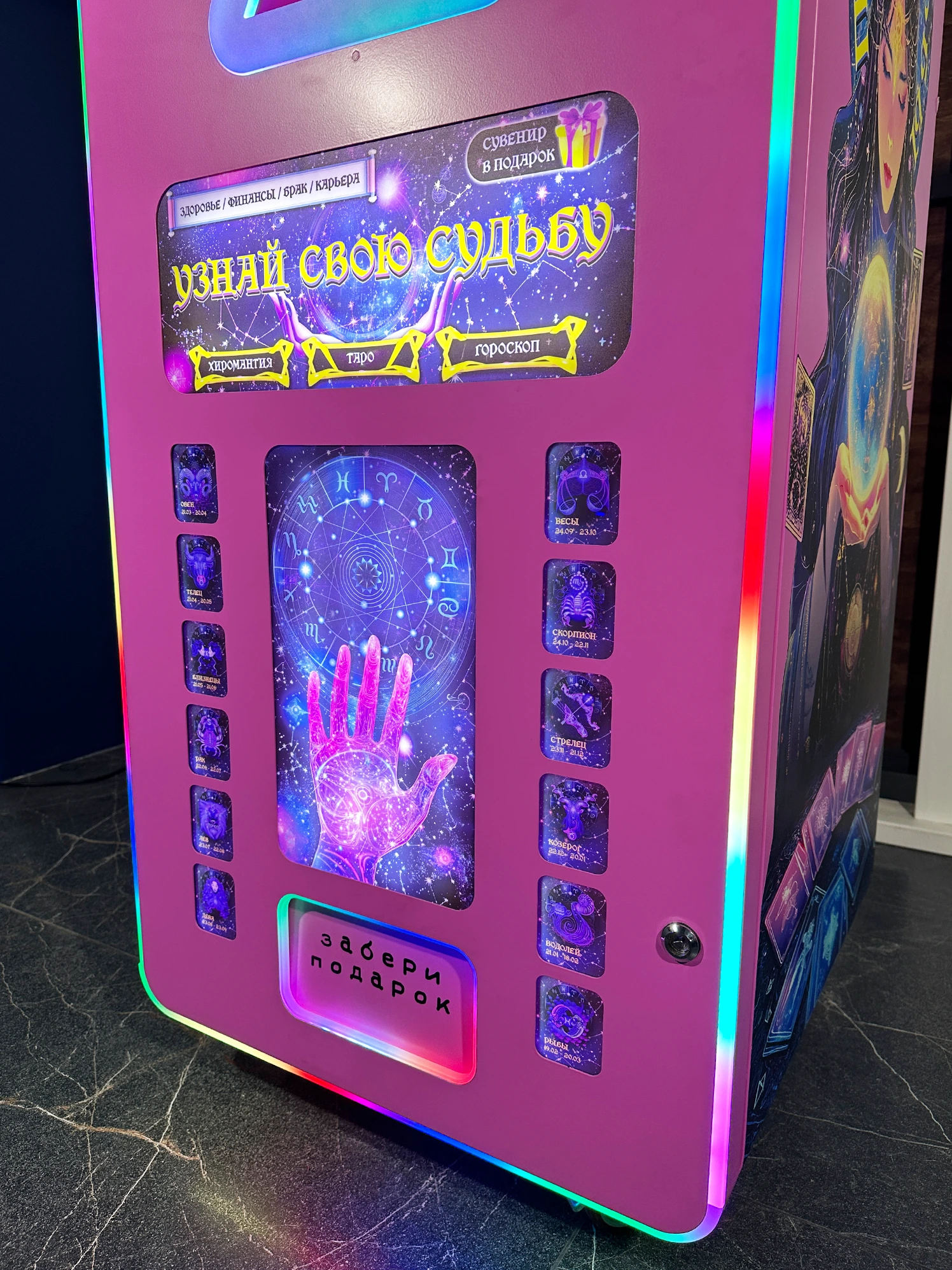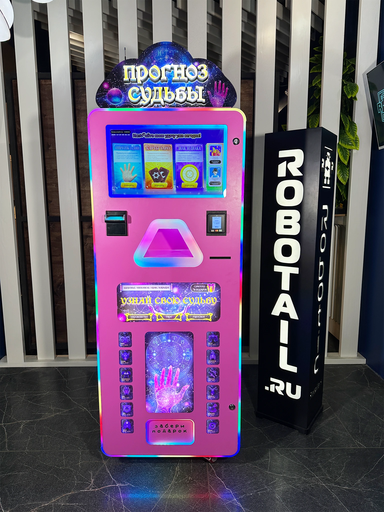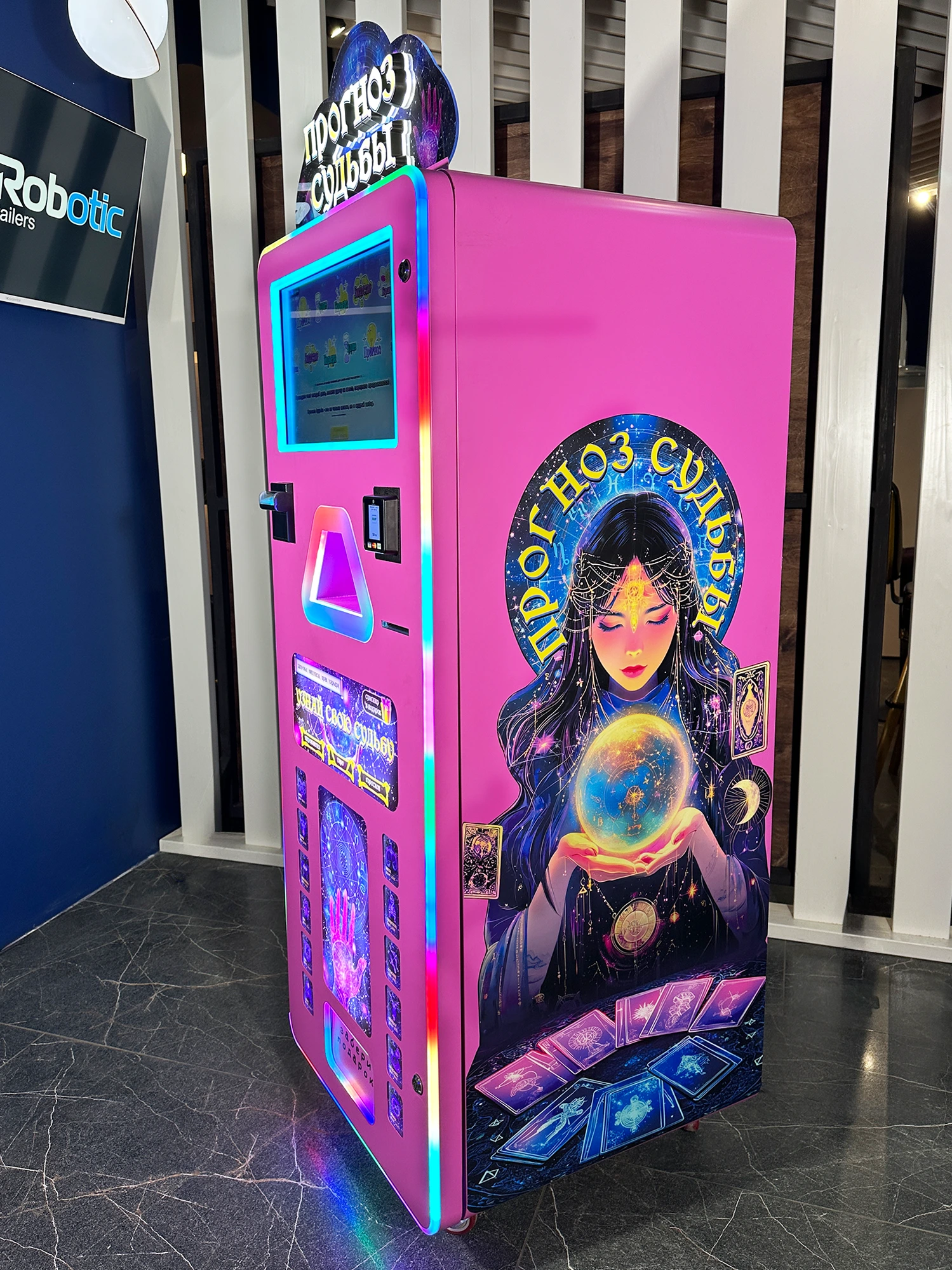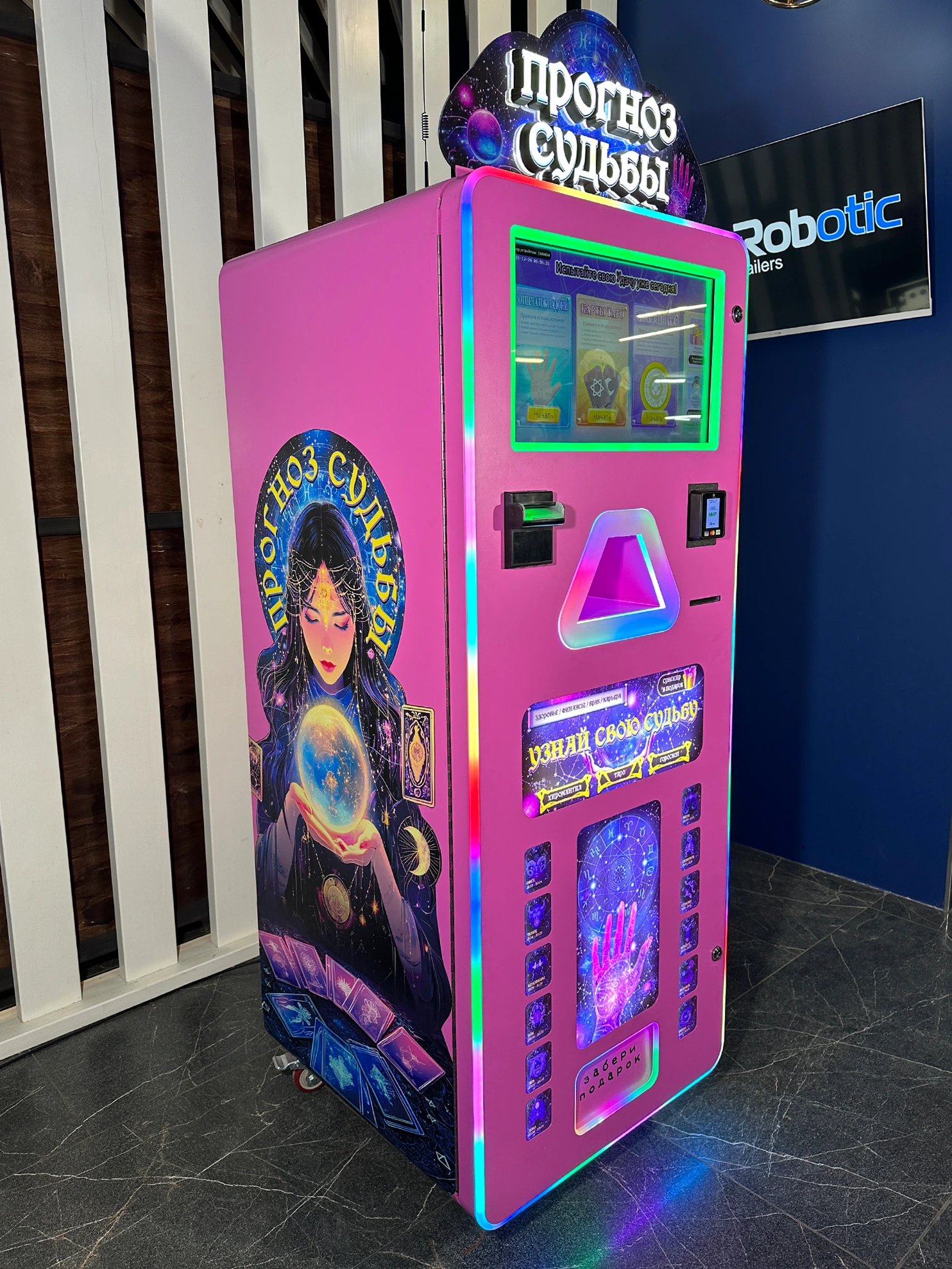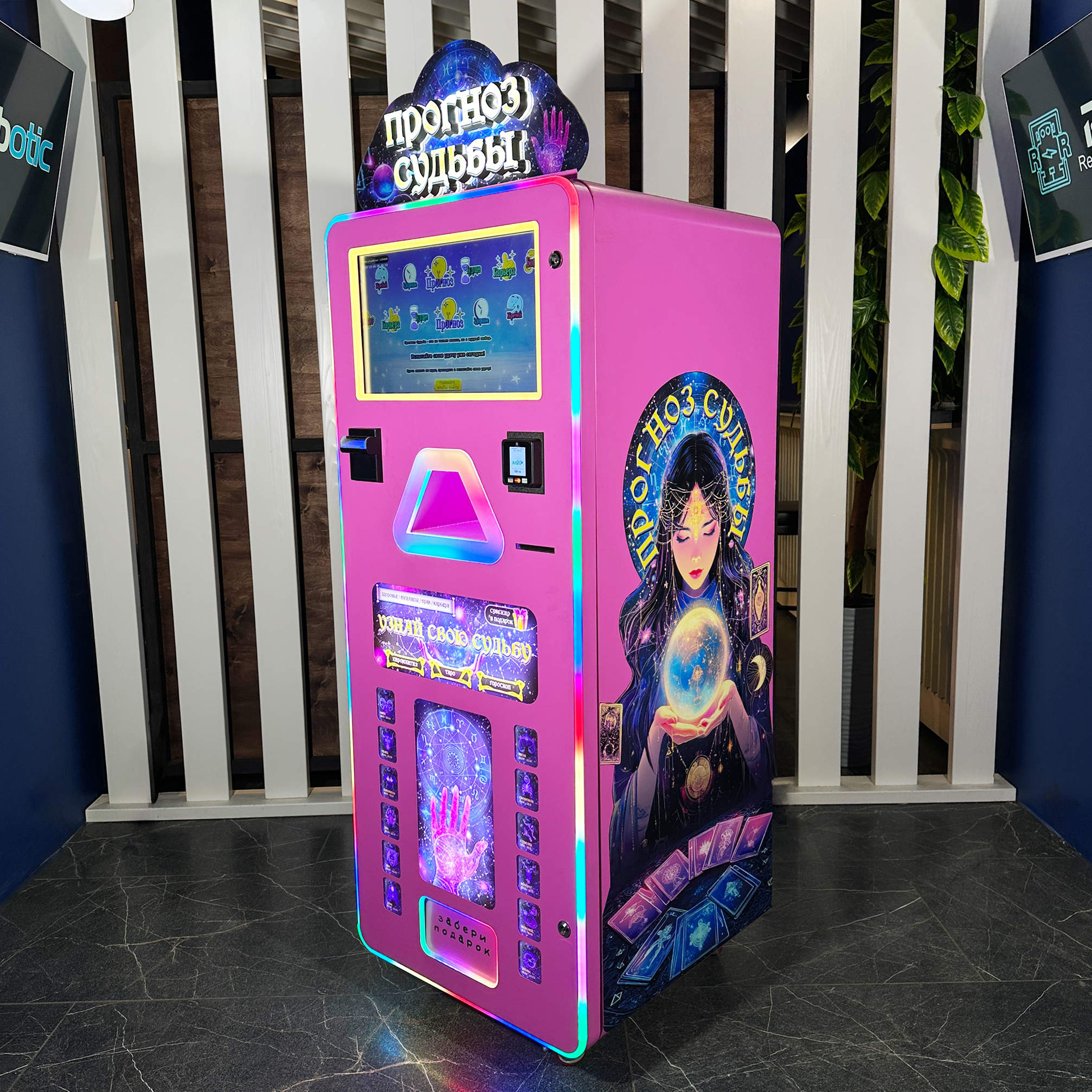 Автомат мгновенно привлекает внимание за счёт эффектного дизайна, подсветки и мистической тематики. Интерфейс полностью на русском языке, понятен с первого касания — пользователь получает позитивное предсказание, а владелец — стабильную выручку.
