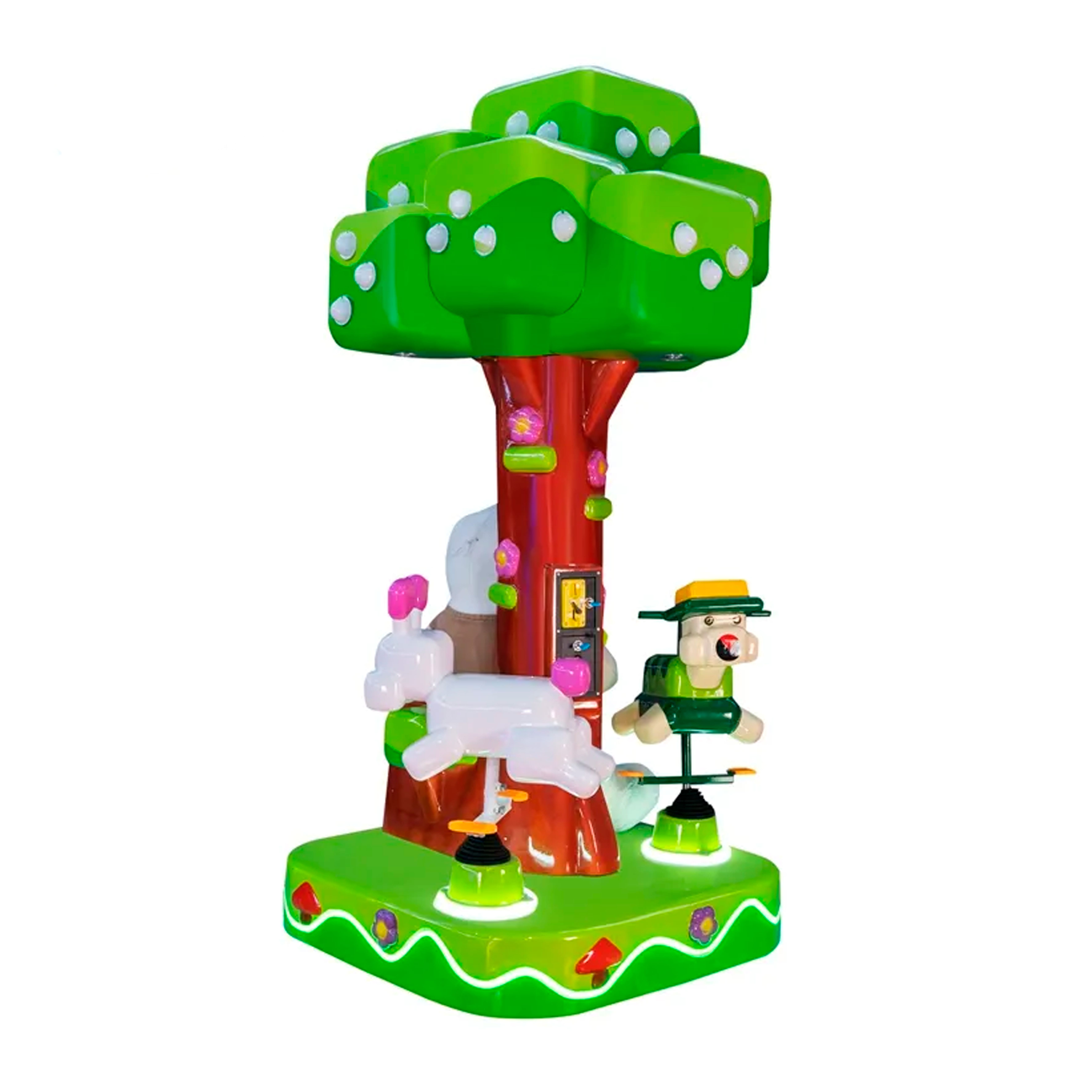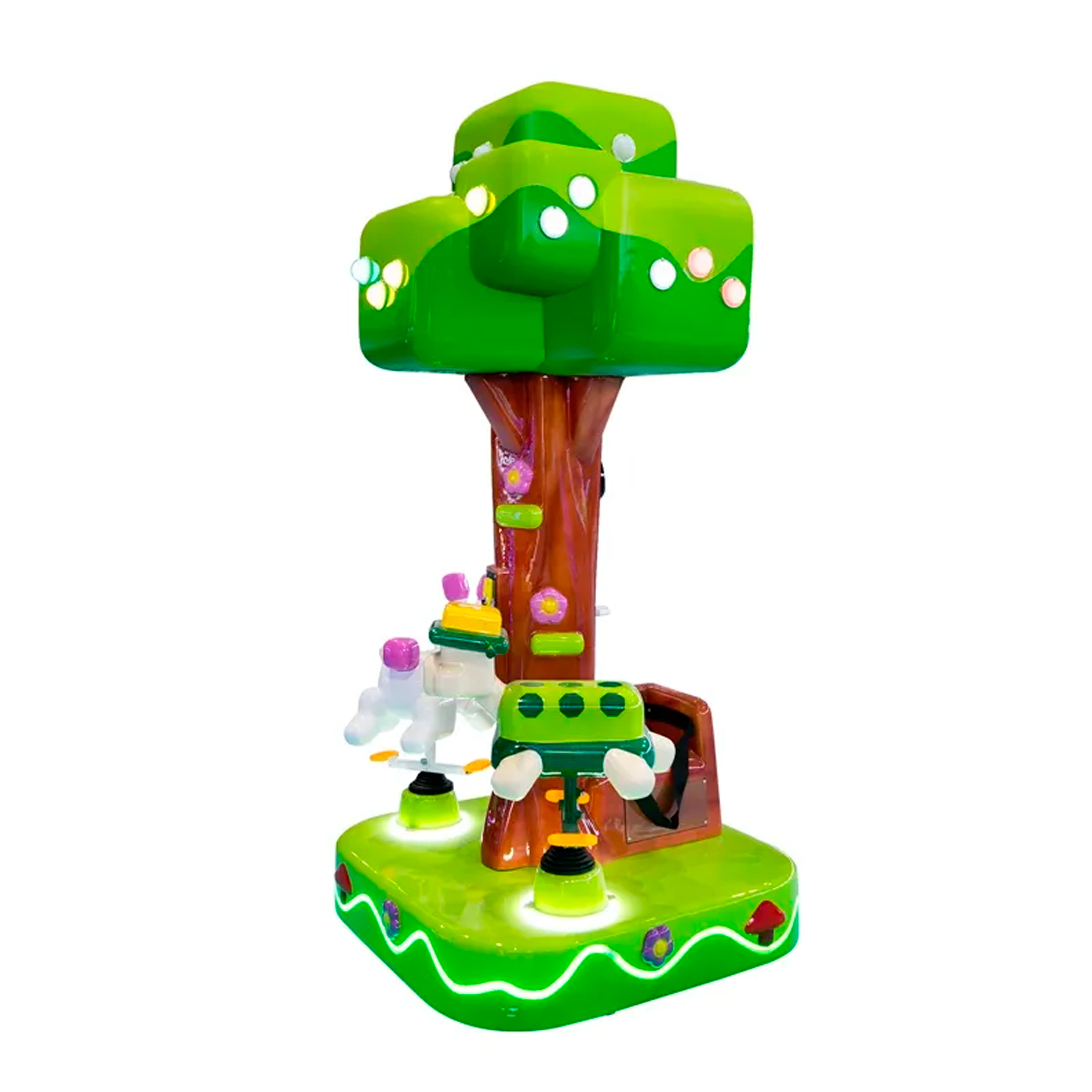 Дети садятся на фигурки зайца,черепахи и пенёк, после чего начинается плавное вращение вокруг центрального дерева с подсветкой. Музыкальное сопровождение и световые эффекты создают атмосферу праздника и радости.