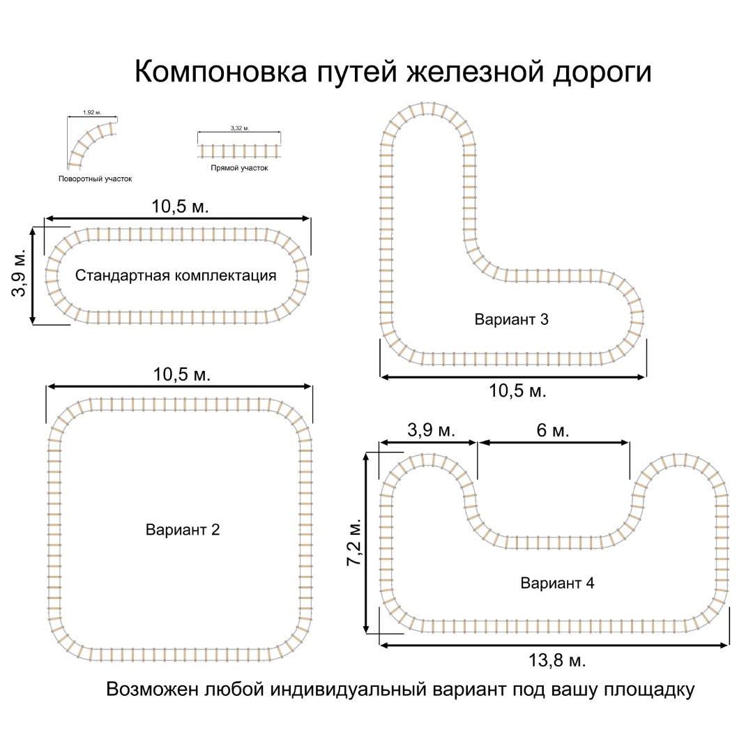В движение железную дорогу приводит электромотор с питанием 24 вольт. В комплекте так же есть набор рельс общая длина которых 25 метров, длину и траекторию пути можно изготовить по вашему эскизу. Конструкция очень компактная и мобильная, её можно с легкостью установить за 30 минут на любой поверхности и в любое время года.