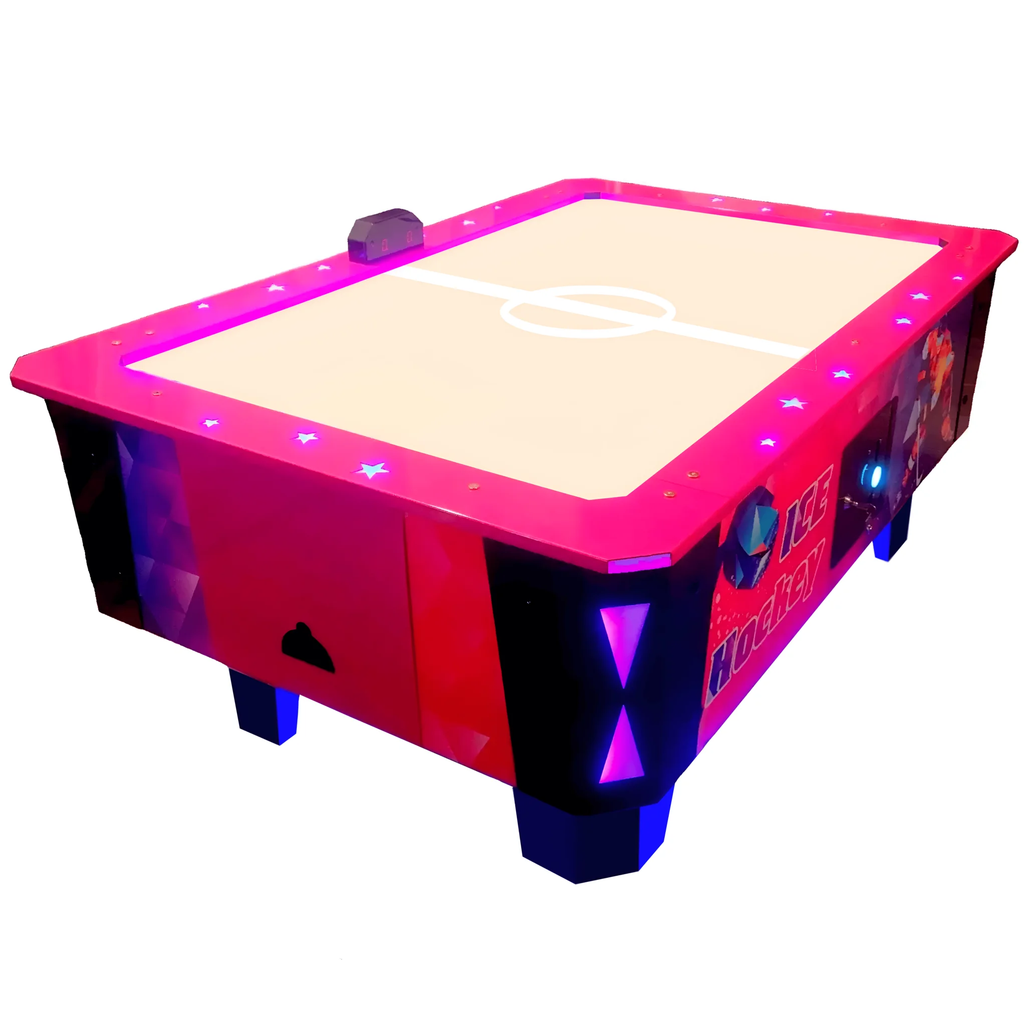 Детский аэрохоккей "ICE" - это качественный автомат с мощным компрессором, новыми прочными стальными бортами, универсальными табло времени и счета напротив каждого игрока, а также светящимся полем и всей необходимой электроникой для коммерческого использования.