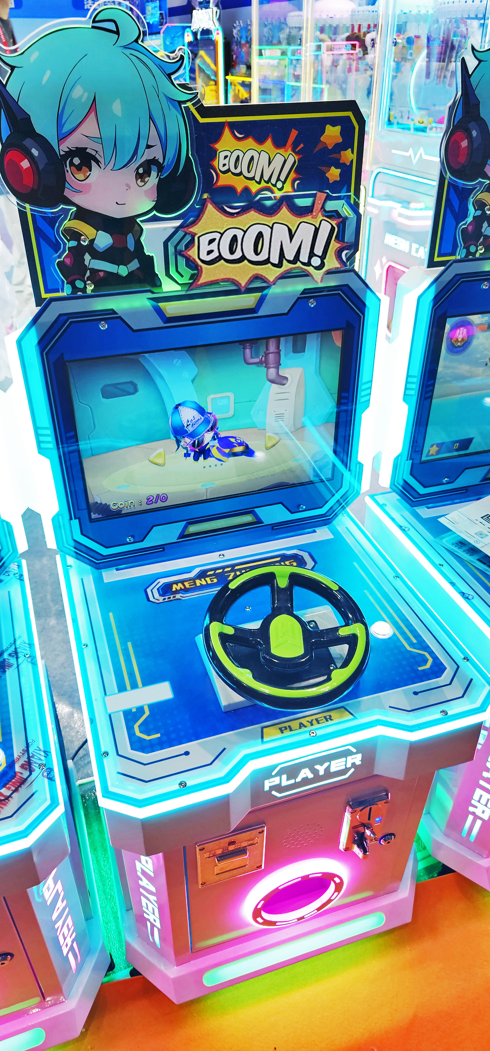 - Яркий и современный дизайн: Автомат выполнен в футуристическом стиле с обилием неоновых цветов. На верхней части установлено объемное изображение милого аниме-персонажа в шлеме, что сразу привлекает внимание детей.