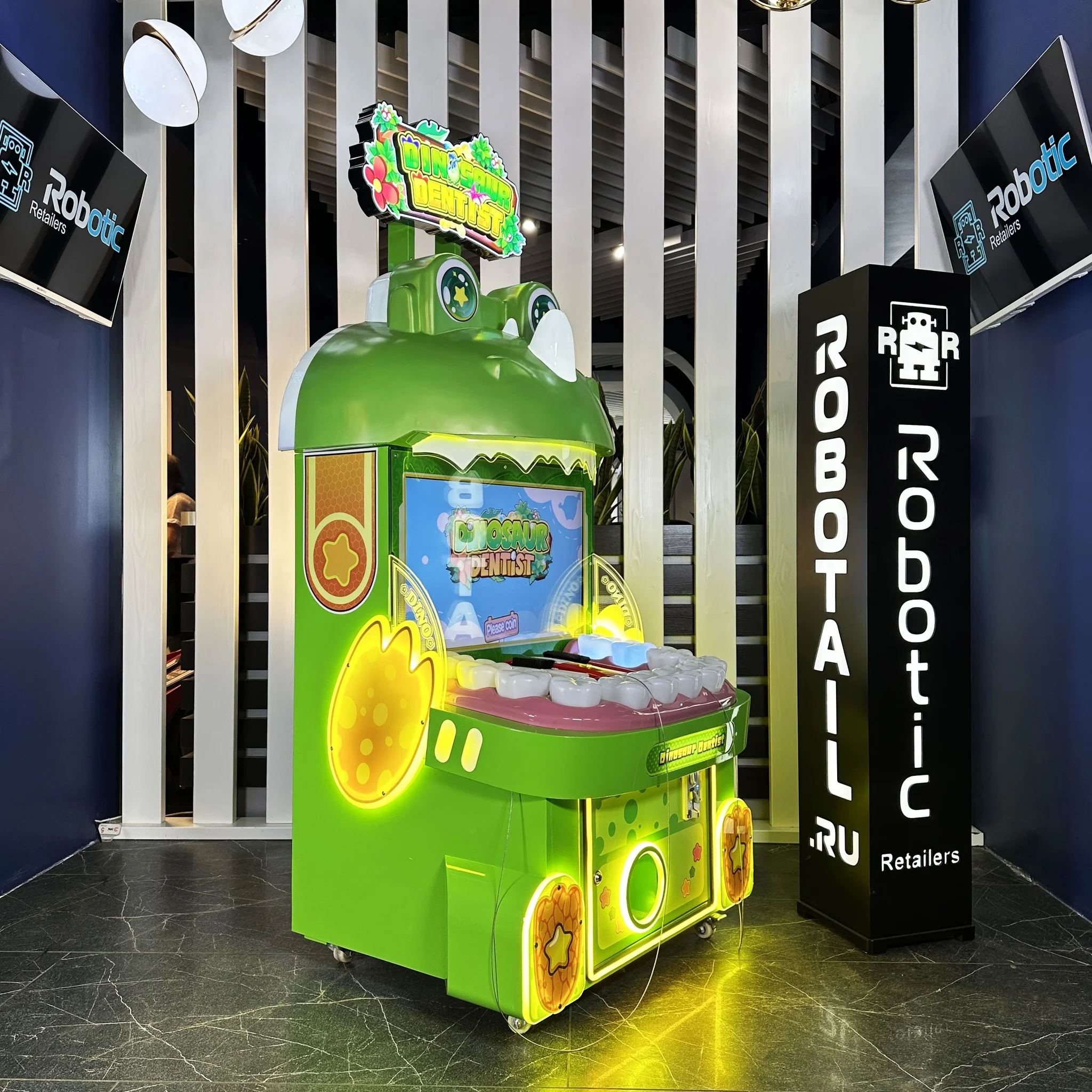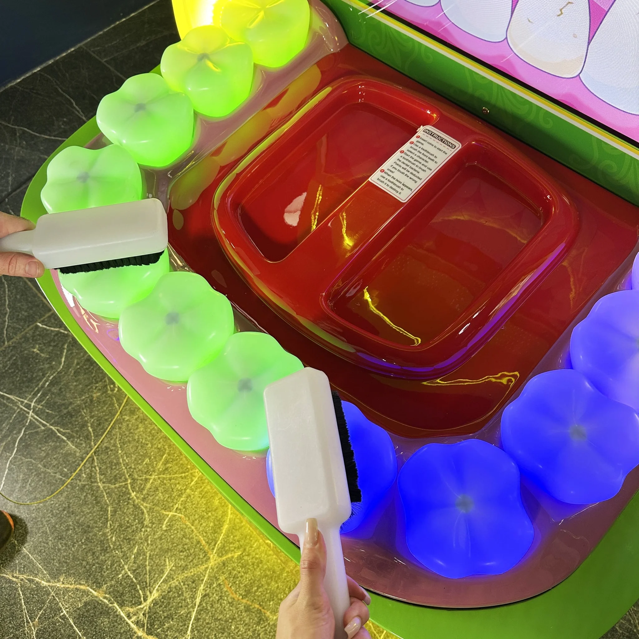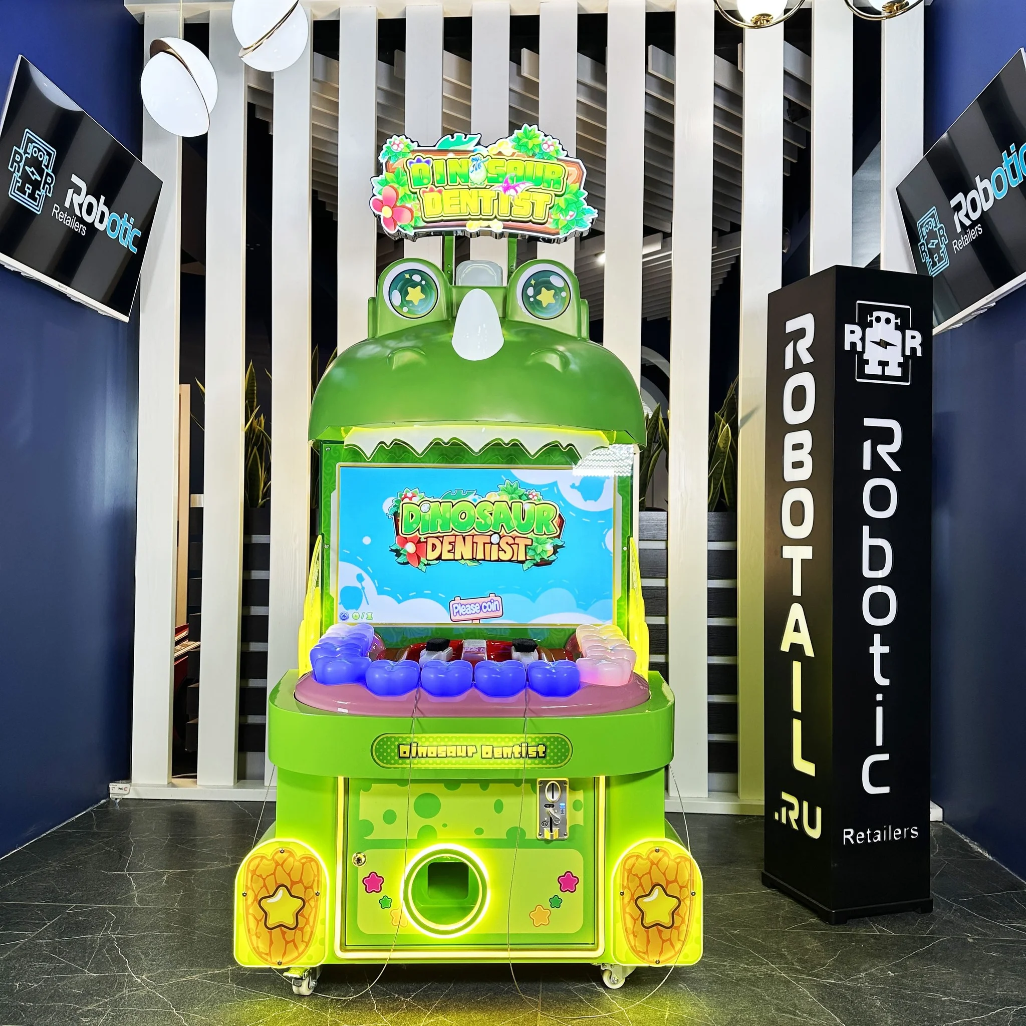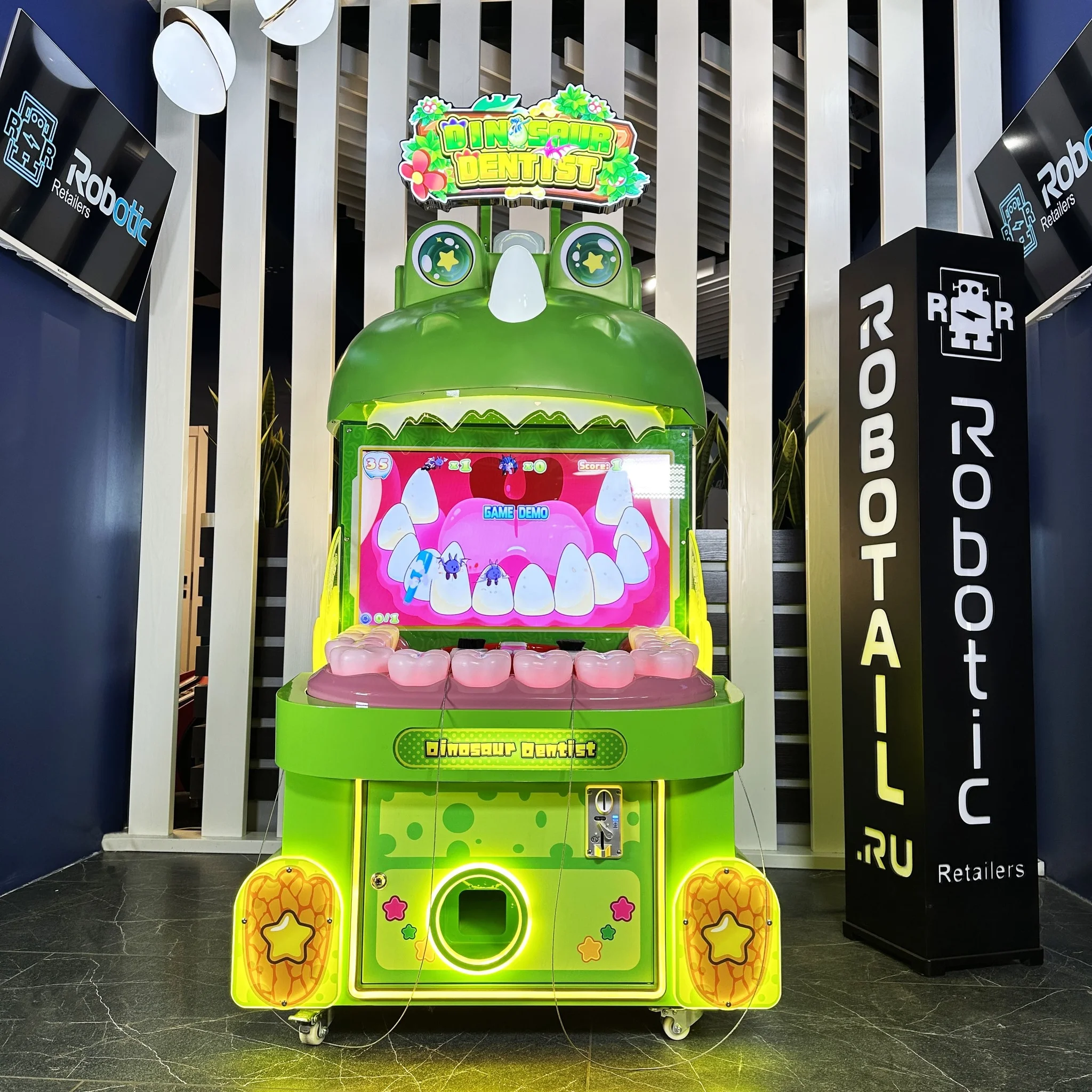 Игровой автомат «Стоматолог Динозавр» приглашает детей стать настоящими юными врачами. В руки они берут большие игровые щётки и отправляются на миссию — спасти улыбку дружелюбного динозаврика! Зубы светятся, звучит весёлая музыка, а экран подсказывает, где прячется кариес. Задача ребёнка — тщательно почистить каждый зуб и защитить их от вредных бактерий.