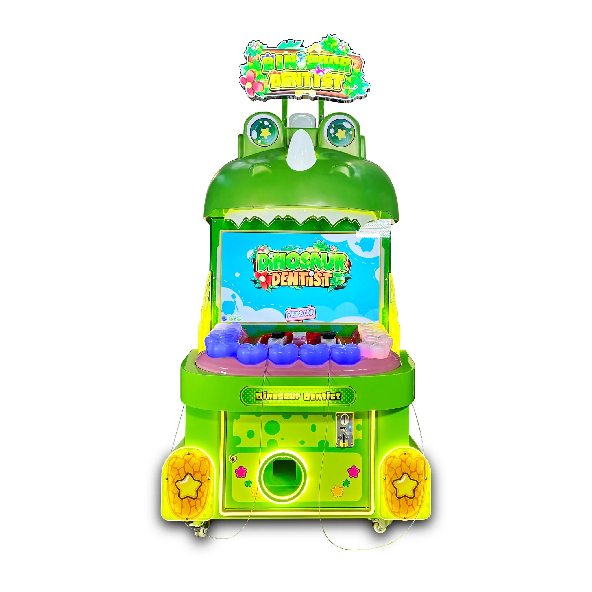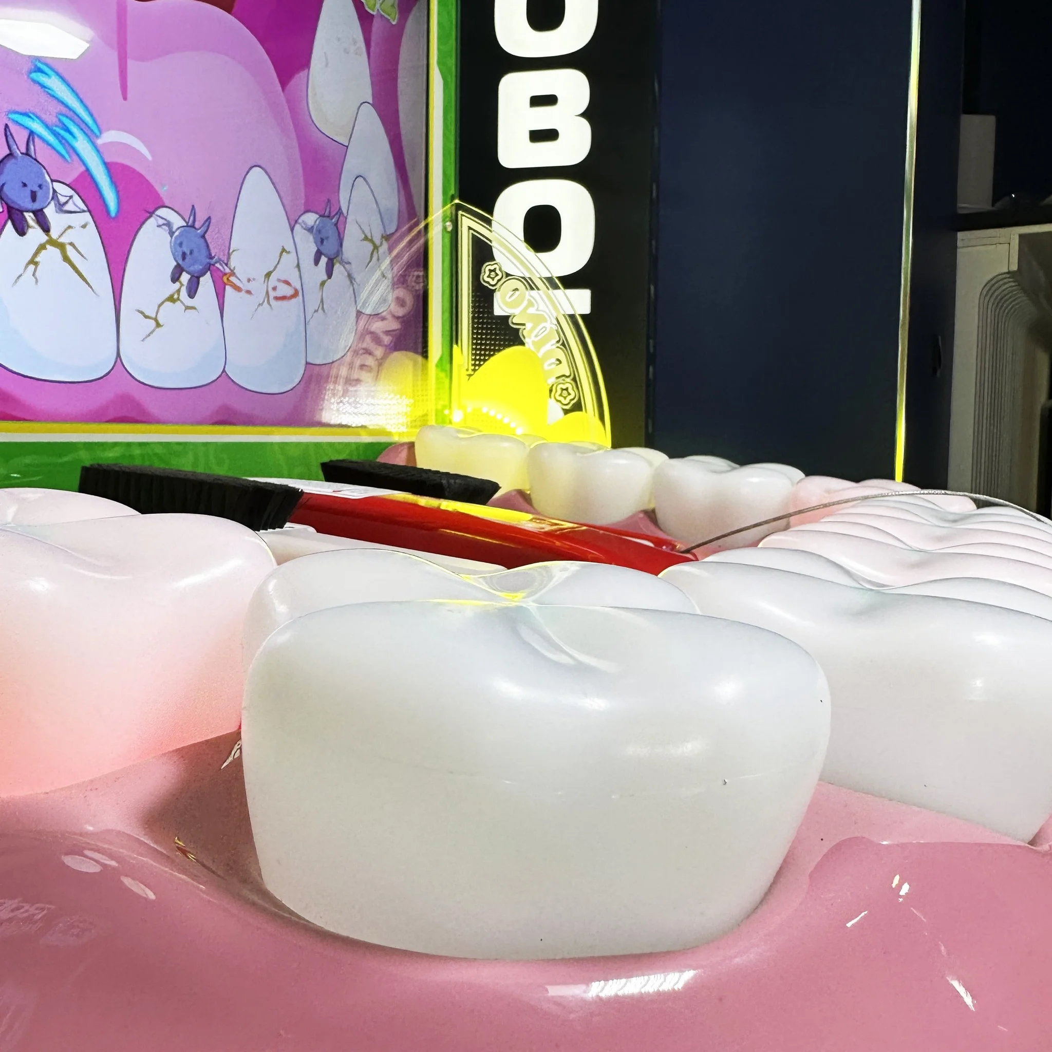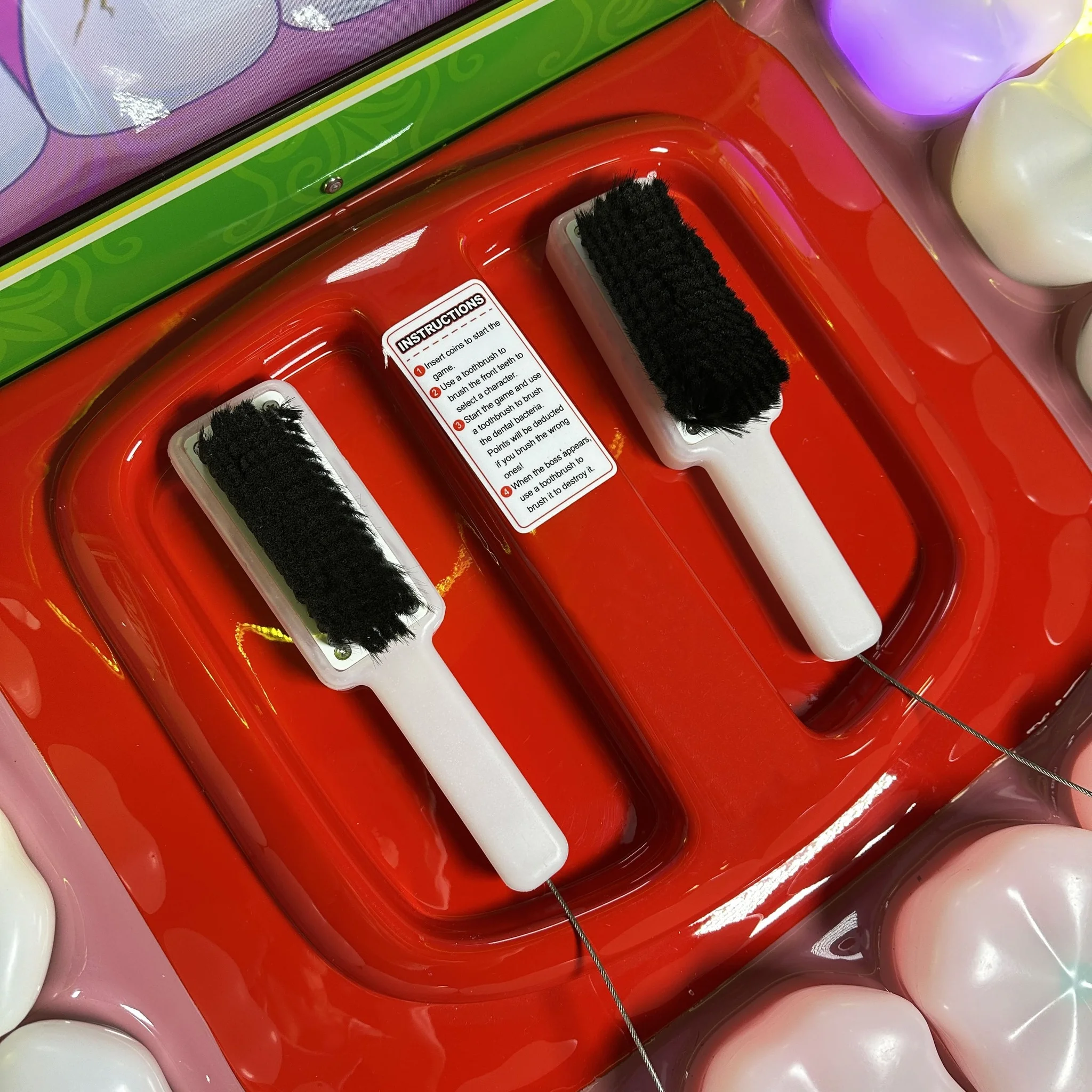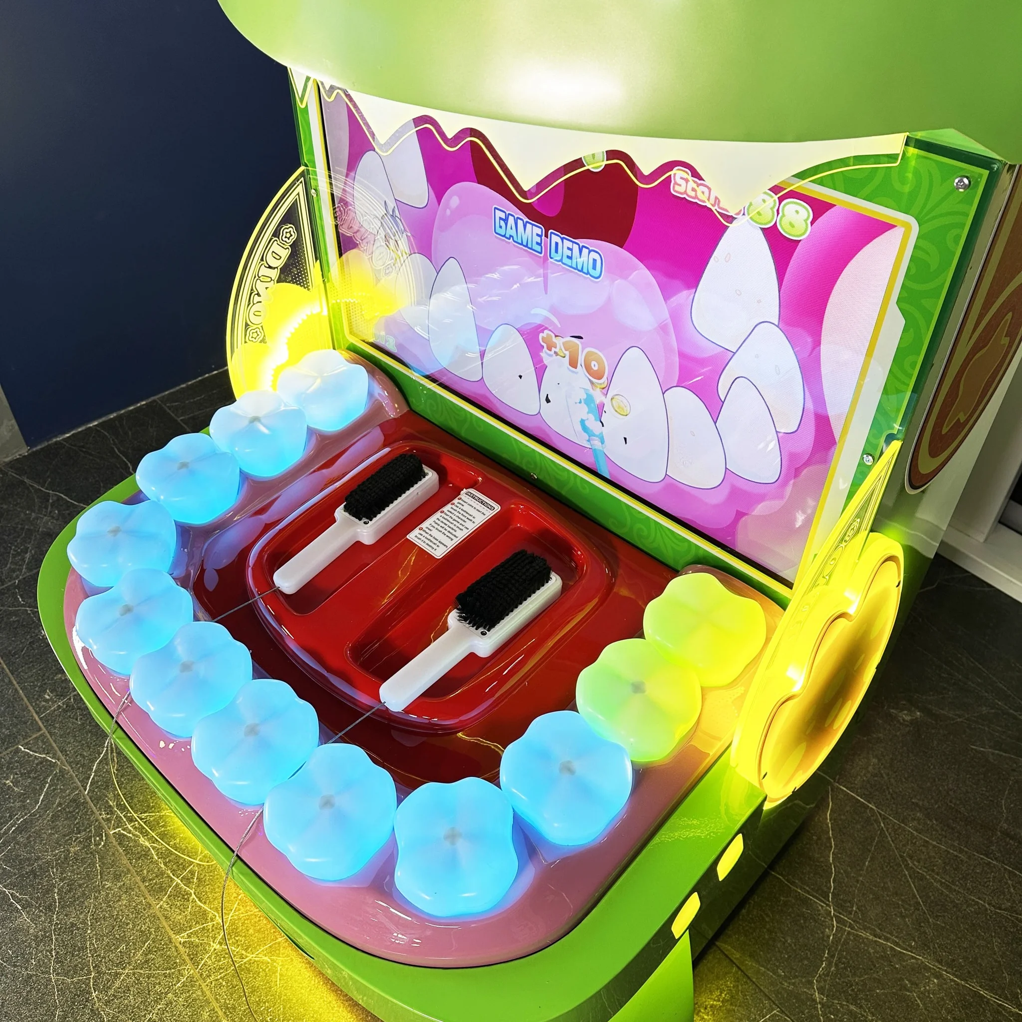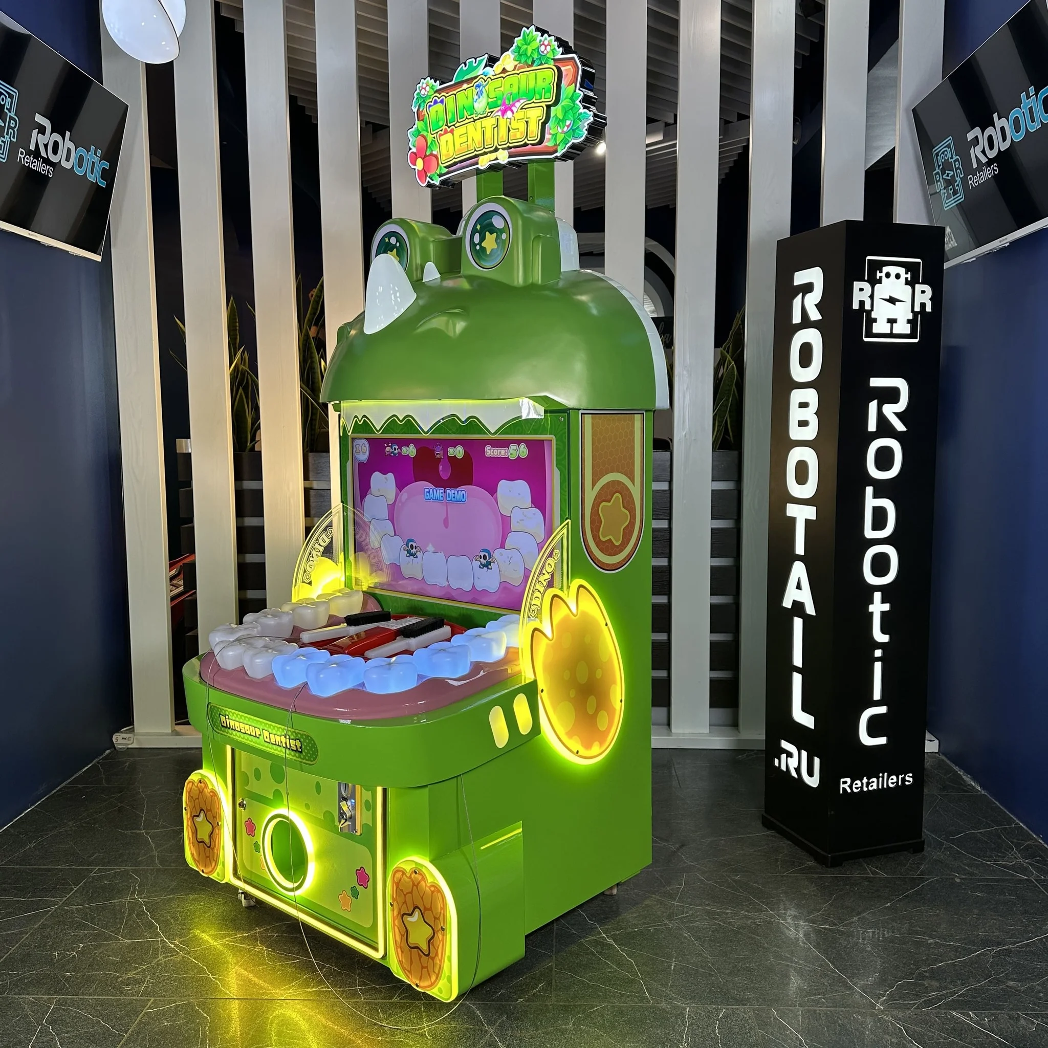 Игровой автомат «Стоматолог Динозавр» приглашает детей стать настоящими юными врачами. В руки они берут большие игровые щётки и отправляются на миссию — спасти улыбку дружелюбного динозаврика! Зубы светятся, звучит весёлая музыка, а экран подсказывает, где прячется кариес. Задача ребёнка — тщательно почистить каждый зуб и защитить их от вредных бактерий.
