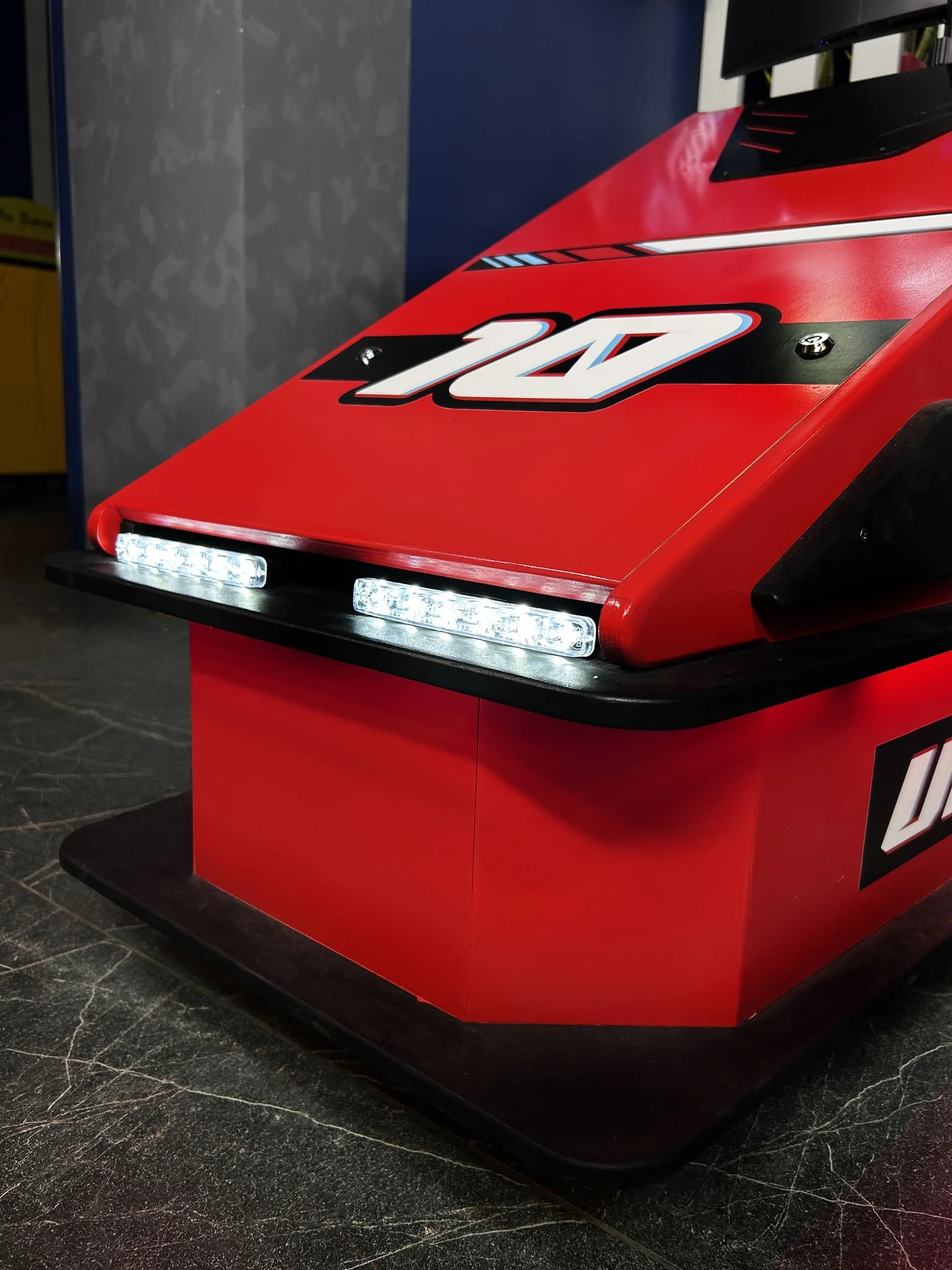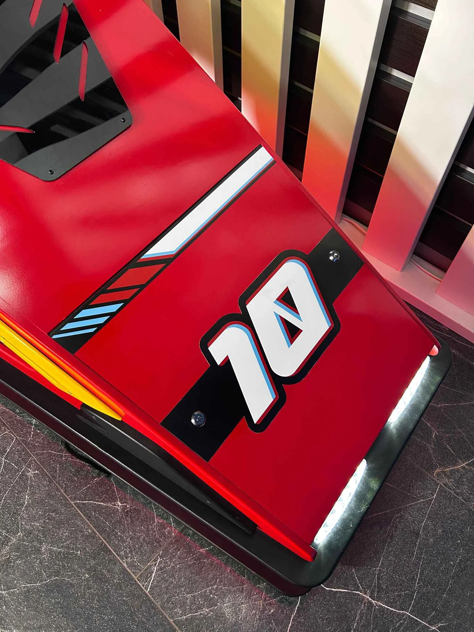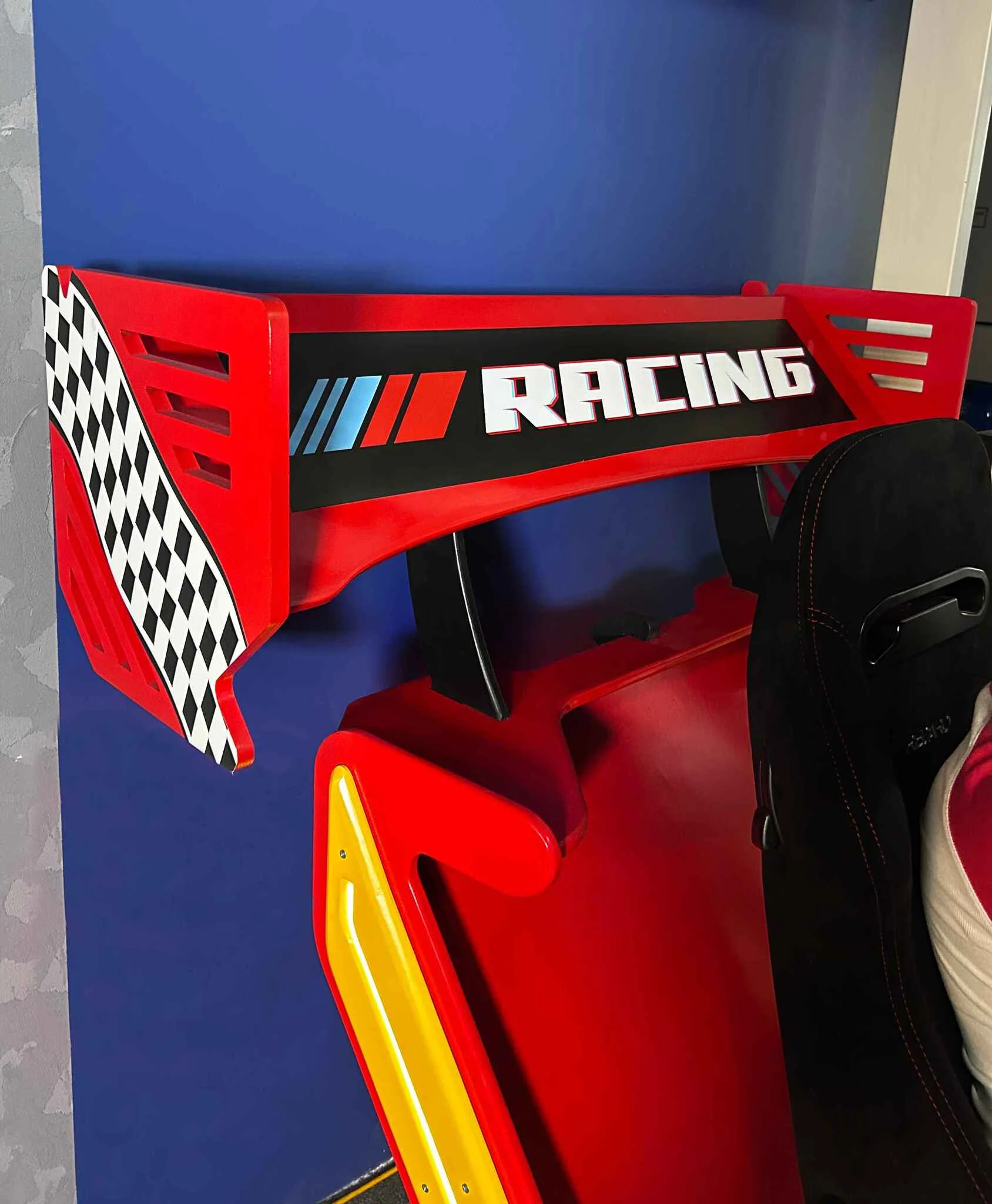 Этот впечатляющий автосимулятор имеет внушительные размеры, как у настоящей машины. Он выполнен в ярком дизайне, что придаёт ему особый стиль и индивидуальность.