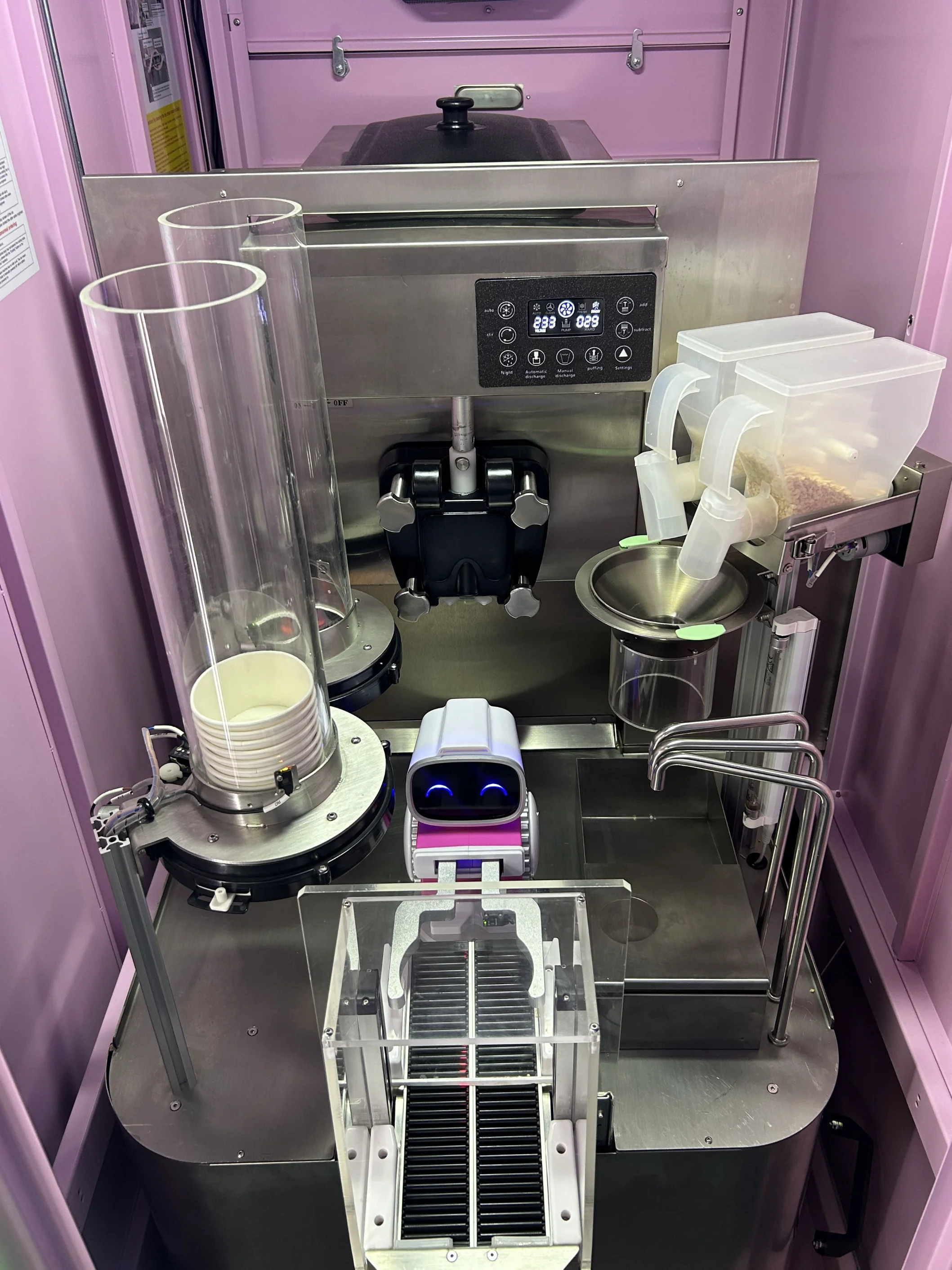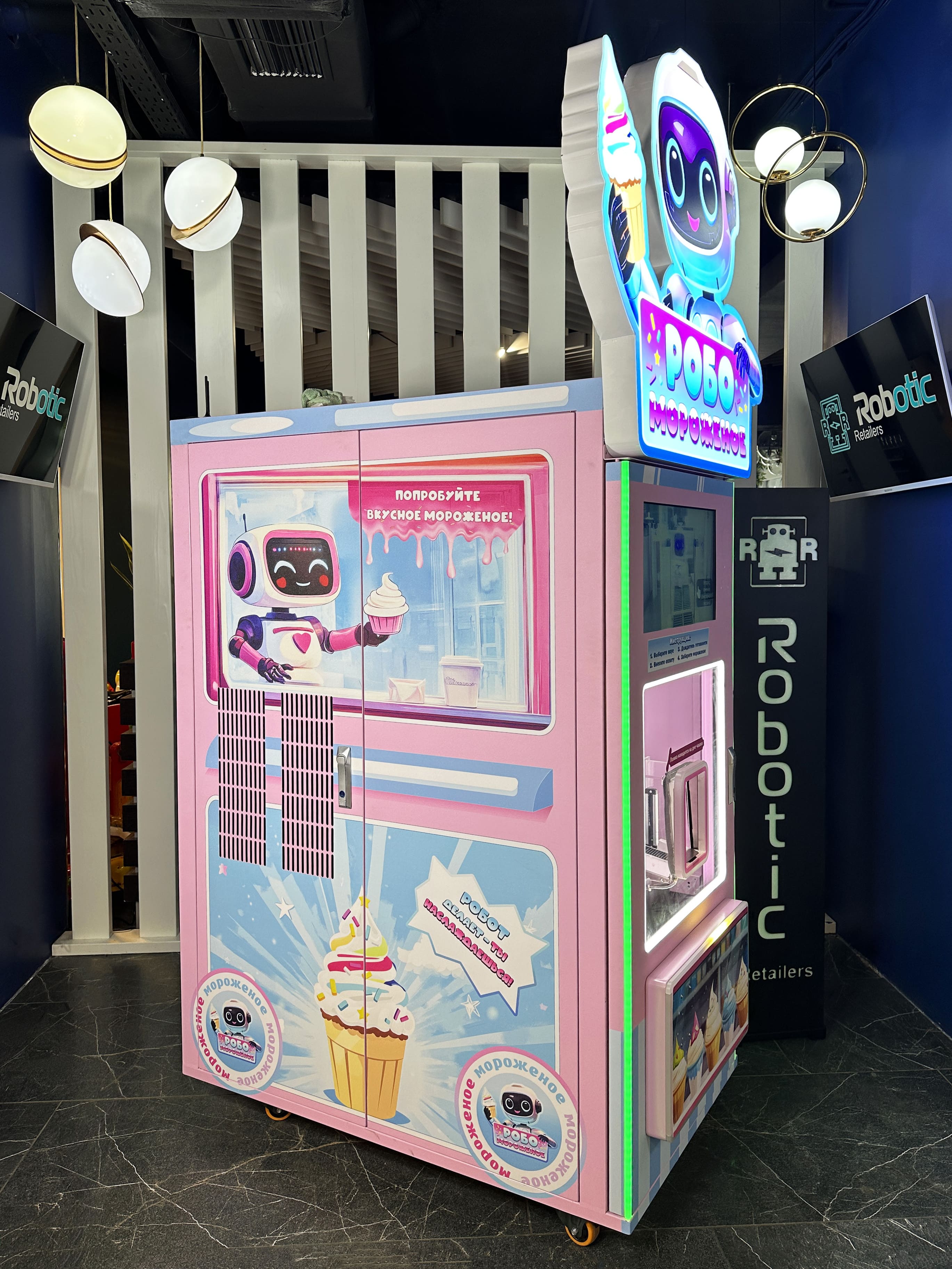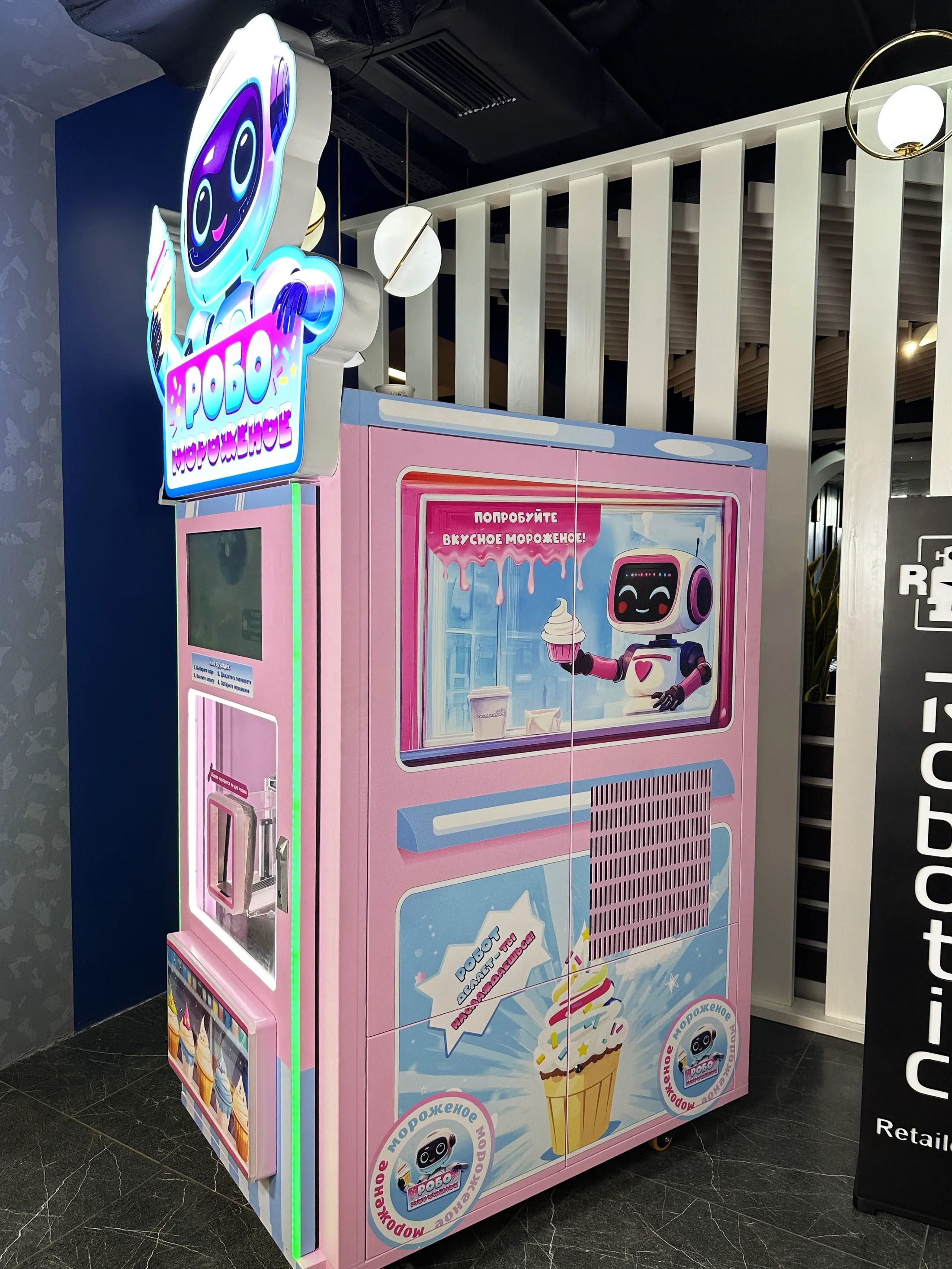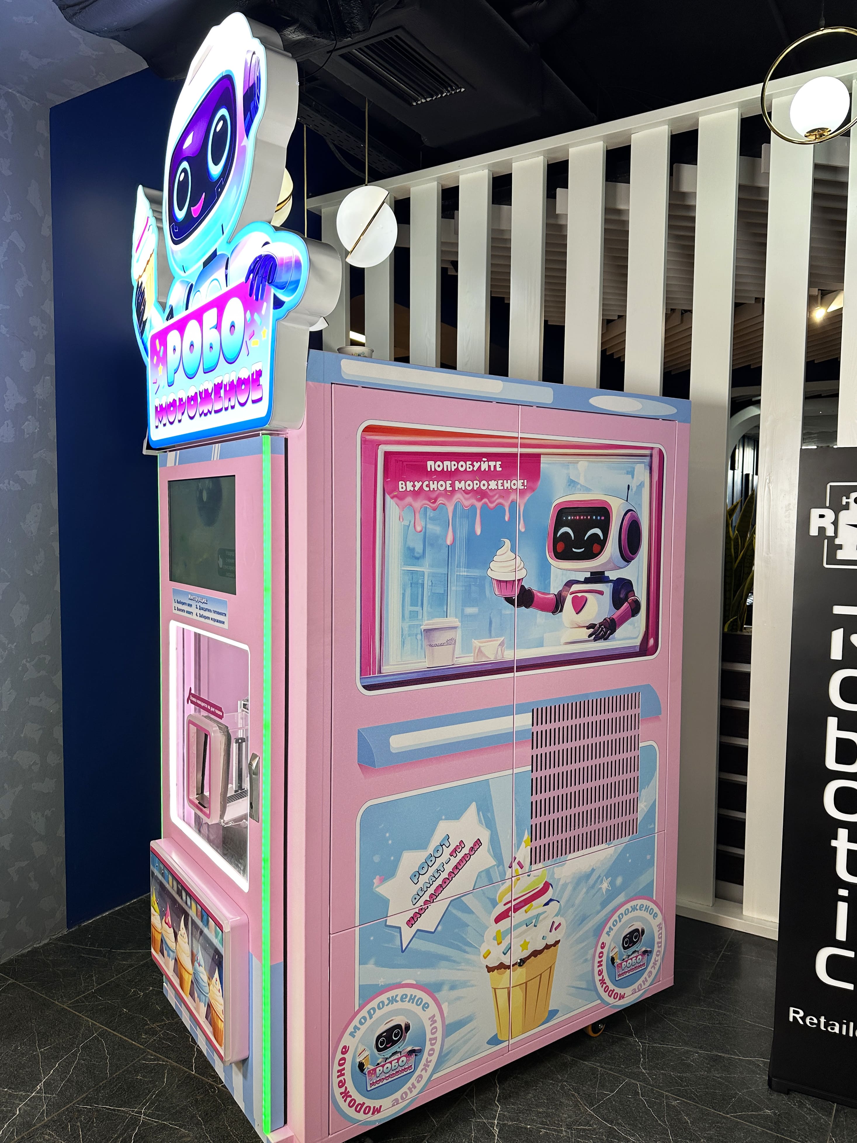 - Вендинговый автомат «Робо мороженое» — современный, надёжный и стильный автомат, создающий мороженое на основе свежей смеси в режиме реального времени. Быстрое приготовление, идеальная текстура, привлекательный внешний вид — идеально для привлечения клиентов.