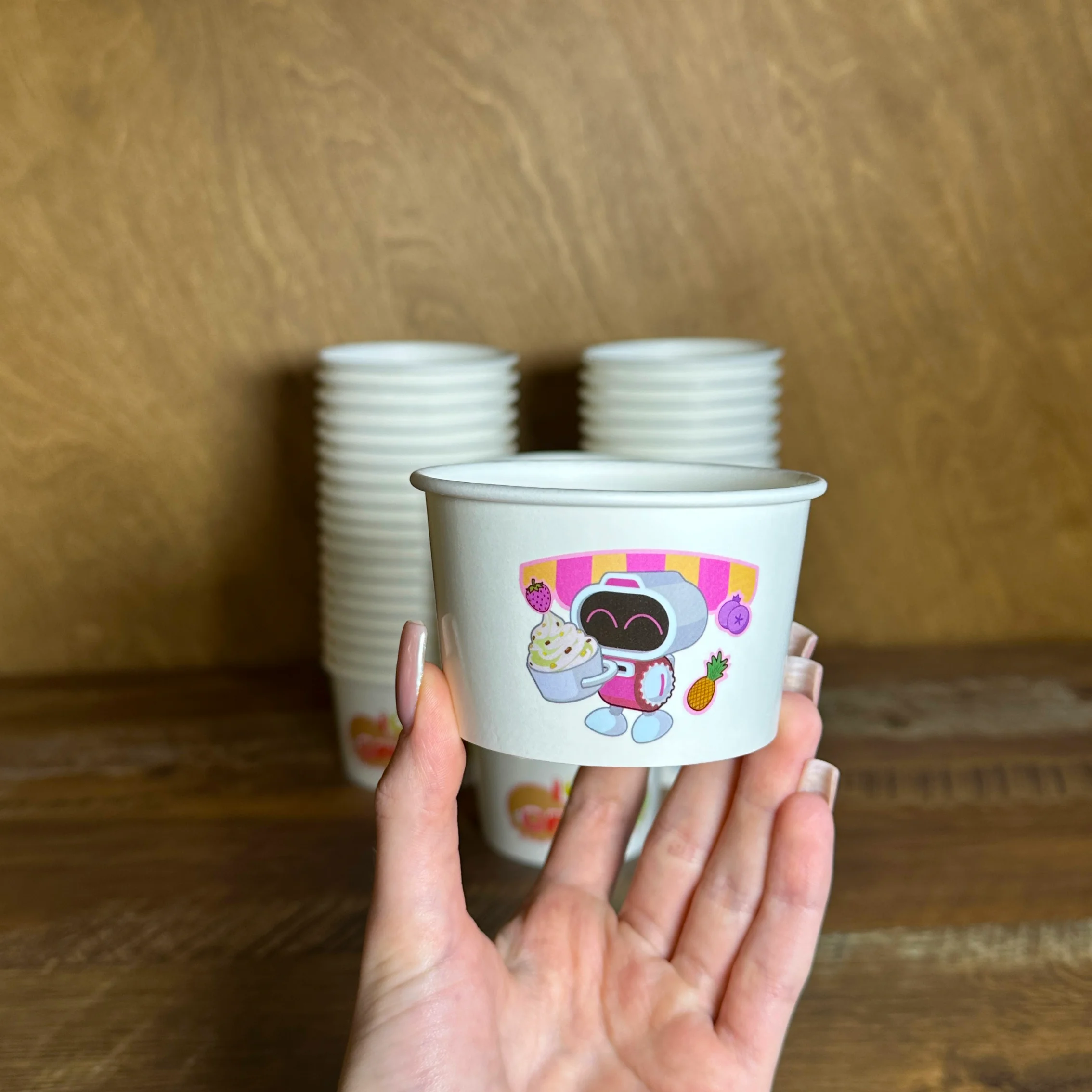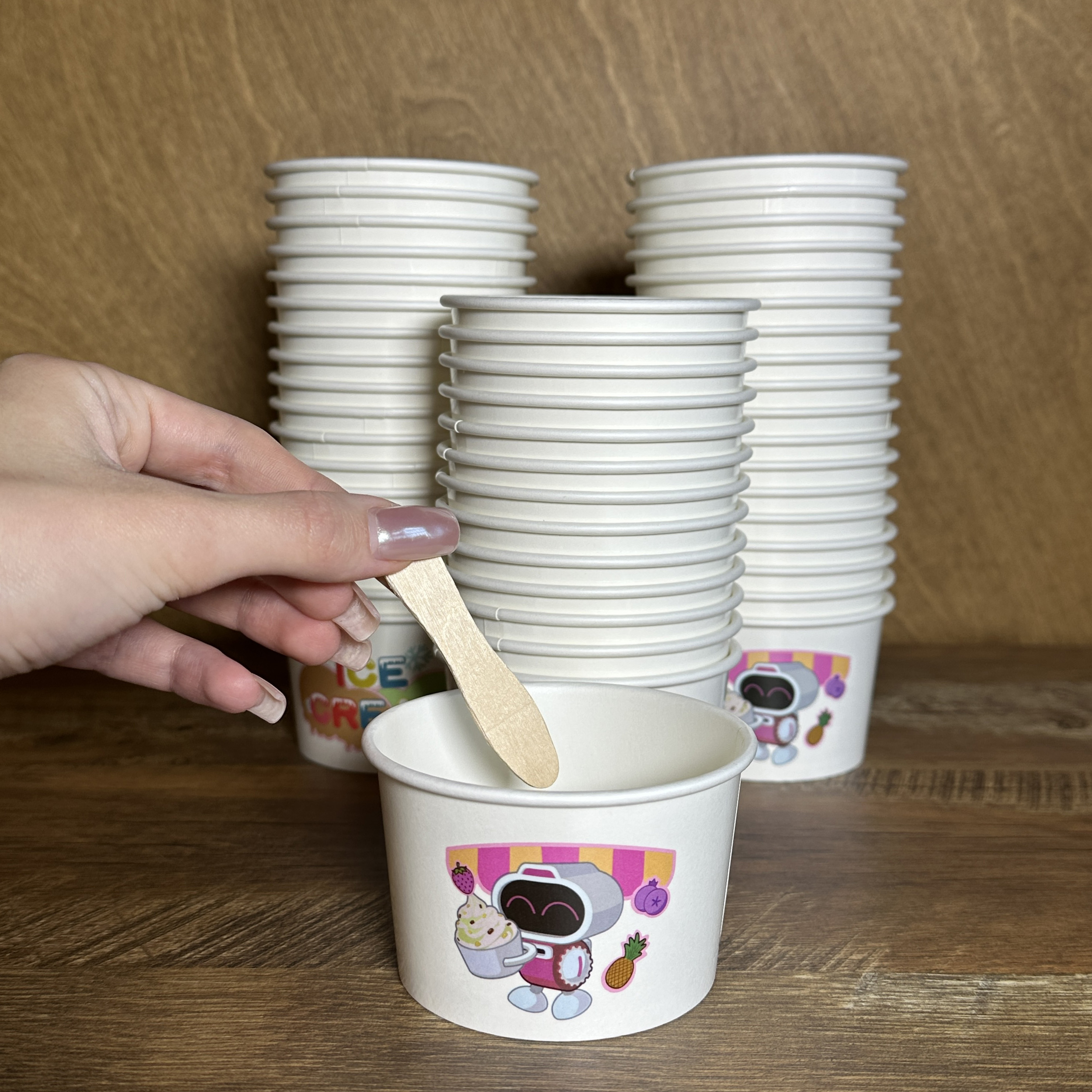 - Стаканчики — 1000 шт. Специально сделанные под автомат «Робо мороженое» — прочные, эстетичные, идеально подходят по объёму и дизайну.