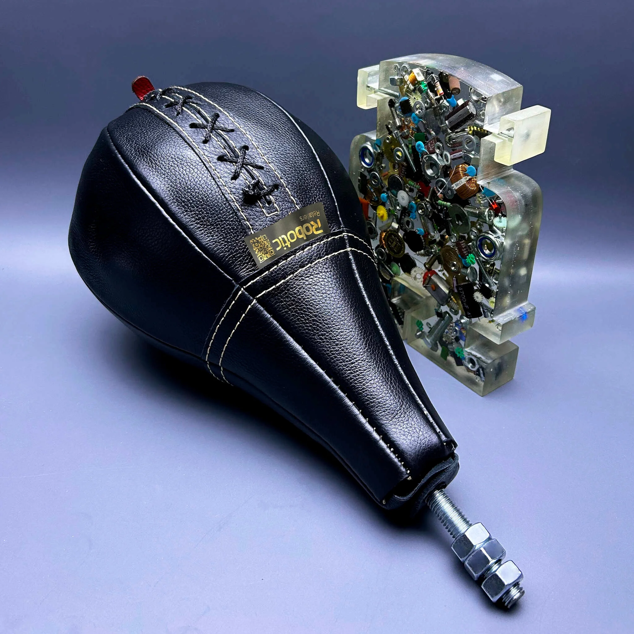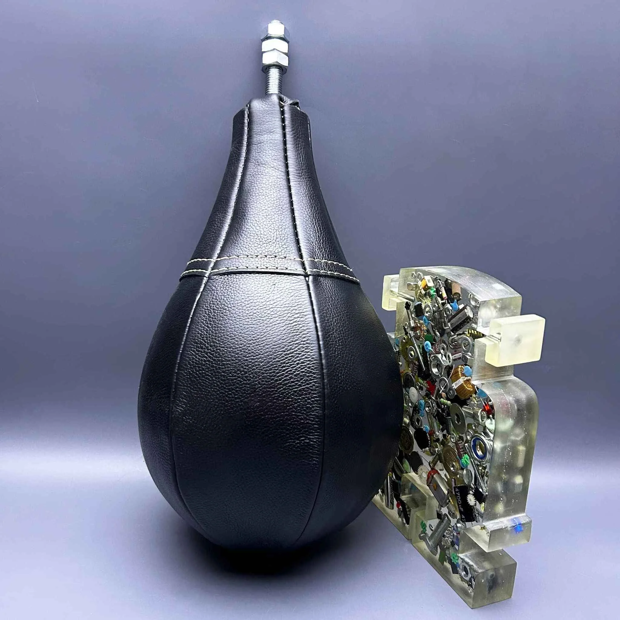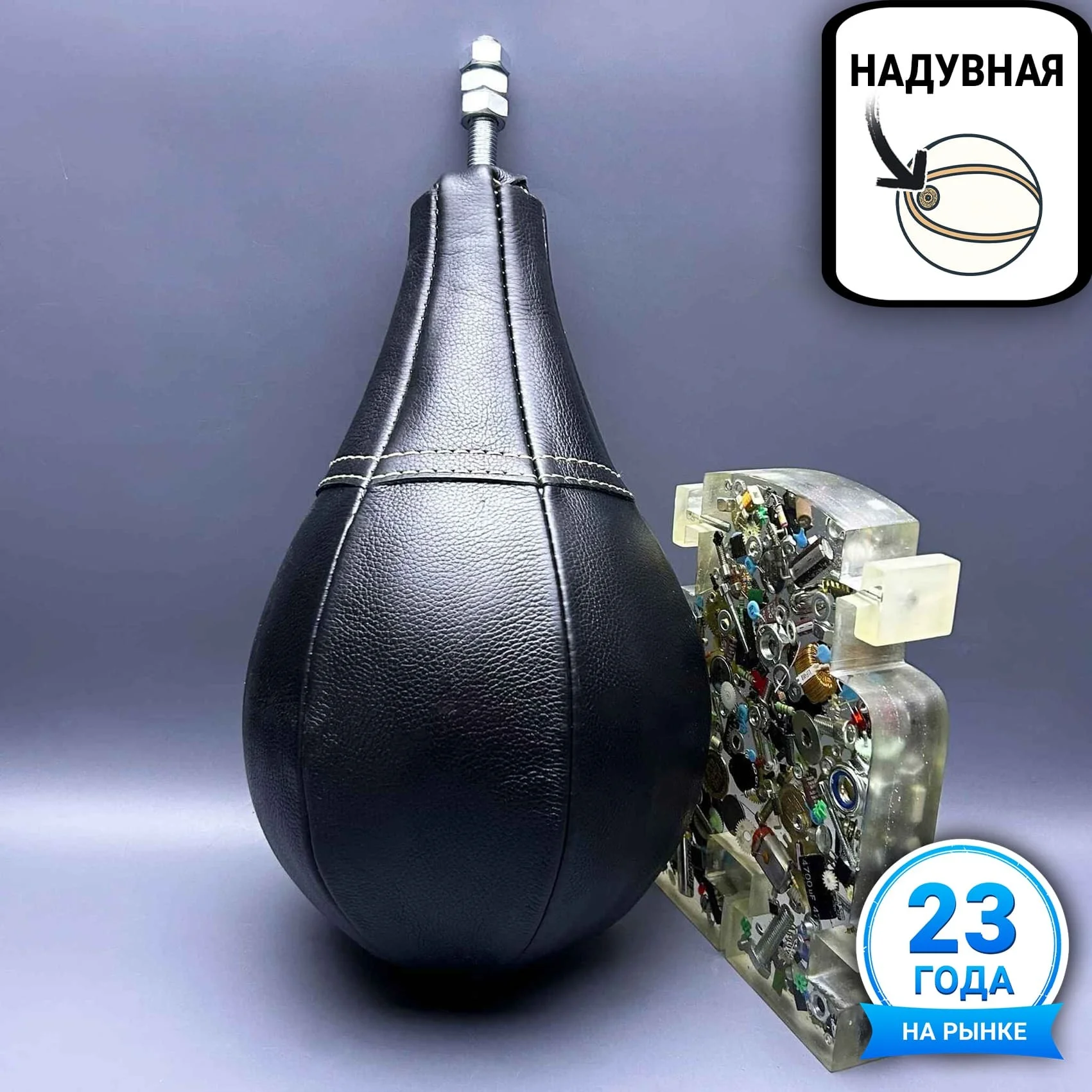 Качественная груша для силомера боксера, состоящая из чехла изготовленного из кожи КРС толщиной 1.6-1.8 мм, конуса из сверхпрочного полиуретана со шпилькой повышенной прочности, латексной камеры с грибком и усиленного чехла для защиты камеры в груше.