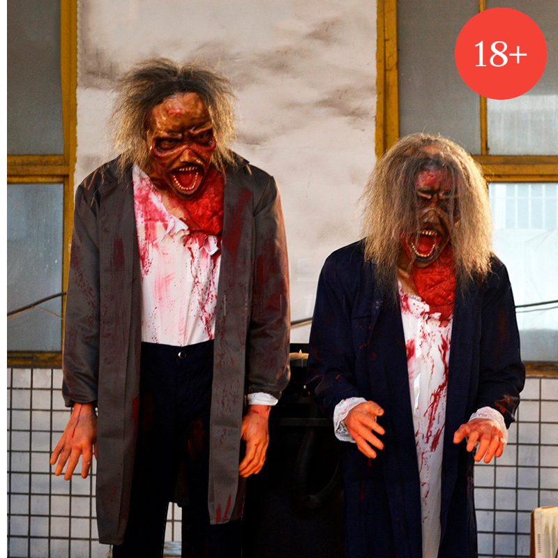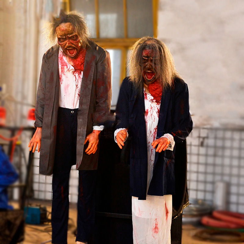 Эта ужасающая аниматронная пара состоит из мужчины и женщины-зомби, полностью пропитанных кровью и одетых в рваную одежду. Их синхронные движения и жуткие звуковые эффекты создают невероятно пугающее впечатление. Эти зомби идеально подойдут для комнат страха, квестов, входных зон или сцен с темой зомби-семьи, эта пара оставит ваших гостей в состоянии полного ужаса.