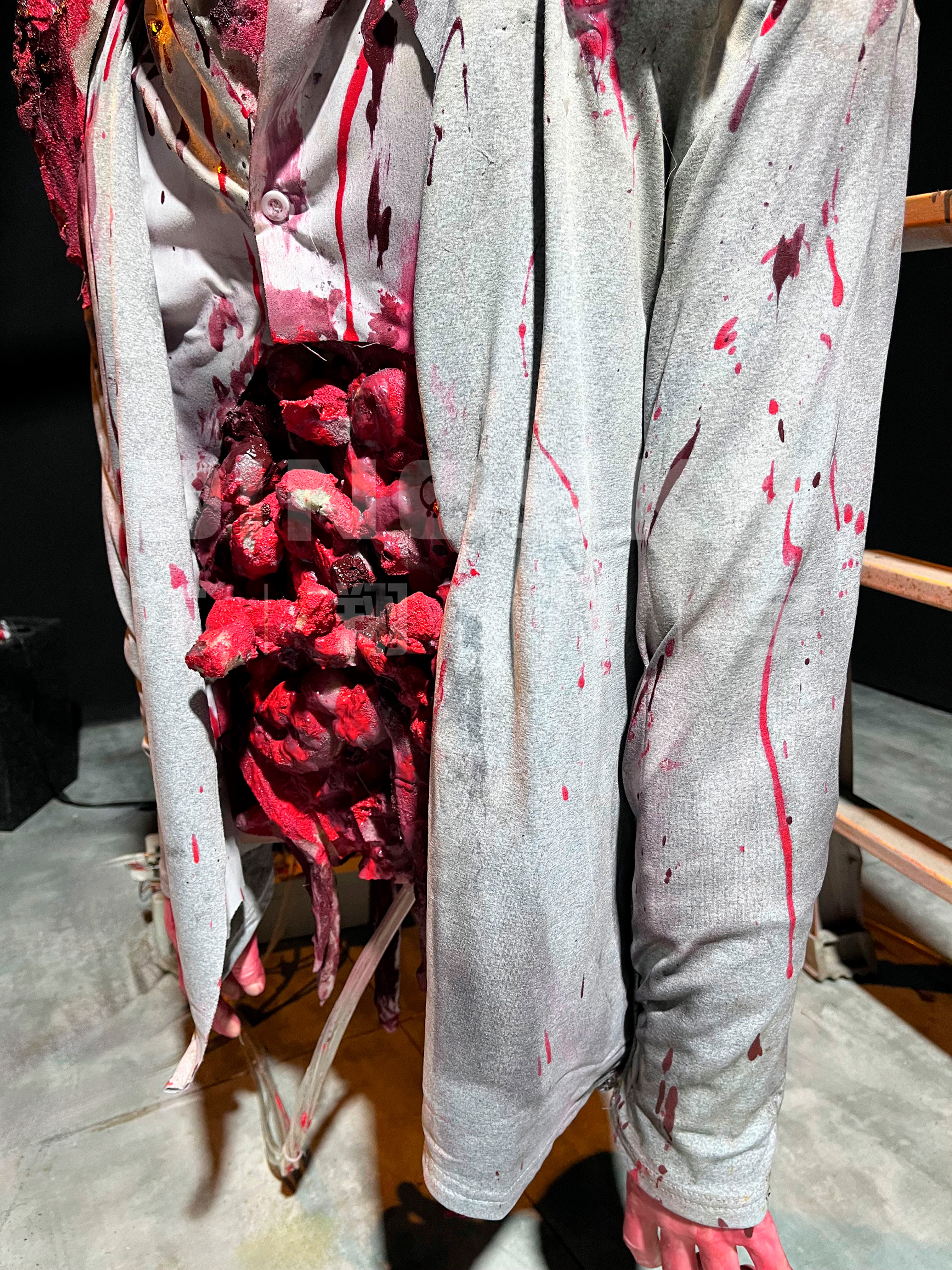 Погрузите своих гостей в настоящий кошмар с этим полуразрушенным зомби, который извивается и кричит от боли. Его оторванные конечности, обнажённые ребра, дергающиеся мышцы и кровавые следы — всё это создаёт по-настоящему устрашающую атмосферу.