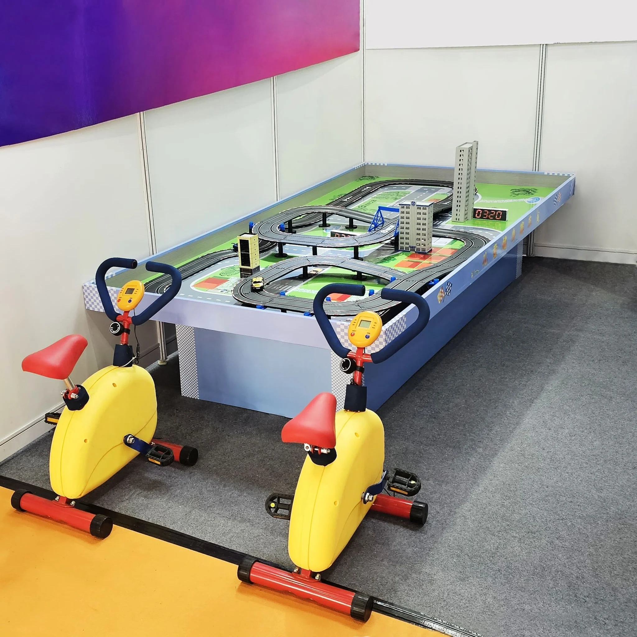 Погрузитесь в захватывающий мир гоночных приключений с нашим уникальным игровым столом, который объединяет физическую активность и увлекательный игровой процесс! Этот интерактивный аттракцион создан для двух игроков, которые могут соревноваться друг с другом, сидя на ярких желто-красных велотренажерах.
