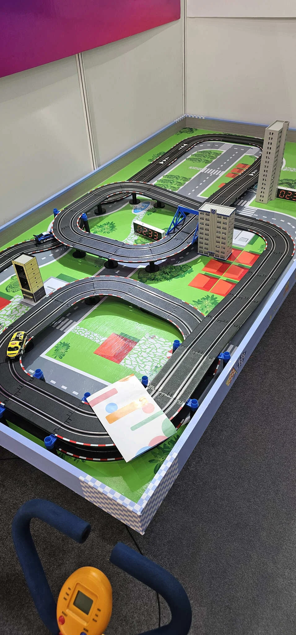 Каждый игрок садится на свой велотренажер и начинает крутить педали. Чем быстрее вы едете, тем быстрее движется ваша машинка по сложной трассе на поверхность стола. Трасса включает в себя повороты, мосты, подъемы и спуски, что делает гонку еще более динамичной и интересной.
