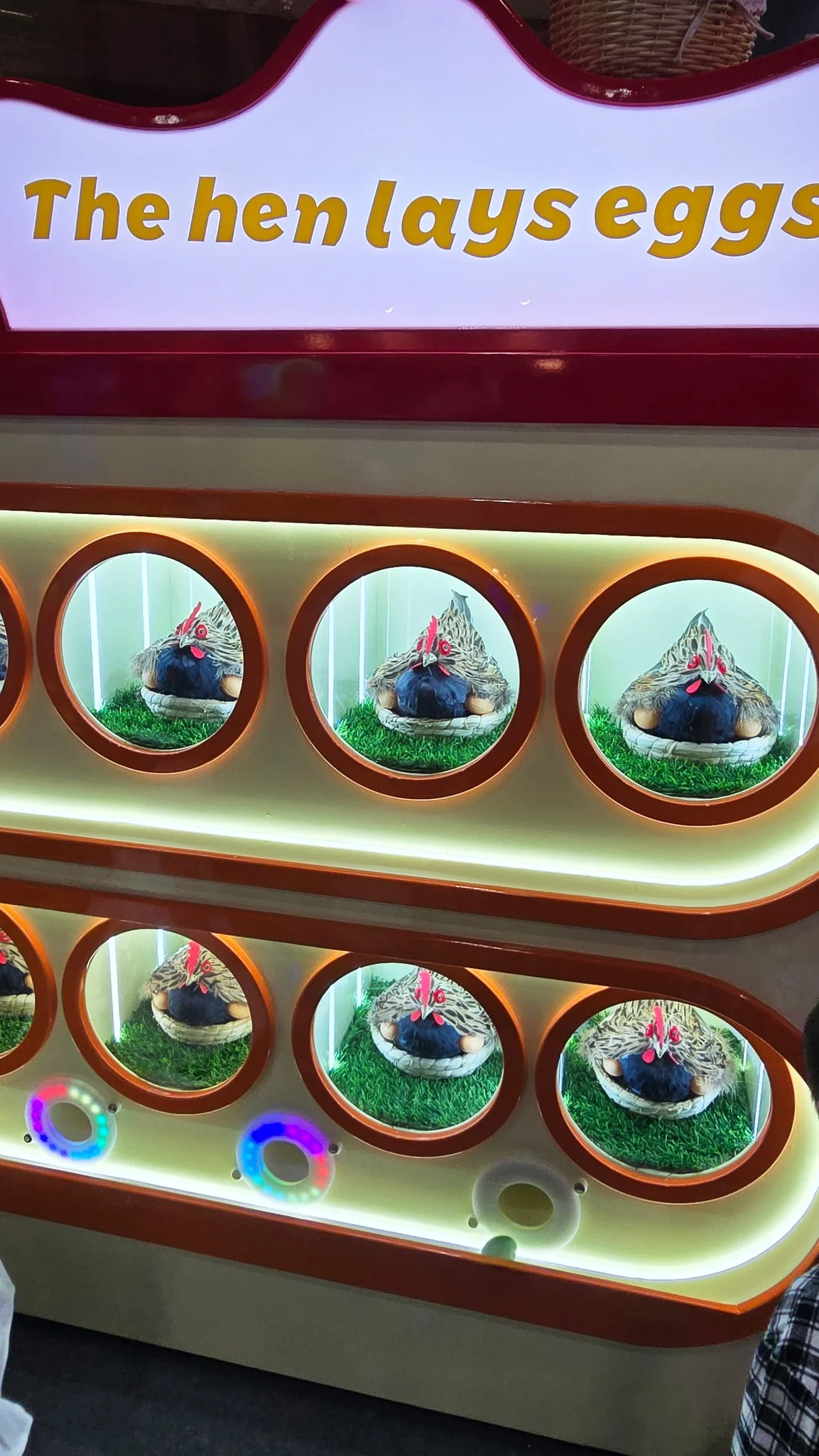 - Окна с круглыми отверстиями позволяют детям наблюдать за сидящими внутри курами;
