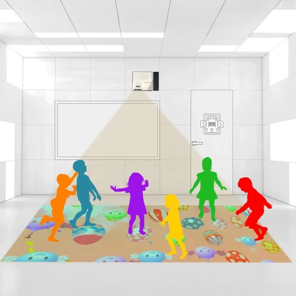 Интерактивный пол или живые мультики на полу, интересный модуль игровой зоны, размещаем в темном углу, включаем, дальше компьютер со встроенными датчиками работает сам.