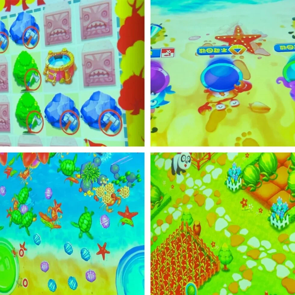 С проектора на пол проецируется 4 соревновательные и интересные игры. Время воспроизведения игр настраивается. Чем выше установлен проектор тем больше зона проекции. Белый цвет пола придаст картинке насыщенности, игра будет ярче.