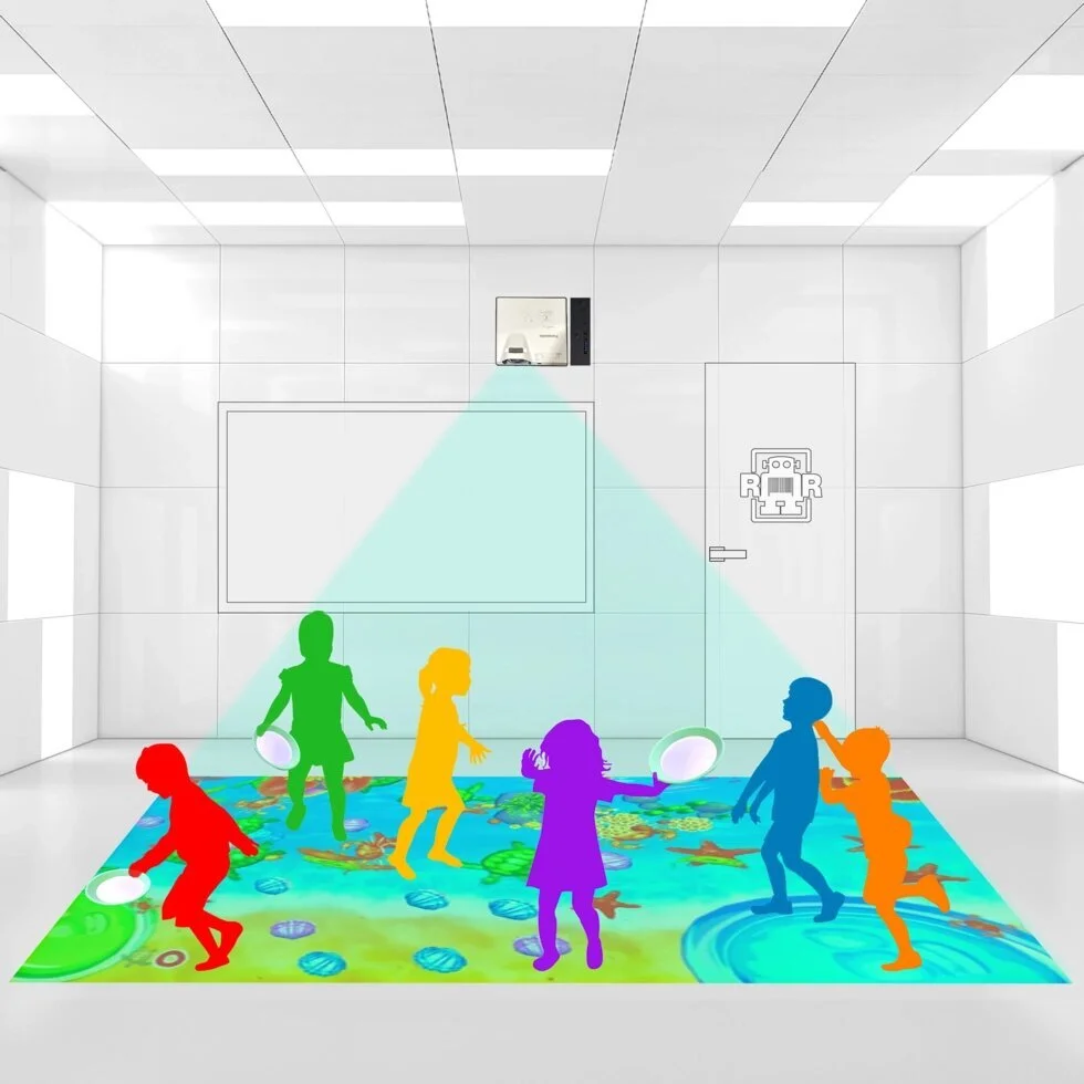 Интерактивный пол или живые мультики на полу, интересный модуль игровой зоны, размещаем в темном углу, включаем, дальше компьютер со встроенными датчиками работает сам.