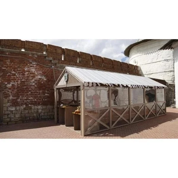 - Деревянный павильон с прозрачными стенами. на полу защитная резина. Столы покрашены корабельным лаком. Стальные рольставни с замком. Крыша тент или металл на выбор;