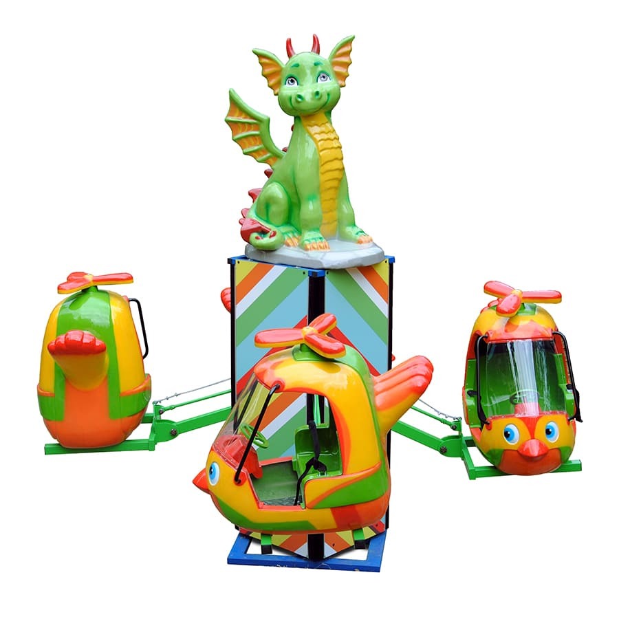 - Яркий дизайн: сиденья в форме вертолётов с улыбающимися мордочками и пропеллерами, а на вершине - забавный зелёный дракончик