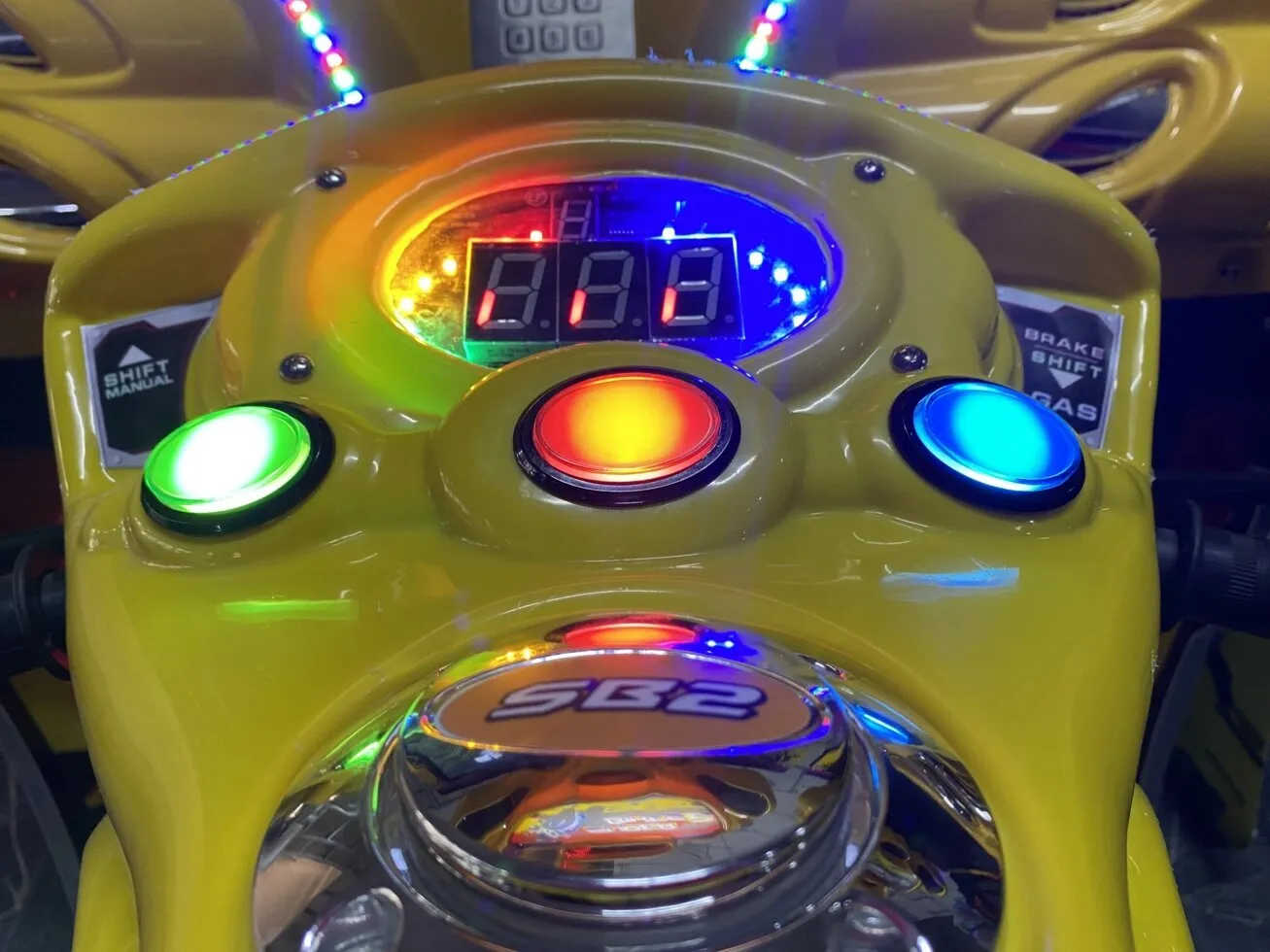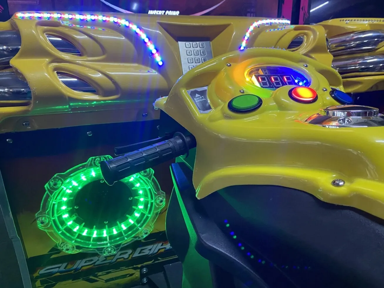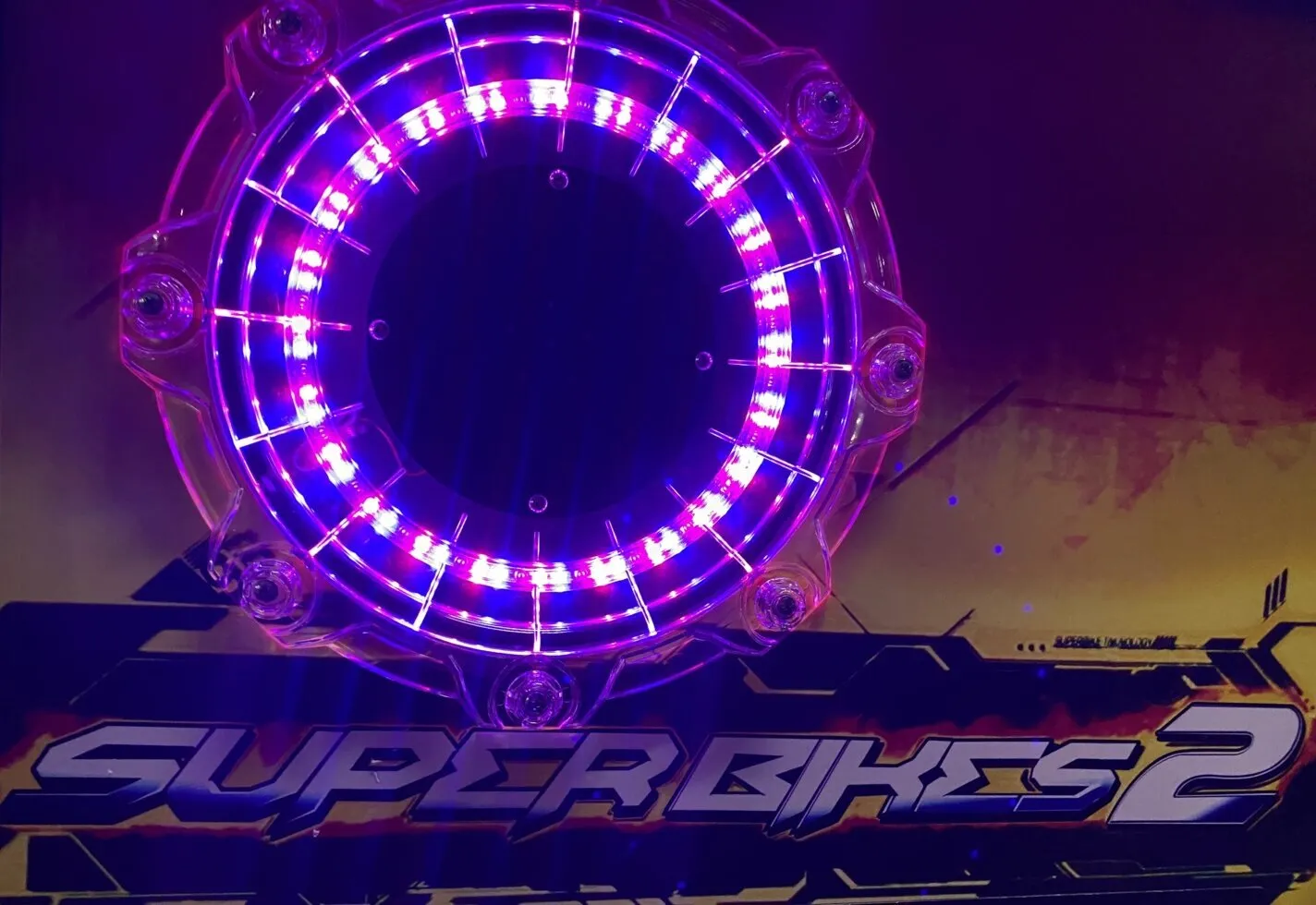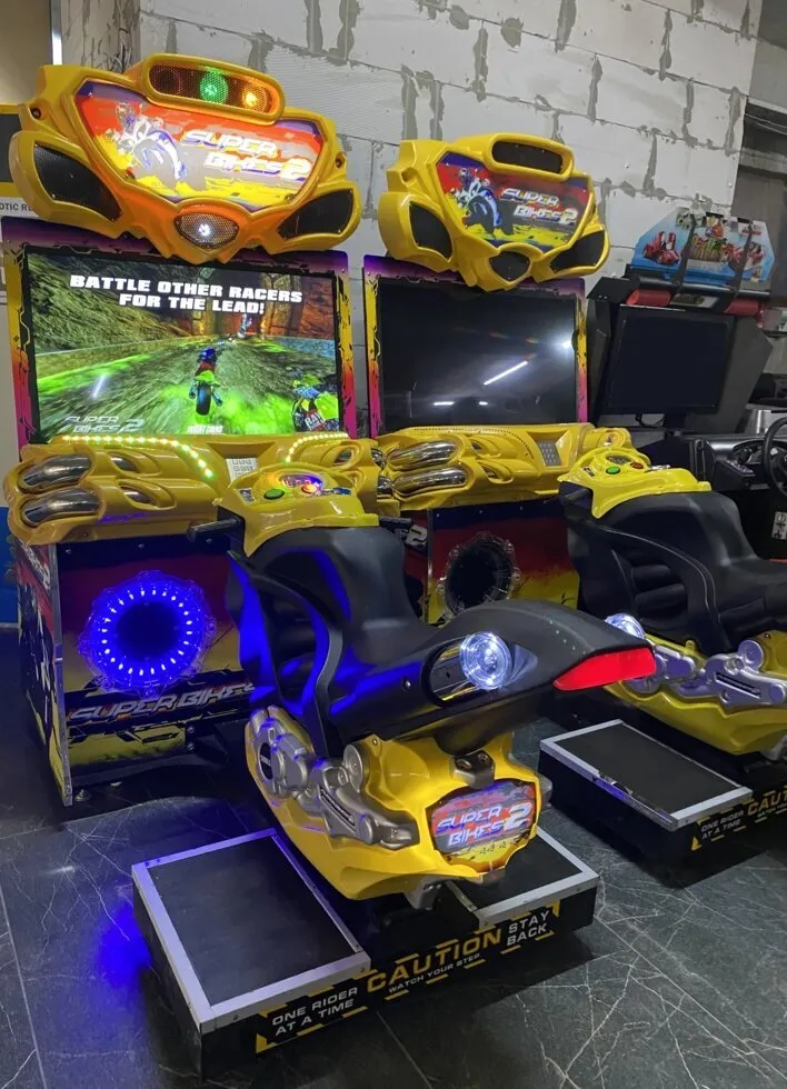 Гонки на мотоциклах привлекают гостей всех возрастов, и одним заездом дело ни когда не заканчивается. Яркий и привлекательный внешний вид оформленный в стиле гонок и мотоциклов: мигающие стробоскопы, выхлопные трубы, мощная музыка, подсветка, фары, посадочное место в виде байка, ручка газа, тормоза, спидометр, все это полностью погружает в атмосферу скорости и соревнования. А теперь добавьте к этому разнообразие гоночных трасс, их здесь 10, забавные аватары каждый на своем байке, их 12 на выбор, и конечно потрясающие трюки в игре. Все это вызывают небывалый азарт и желание обогнать своего соперника, тем более что в одну игру можно подключить до 8 автоматов!