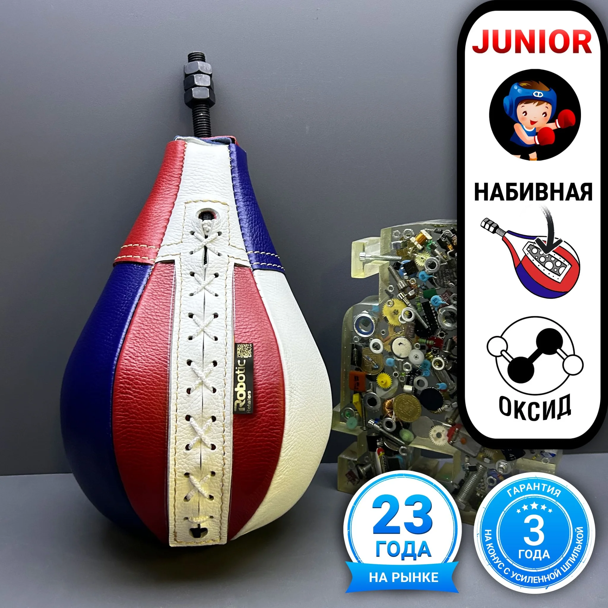 Новая груша для силомера «Boxer» - это мягкий кожаный чехол для безопасного удара, полиуретановый конус с оксидированной шпилькой класса прочности 12.9 для максимальной надёжности и влагостойкий наполнитель, который сохраняет форму груши, не допуская деформаций.