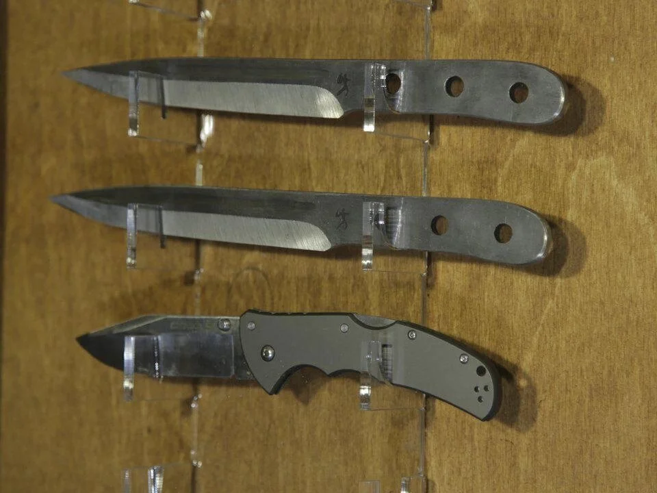 - Две подставки для ножей из оргстекла. Общее количество ножей для размещения в одной витрине - 28 шт. (168 ножей можно разместить во всем тире);