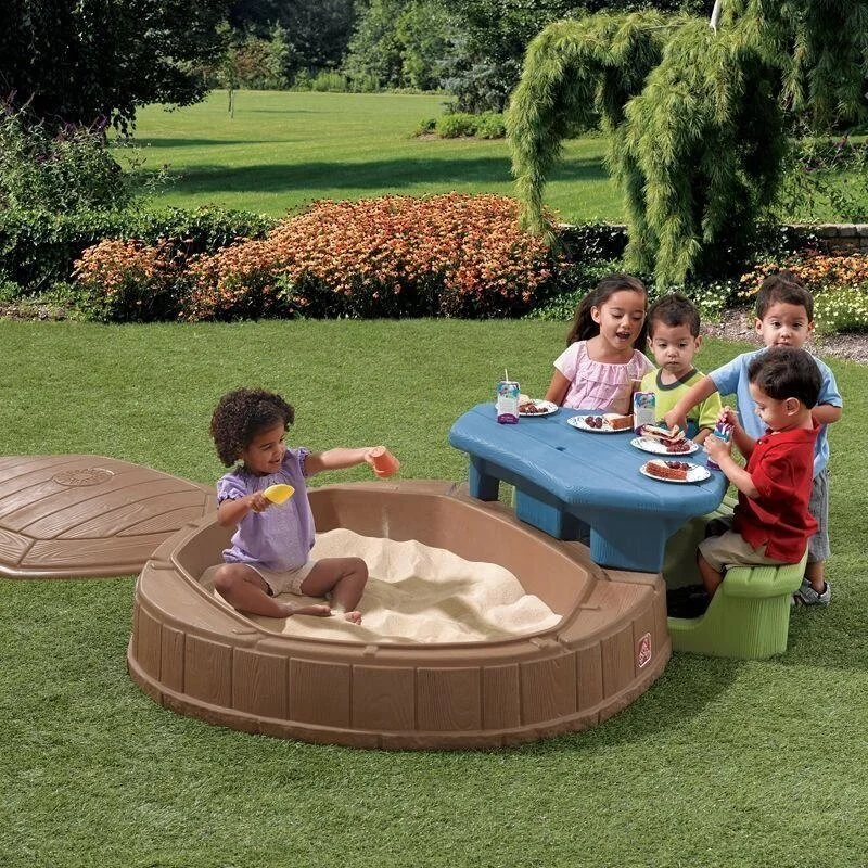 - Песочница обтекаемой безопасный формы без острых углов, со специальной крышкой, которая защищает содержимое от влияния погоды и попадания грязи;