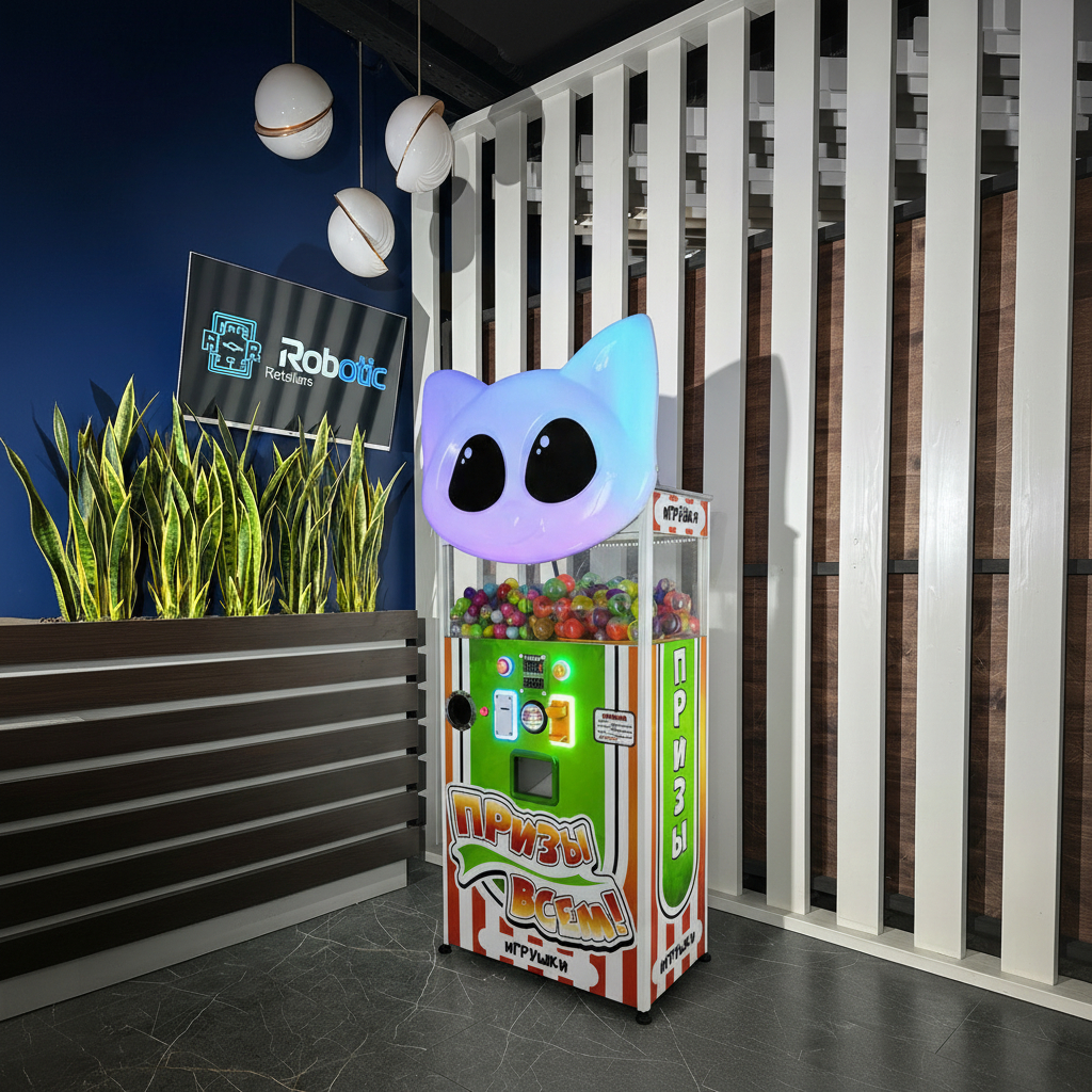 Симпатичный дизайн в виде милого Кота привлекает и детей и взрослых. Данный автомат предназначен для обмена стеклянных шариков Марблс 14 мм или Тикетов, на игрушки в капсулах двух видов.