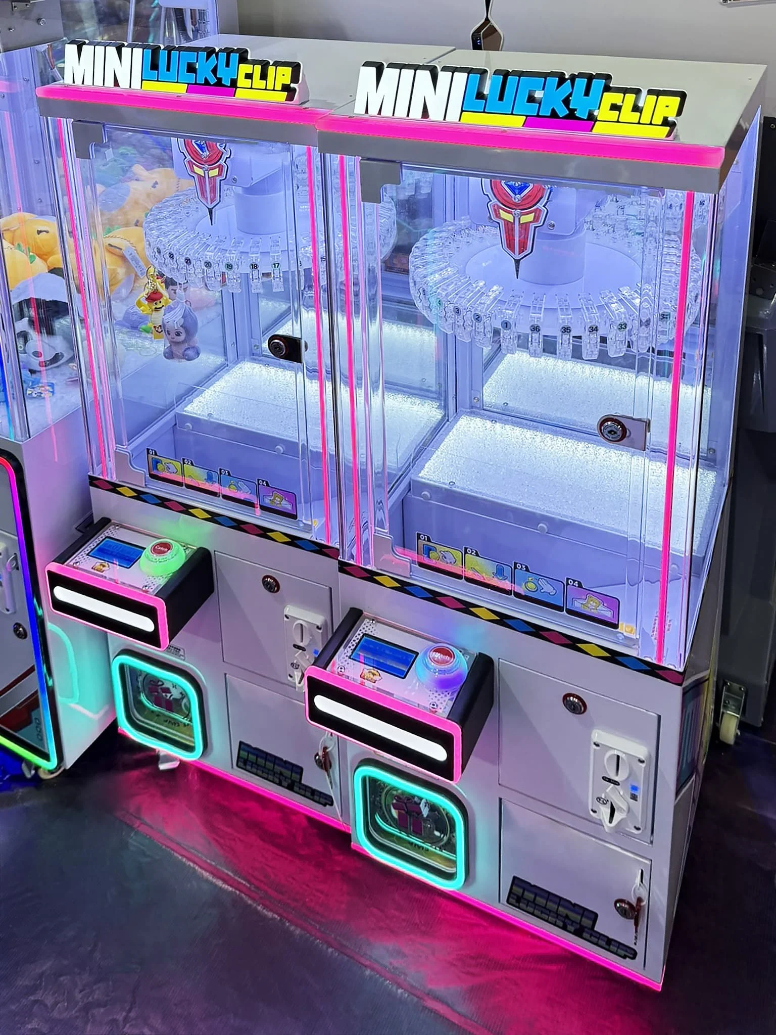 - Яркий и современный дизайн: Автомат выполнен в стиле футуристического гейм-центра с обилием неоновых огней. Прозрачный корпус позволяет видеть все происходящее внутри, а яркая надпись «MINI LUCKY CLIP» на верхней части привлекает внимание прохожих.