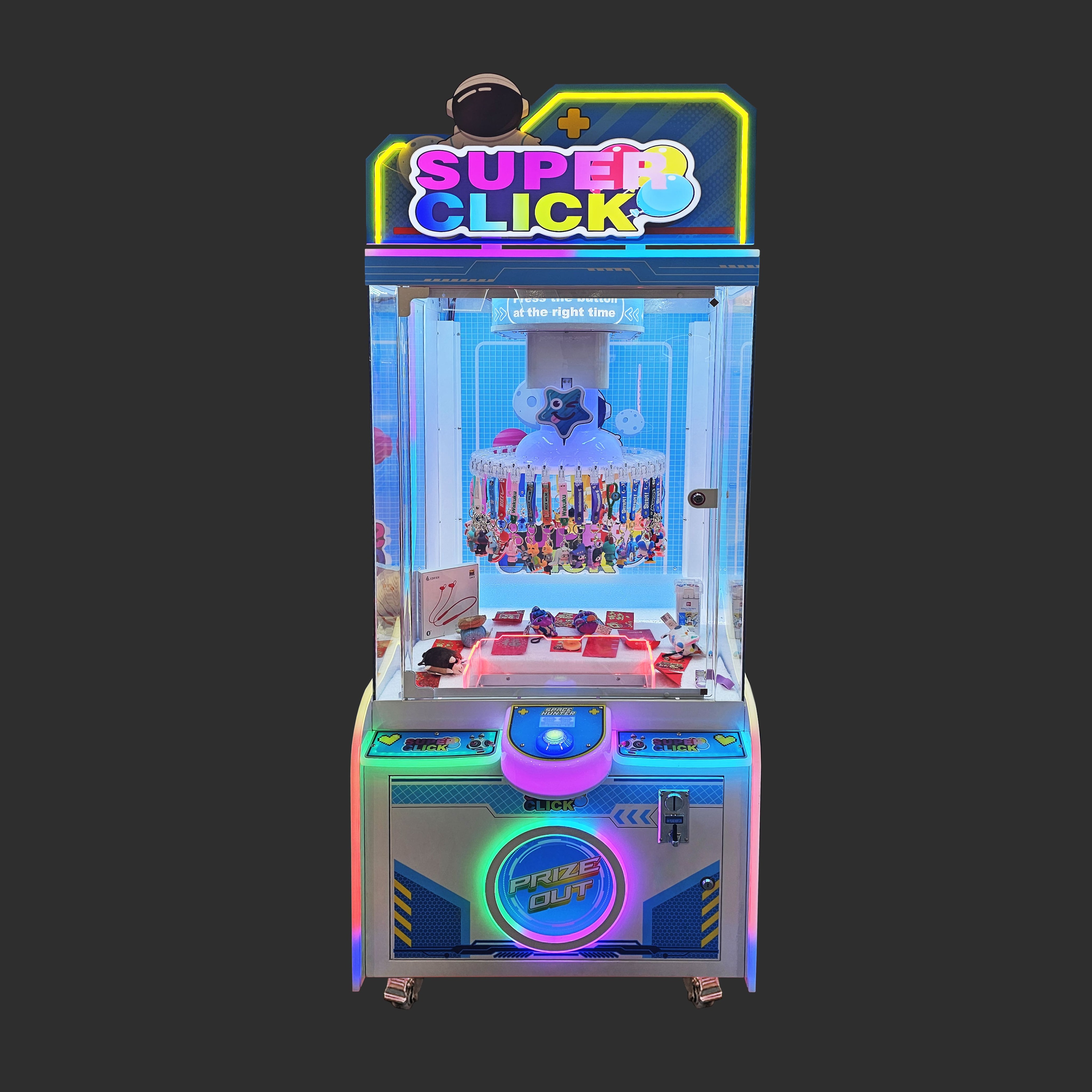 «Super Click» — стильный призовой автомат нового поколения, который мгновенно привлекает внимание игроков ярким дизайном и азартной механикой. Призы закреплены на специальных прищепках, а игроку нужно проявить точность и реакцию, чтобы освободить выбранный подарок в нужный момент.