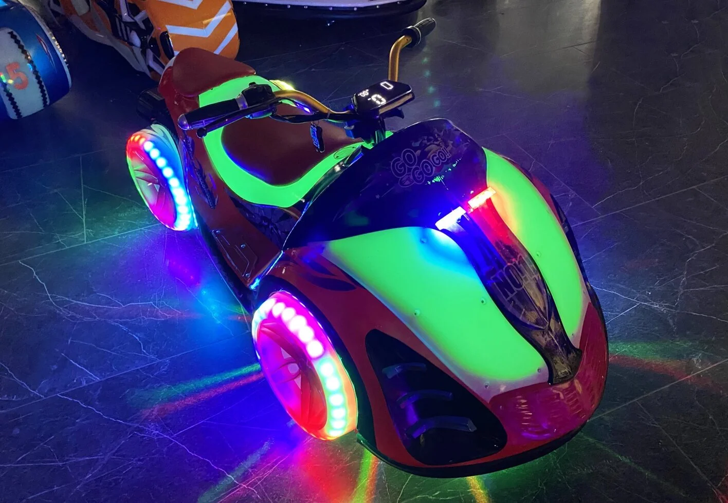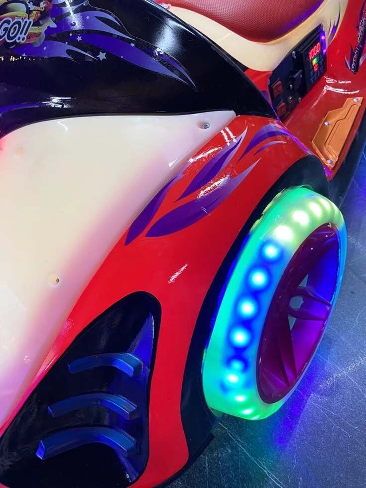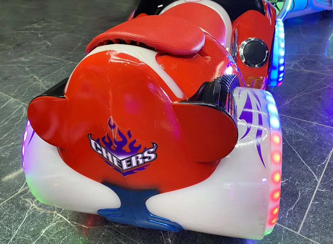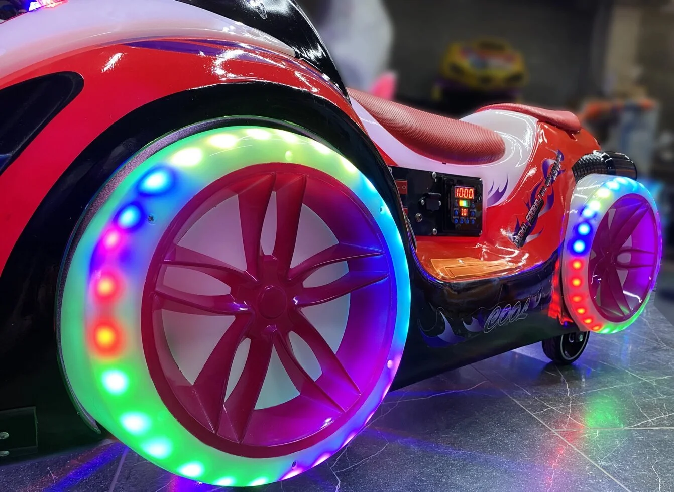 Электромобиль имеет форму фантастического байка. Он обязательно вызовет интерес всех вокруг своим ярким необычным внешним видом, музыкальным сопровождением и не останется незамеченным в любое время суток!