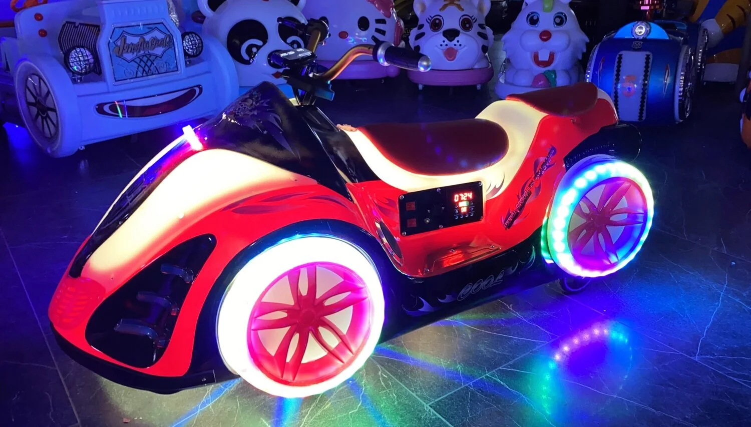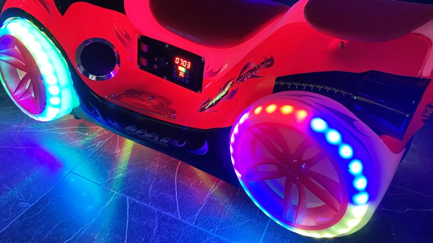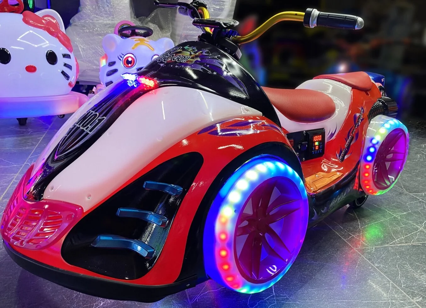 Электромобиль имеет форму фантастического байка. Он обязательно вызовет интерес всех вокруг своим ярким необычным внешним видом, музыкальным сопровождением и не останется незамеченным в любое время суток!