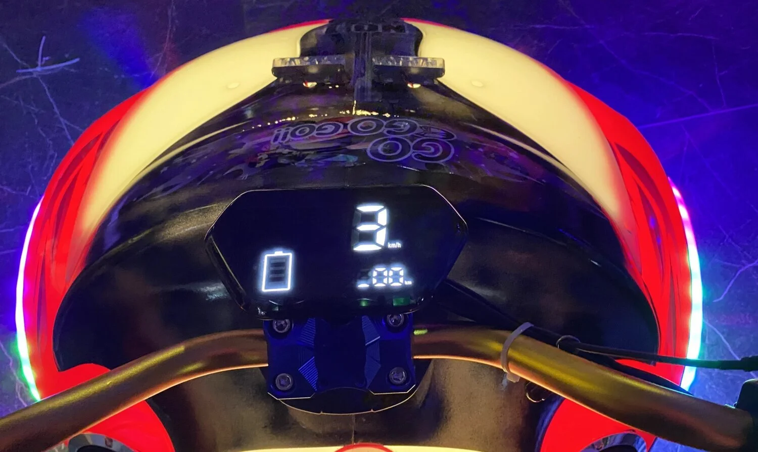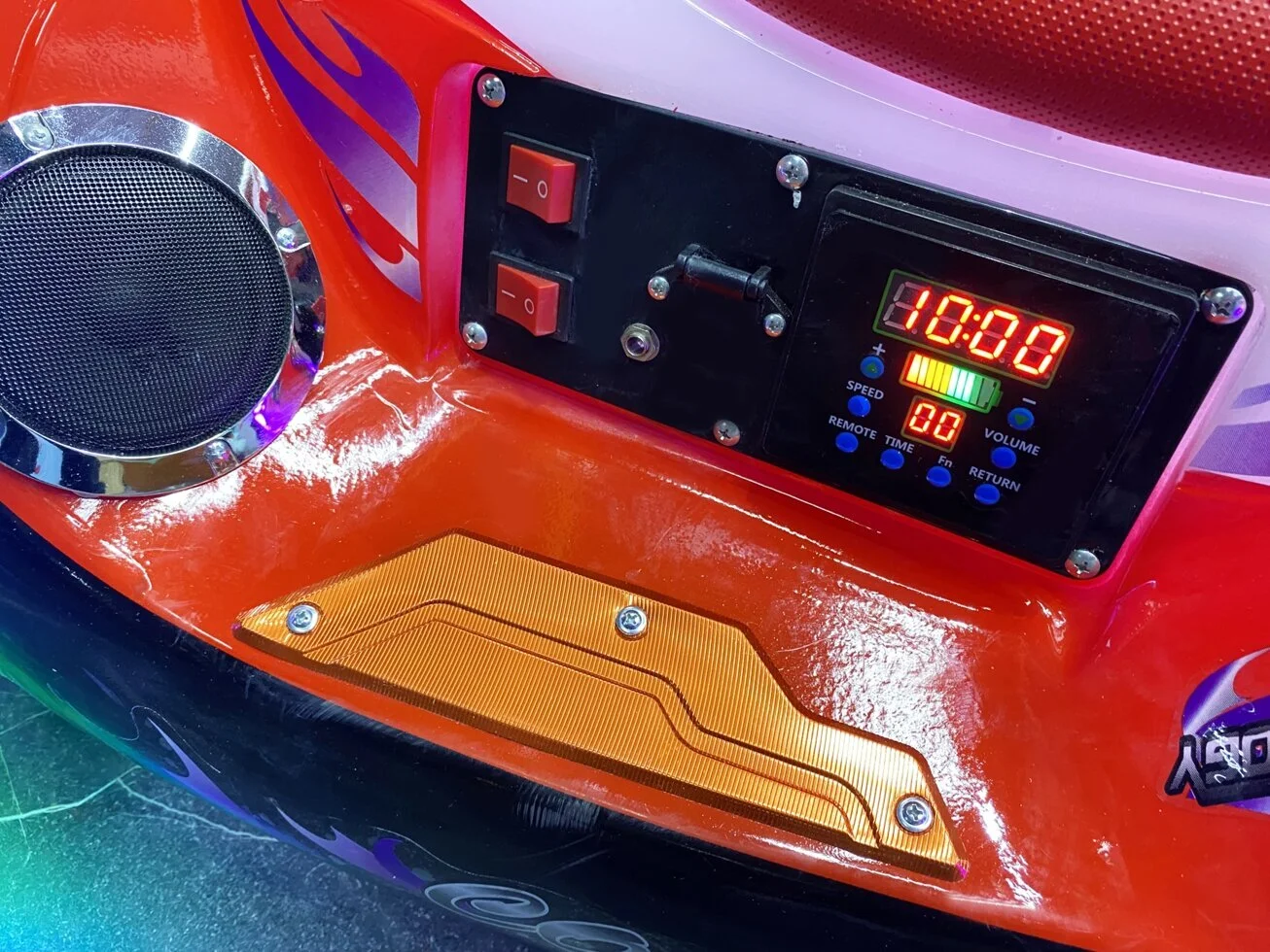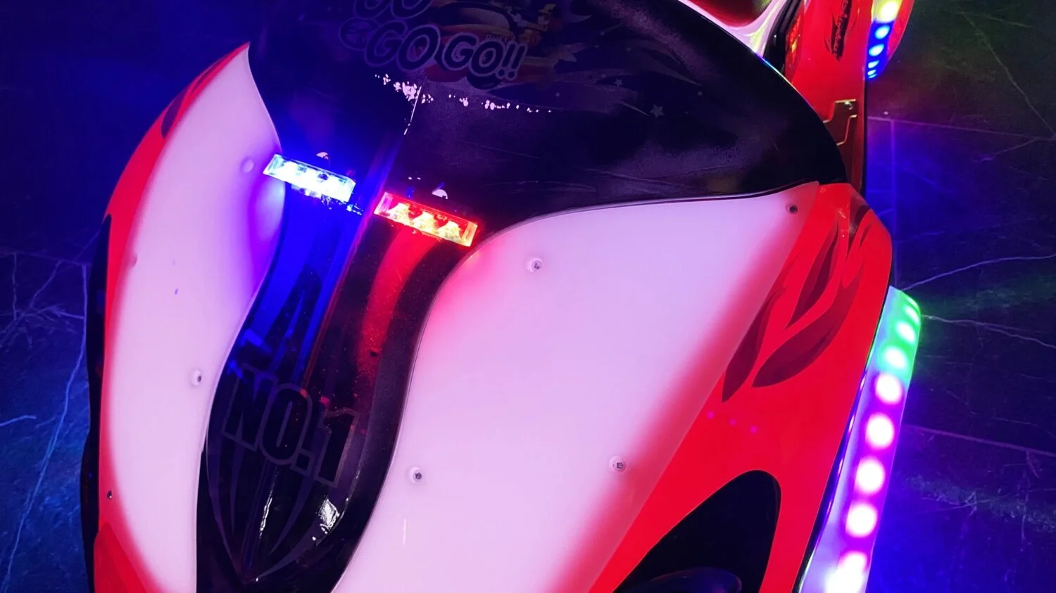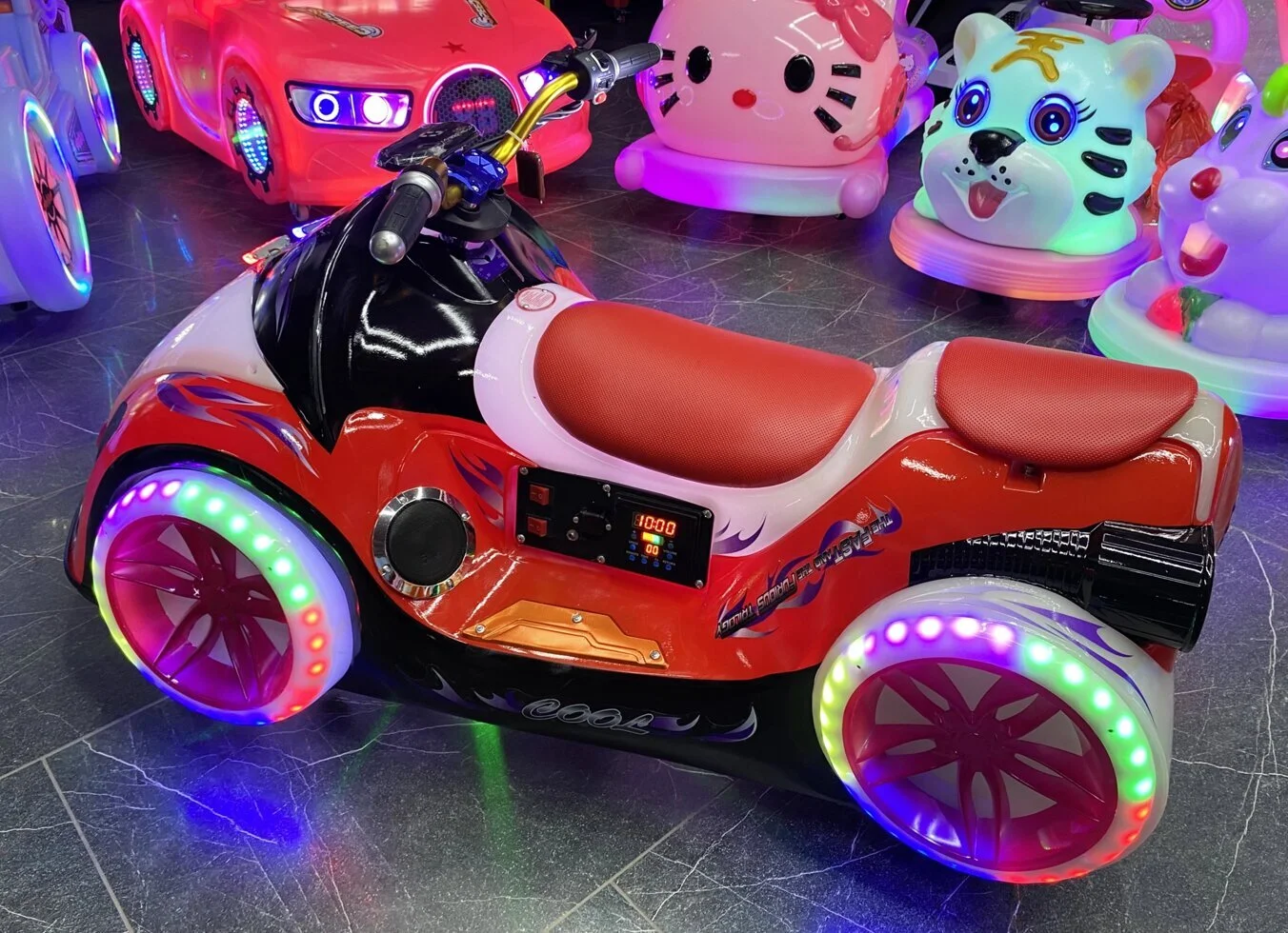Электромобиль имеет форму фантастического байка. Он обязательно вызовет интерес всех вокруг своим ярким необычным внешним видом, музыкальным сопровождением и не останется незамеченным в любое время суток!