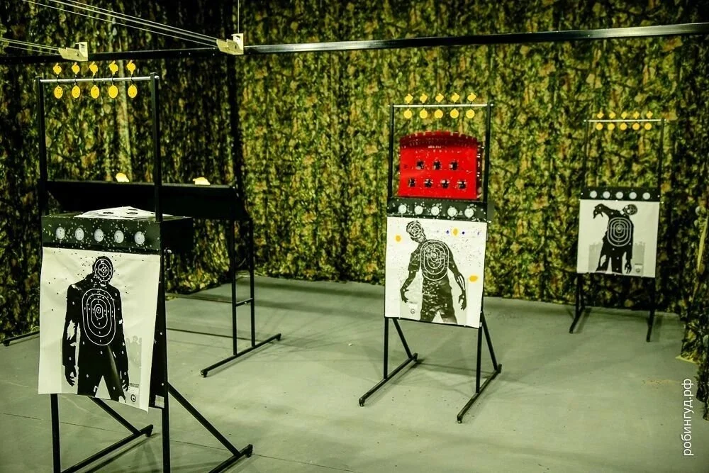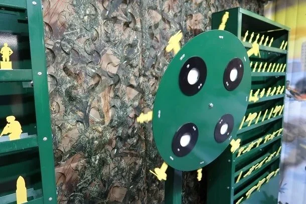 Можно повесить за мишенями. Промахи будут вязнуть в ткани.