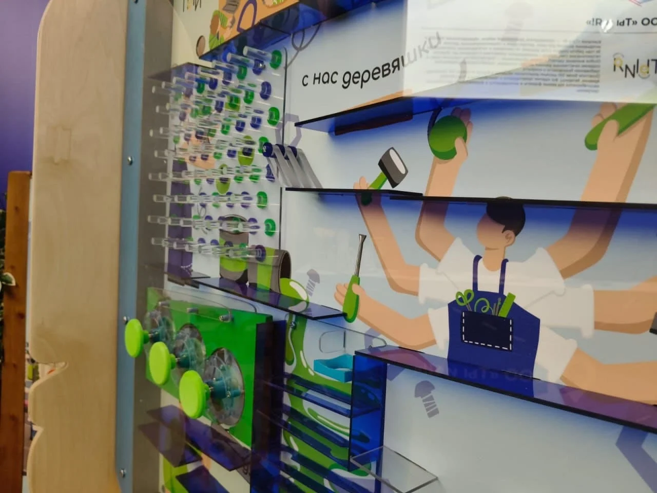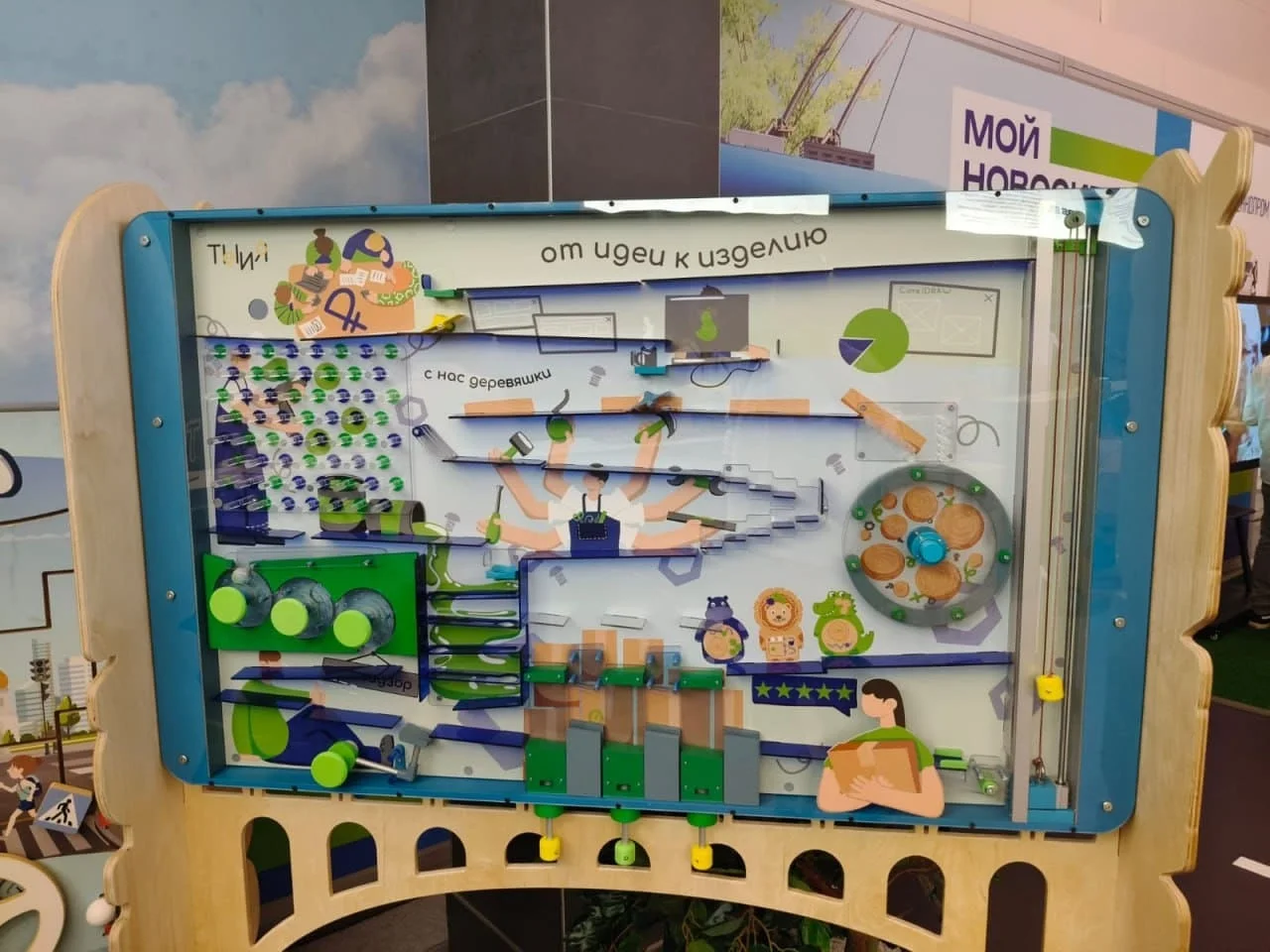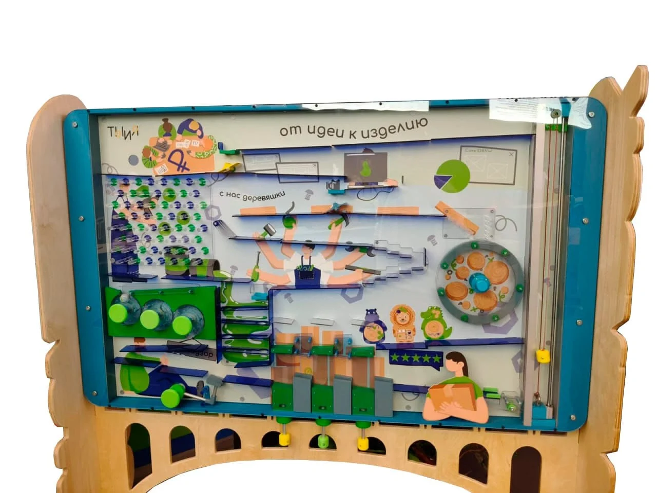 «Изобретатель» — это инновационный настенный игровой комплекс, который объединяет развлечение и развитие. Панель построена в формате шарикового лабиринта, где дети могут управлять движением шарика и наблюдать за его прохождением через различные препятствия.