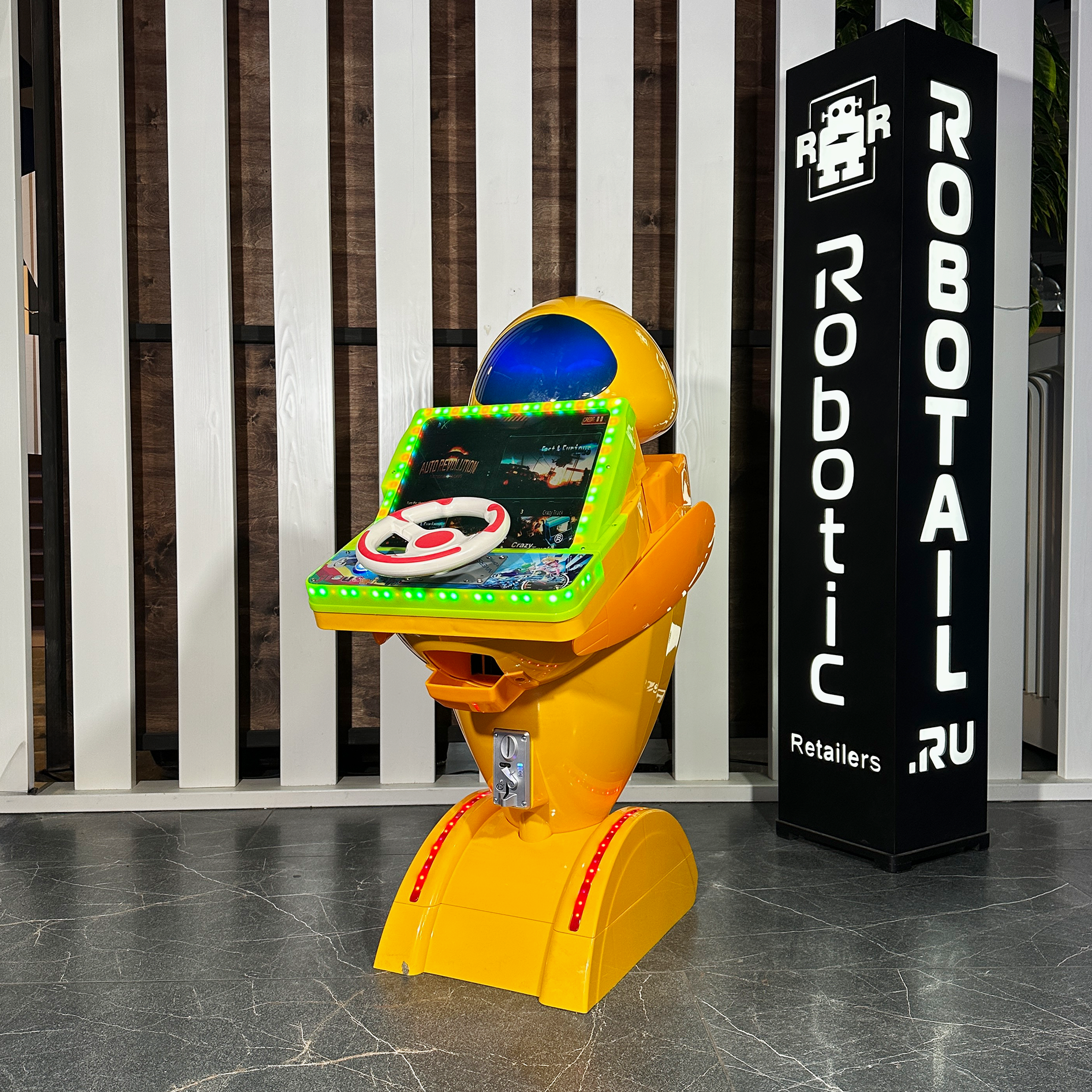 «Робогонка» — яркий и увлекательный детский игровой автомат в виде дружелюбного робота. Светящиеся глаза, анимация и стильный дизайн привлекают внимание детей, а 5 гоночных игр дарят массу эмоций и драйва. Ребенок садится за руль и управляет машинкой, проходя трассы и зарабатывая призы.