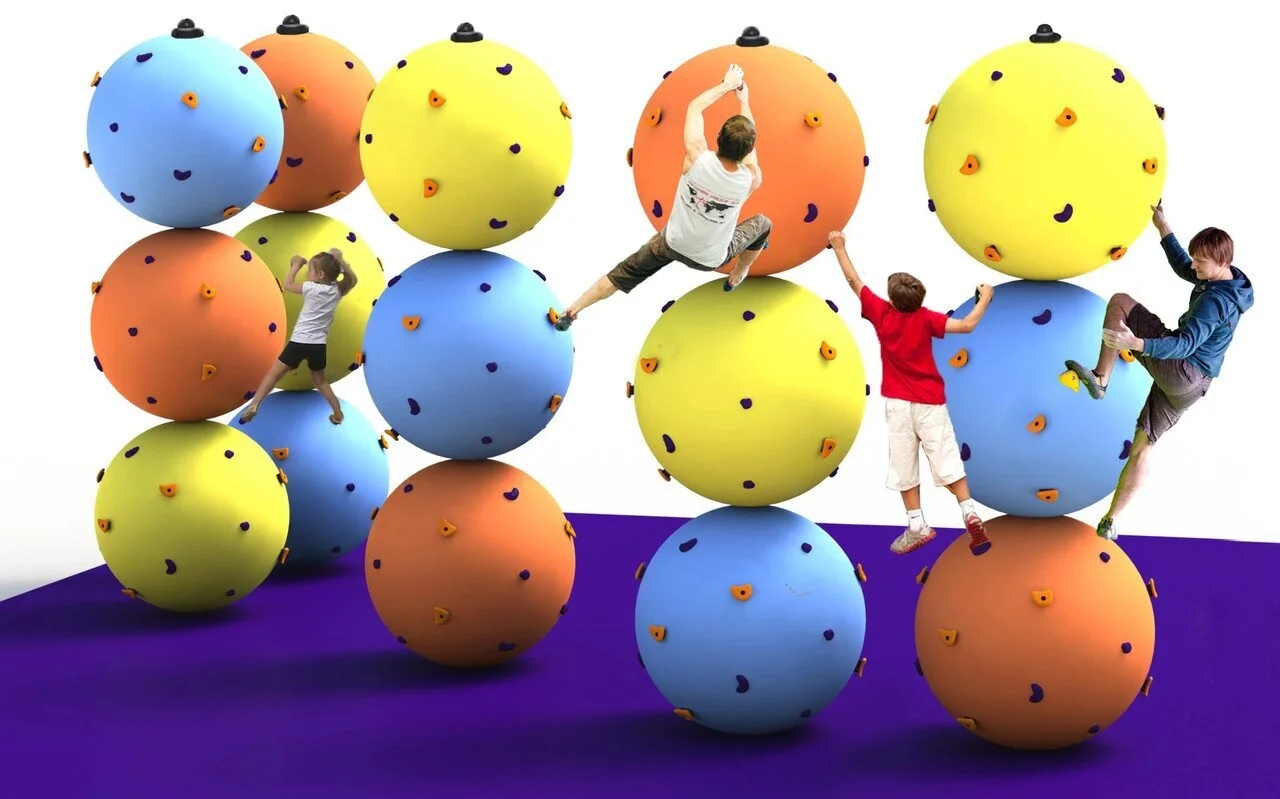 Скалодром в виде столба из трех шаров – это оригинальный и очень интересный элемент детских площадок. Шаровые столбы-скалодромы выполнены в рамках концепции конструктора цвета собираются из отдельный элементах в 8 различных цветах. Шаровые столбы можно ставить близко друг от друга и немного варьировать по высоте, чтобы получались интересные композиции. На каждый шар внизу надо ставить проставку от прокручивания. Сверху на столбе необходимо установить хомут на трубу 108 мм, им шары прижимаются друг к другу, по мере эксплуатации возникает усадка и хомут надо в первое время понемногу сдвигать вниз. Зоны безопасности вокруг каждого шарового столба-скалодрома 1 м, но зоны соседних скалодромов могут перекрываться и соседний скалодром может частично находиться в зоне безопасности. При создании комплекса из нескольких скалодромов расстояние между ними можно делать от 60 см до 100 см.