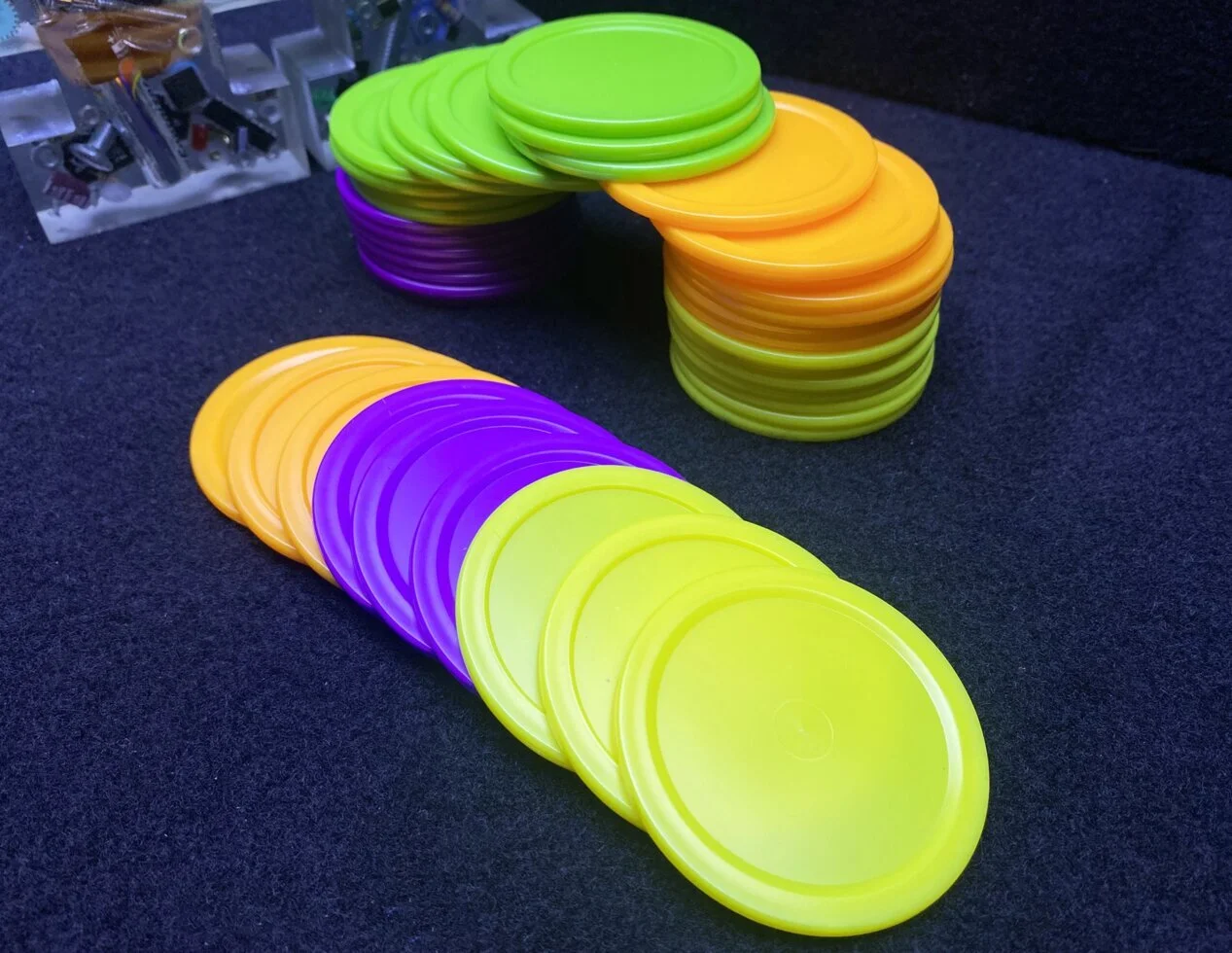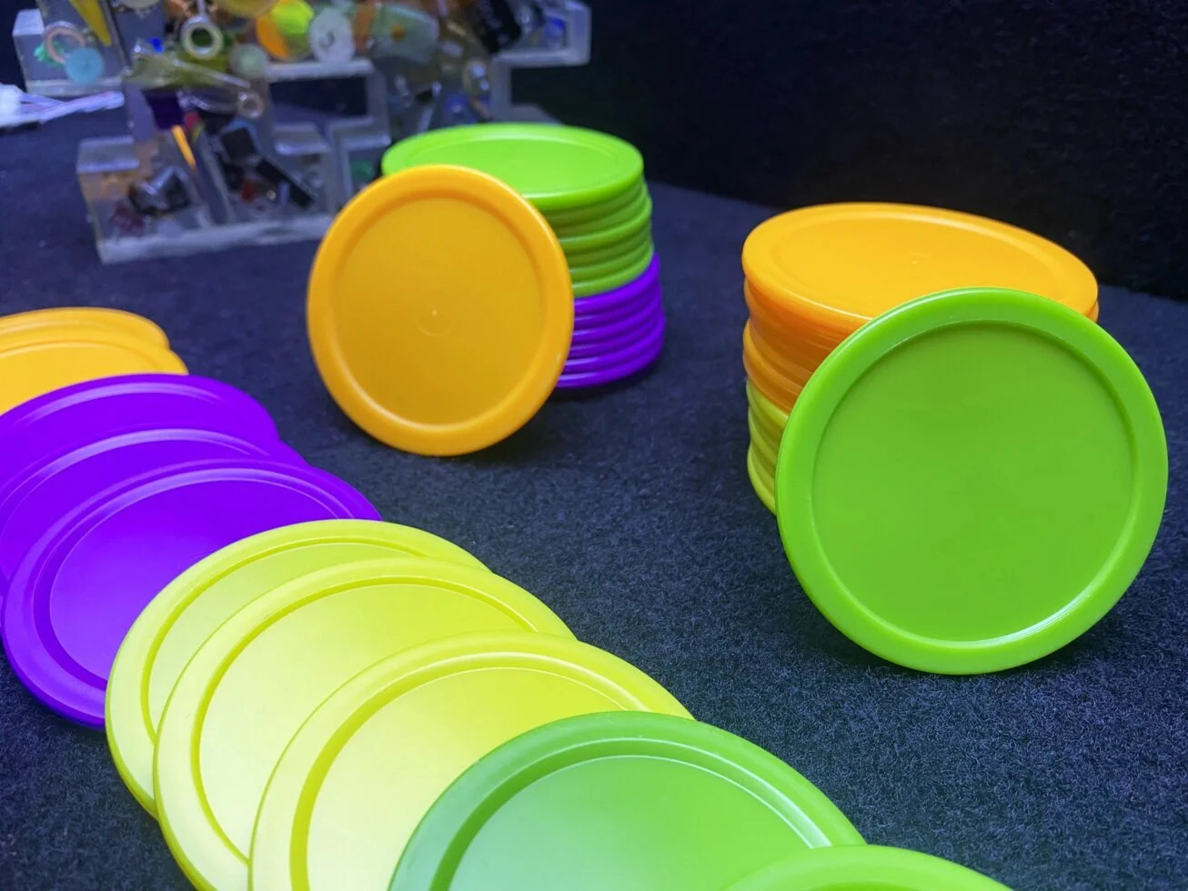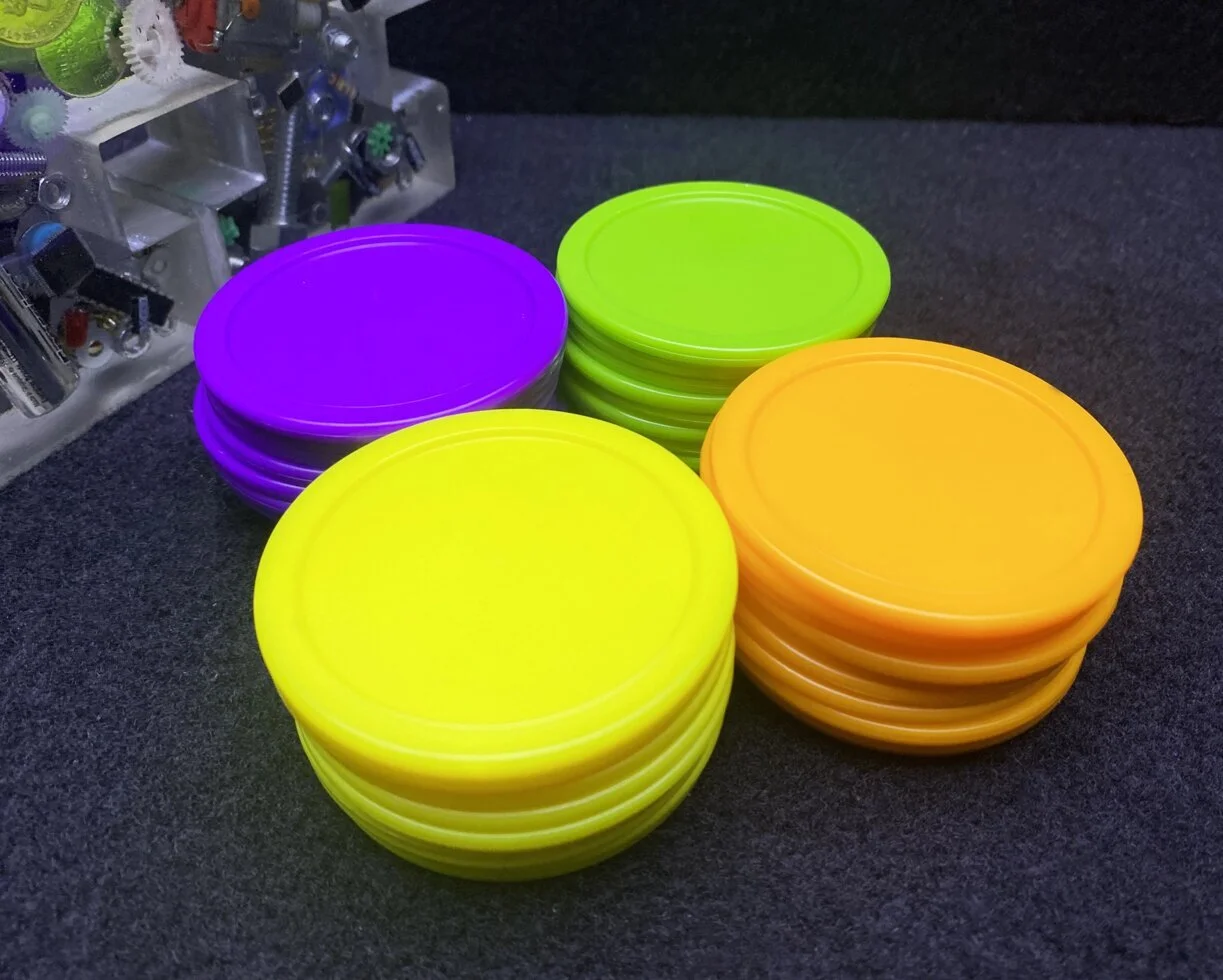 Шайбы изготовленные из ударопрочного пластика ярких цветов, отлично подойдут для коммерческих аэрохоккеев, а также их можно использовать для домашних столов.