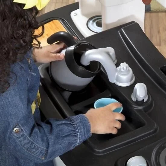 Захотелось сделать перерыв и «подзарядиться»? Сделайте себе чашечку «кофе» c помощью кофеварки. Духовку и плиту можно включить одним легким движением руки. Забавные звуковые эффекты и подсветка во время работы плитки добавят радости детям и ощущения присутствия на настоящей маминой кухне. Столешница стилизованная «под гранит», реалистичные холодильник и микроволновая печь сделают игру еще интереснее. «Окошко» располагает детей к общению, позволяя совершенствовать социальные навыки.