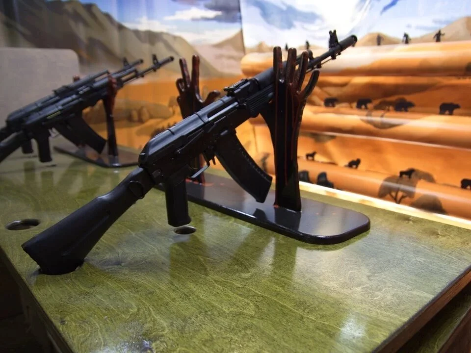 Стол для размещения оружия (фанерный каркас, подставки из фанеры, лак корабельный, антивандальное оргстекло, электро светильники - керосиновые лампы, банер -фон для призов) В комплекте подставки под оружие (руки зомби)