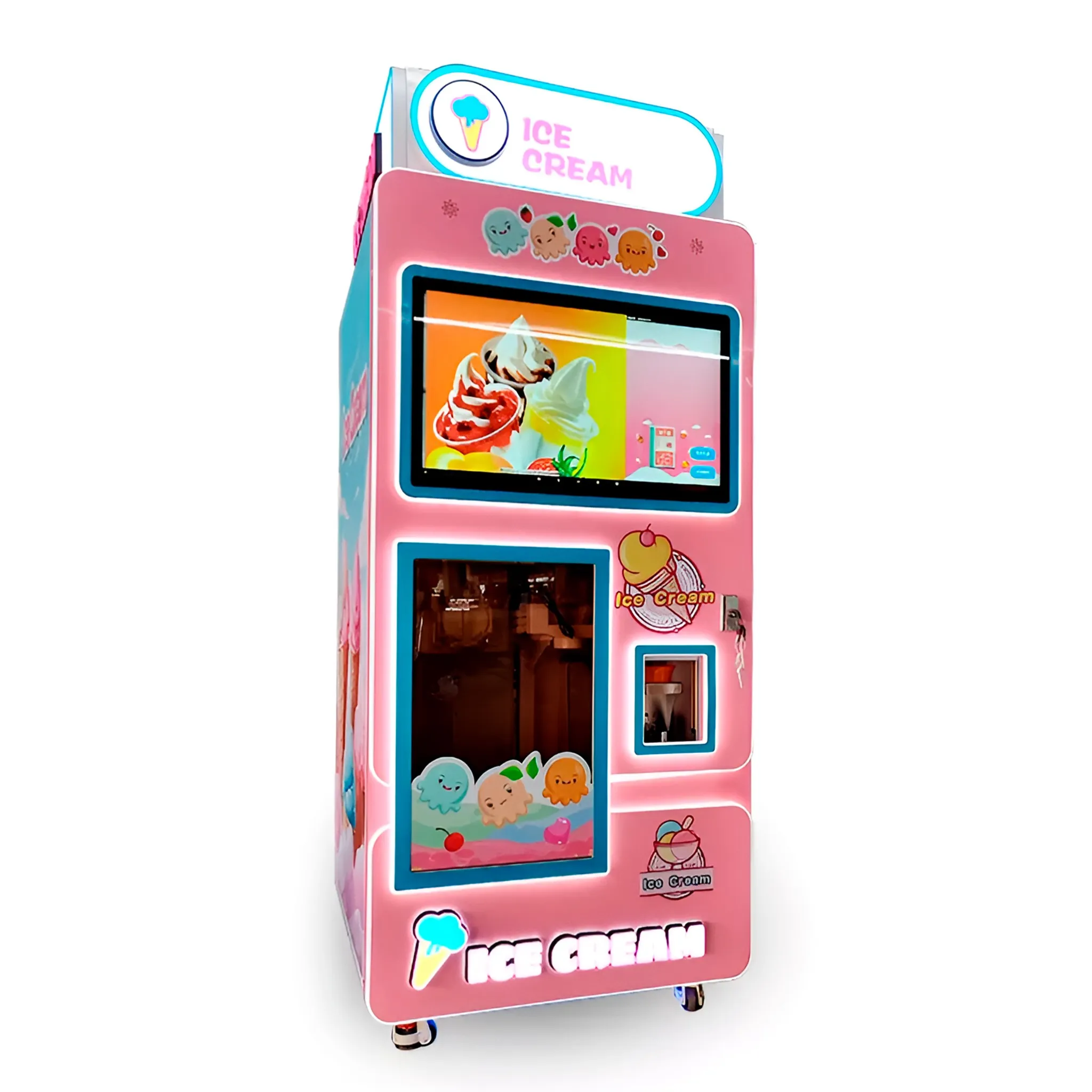 Вендинговый автомат мороженого «SweetChill» - это полностью автоматизированный вендинговый автомат для продажи мягкого мороженого. Стильный дизайн с мультяшными элементами, большая витрина и экран на 32 дюйма делают его не только точкой продаж, но и элементом визуального вовлечения. Аппарат может готовить до 100 порций без дозаправки, обслуживать покупателей 24/7 и работать без оператора. Устройство идеально подходит для установки в ТЦ, детских зонах, кинотеатрах, на набережных и в фуд-кортах.